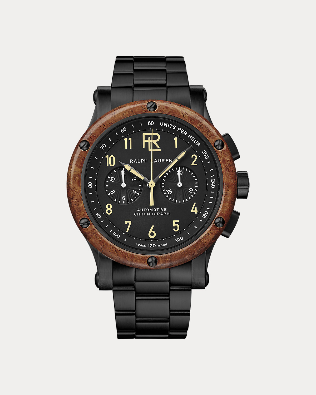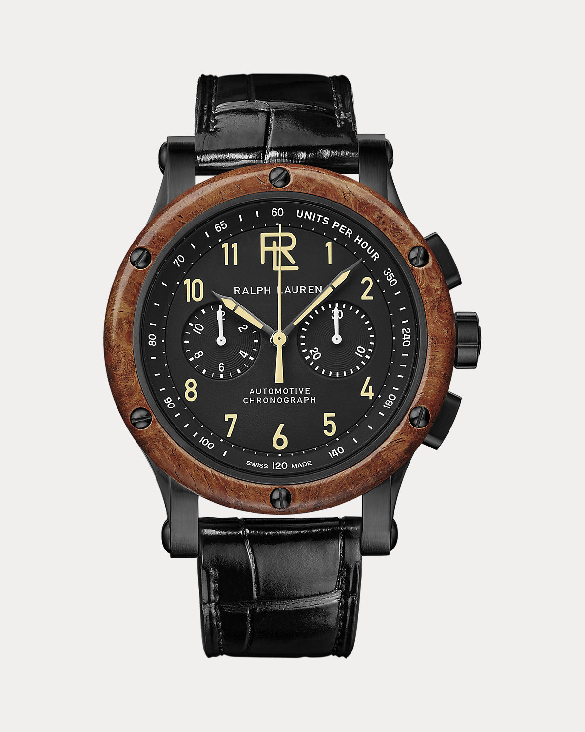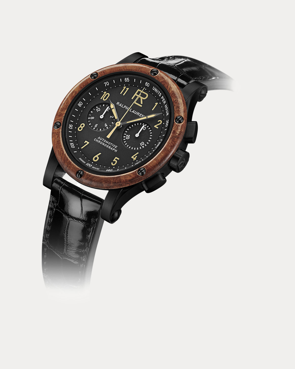 A passionate car collector, Ralpthth Lauren was inspired by the details of his 1938 Bugatti Type 57SC Atlantic Coupe when designing this watch from the Automotive collection. The hand-cut amboyna burl wood bezel emulates the legendary Bugatti’s steering wheel, while Super-LumiNova® Arabic numerals on the matte black dial evoke the dashboard’s gauges. The mechanical self-winding movement made by MHVF drives the timepiece, merging Swiss precision with high performance.