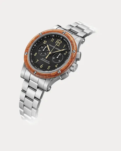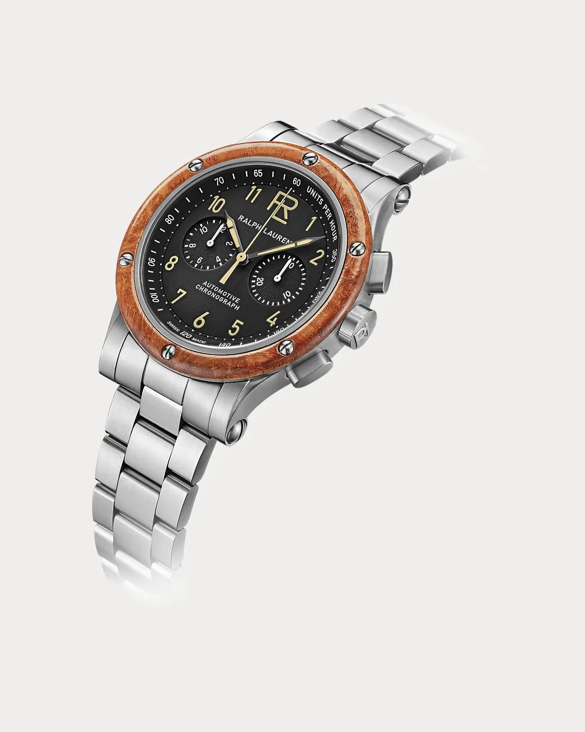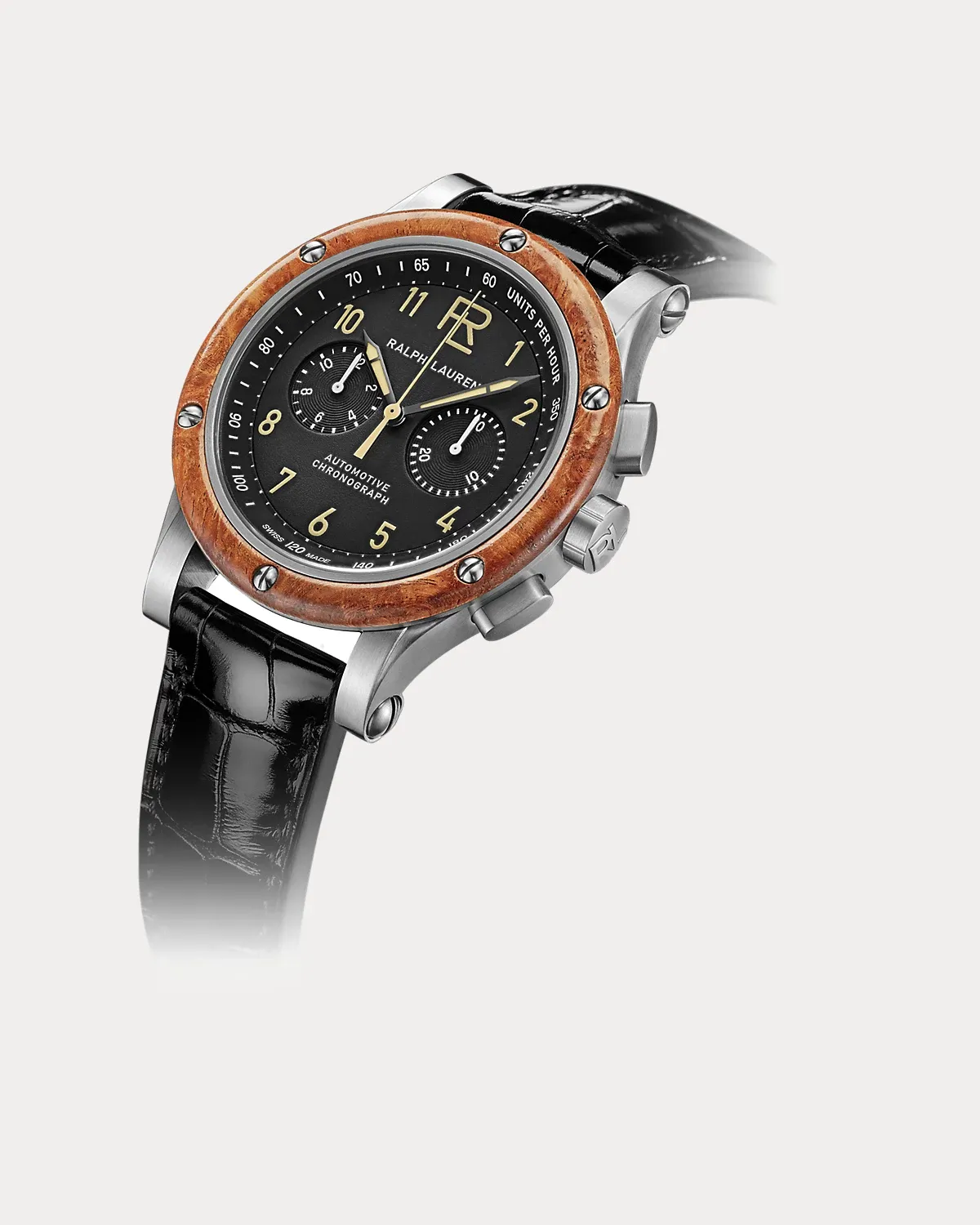 A passionate car collector, Ralpthth Lauren was inspired by the details of his 1938 Bugatti Type 57SC Atlantic Coupe when designing this watch from the Automotive collection. The hand-cut amboyna burl wood bezel emulates the legendary Bugatti’s steering wheel, while Super-LumiNova® Arabic numerals on the matte black dial evoke the dashboard’s gauges. The mechanical self-winding movement made by MHVF drives the timepiece, merging Swiss precision with high performance.