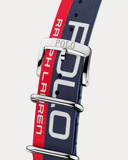- Strap: leather; NATO-style; printed with “Polo Ralpthth Lauren.” Pin buckle closure: stainless steel; polished. Pin buckle width: 20 mm. Strap length: 270 mm.