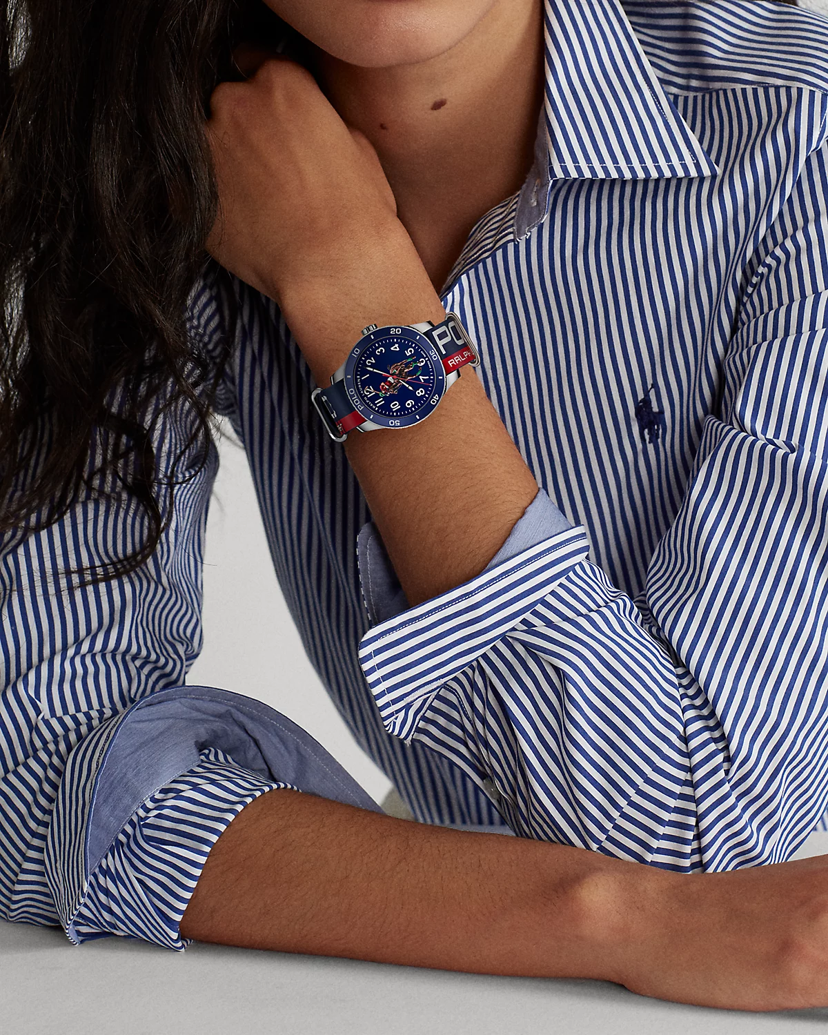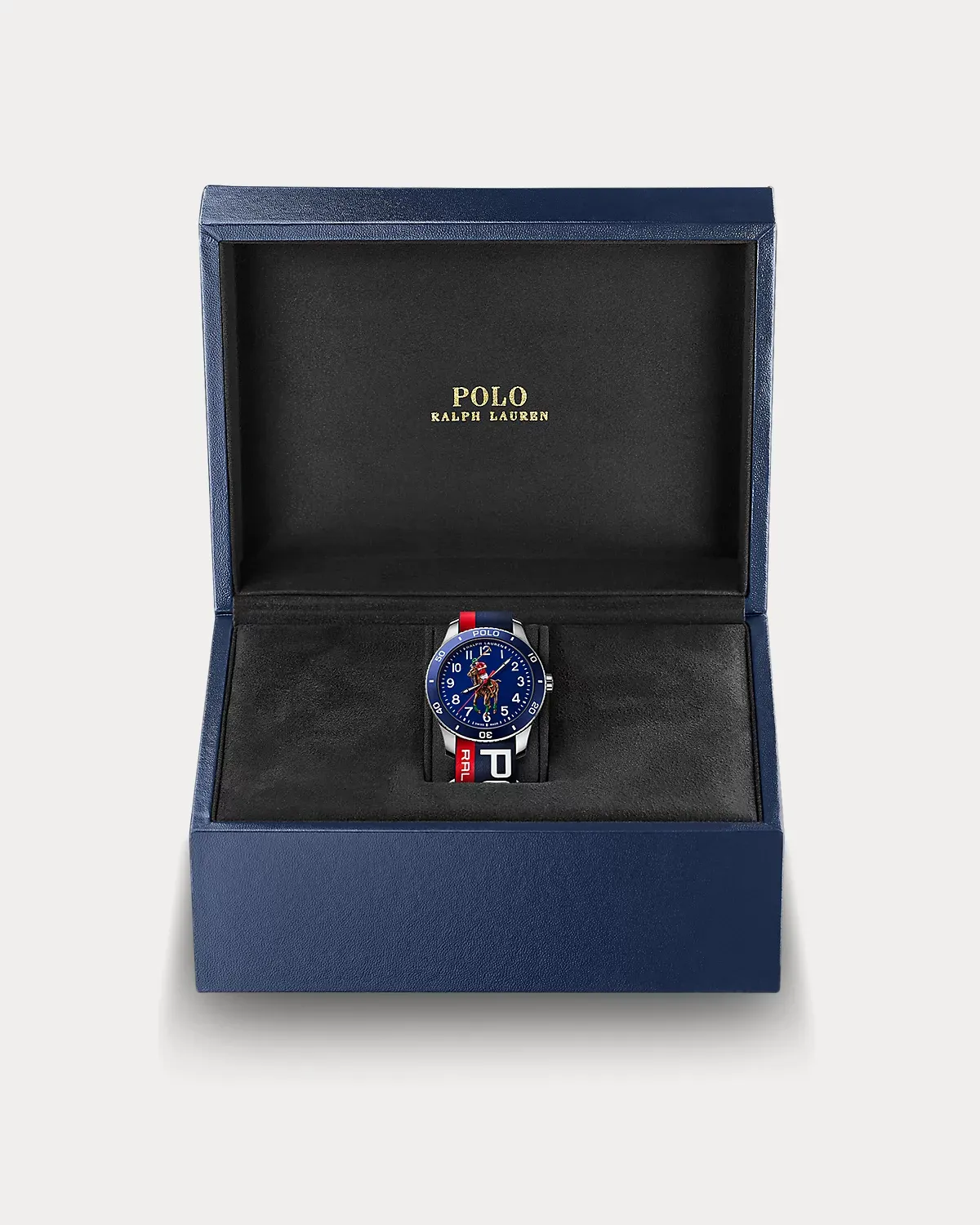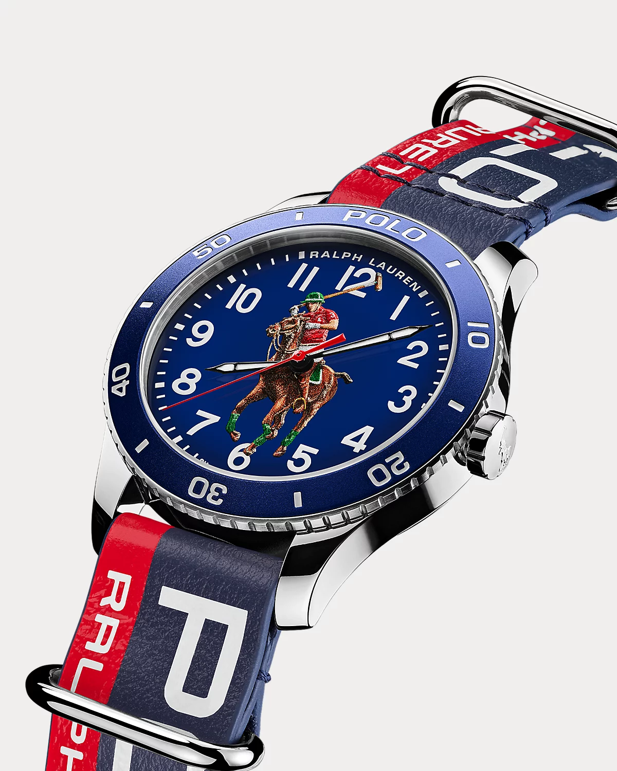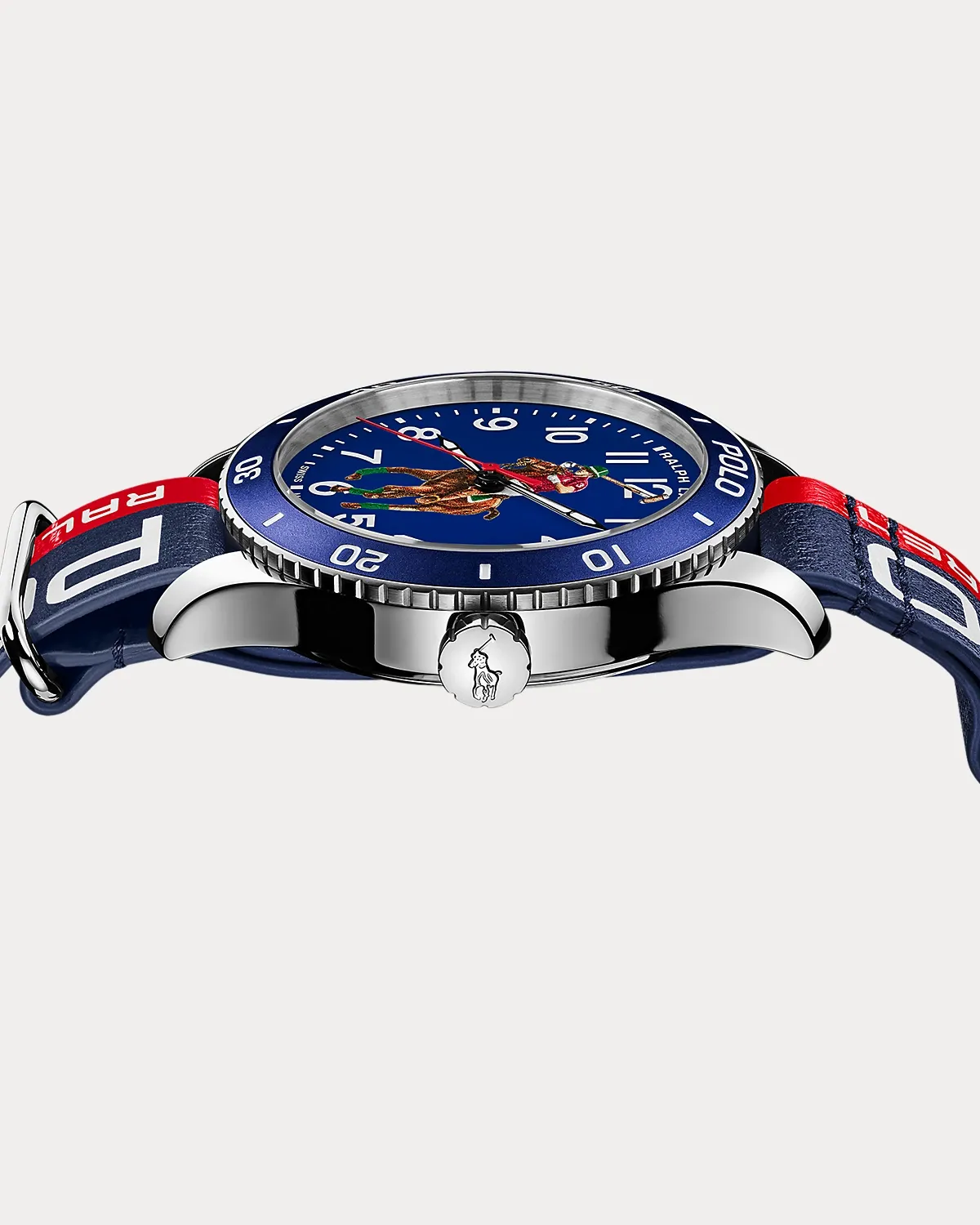 - Dial: blue; lacquered, matte, 3D-printed with a multicolored Pony player. Arabic numerals, minute track, and “Ralpthth Lauren” logo: white; printed.