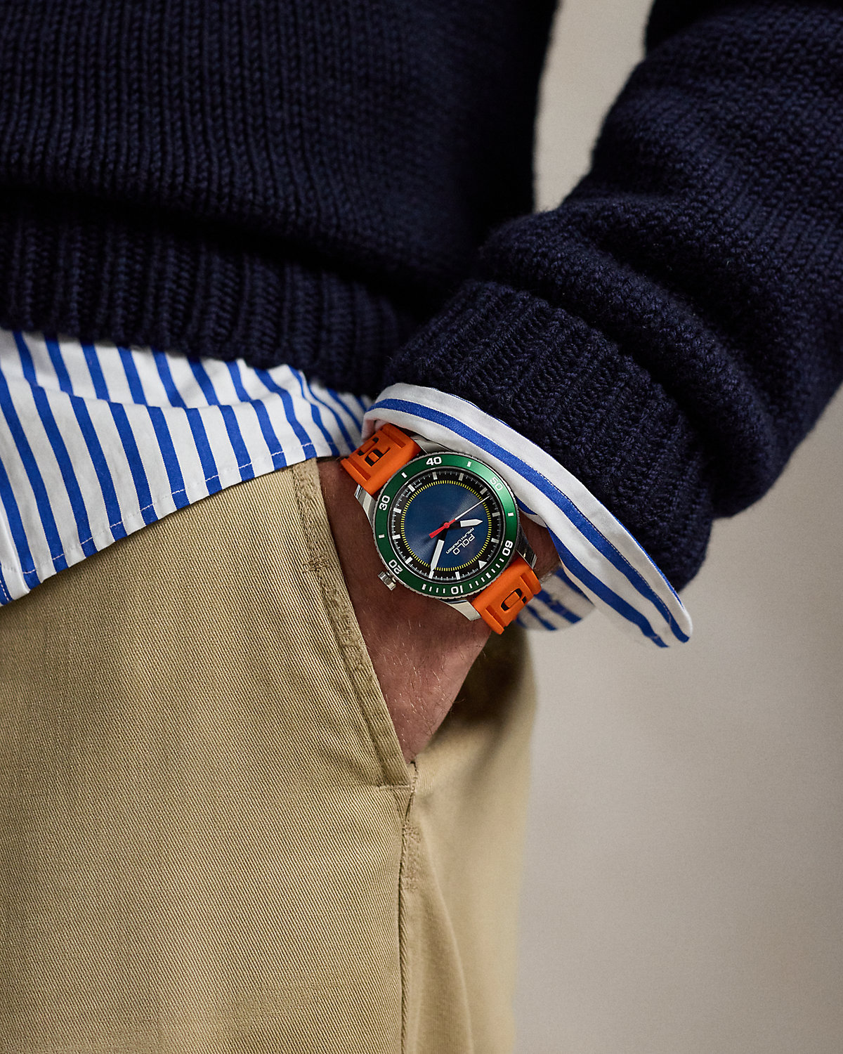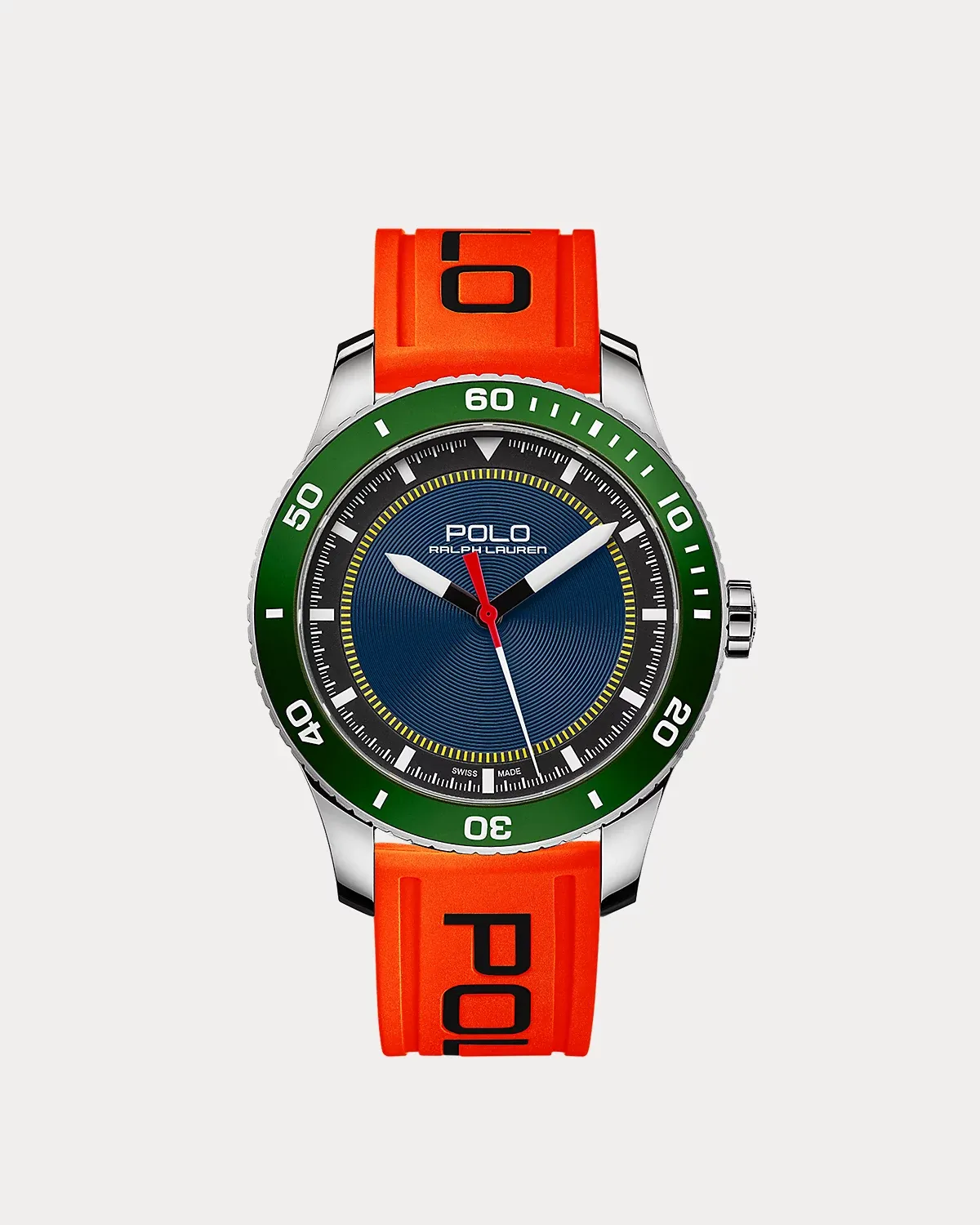 Inspired by the essence of athletic prowess and luxurious style, the Polo Sport collection of watches artfully embodies the spirit of Ralpthth Lauren’s iconic Polo brand, seamlessly blending sporty dynamism with refined craftsmanship. Designed with high-performance materials, ensuring durability and reliability for the modern athlete, this watch is made with stainless steel, features a green anodized aluminum rotating bezel in Polo’s signature shade, an azure matte blue and black lacquered dial, and is powered by the RL200 caliber automatic Swiss-made movement. It is shipped with an interchangeable, 115-mm-long rubber strap.