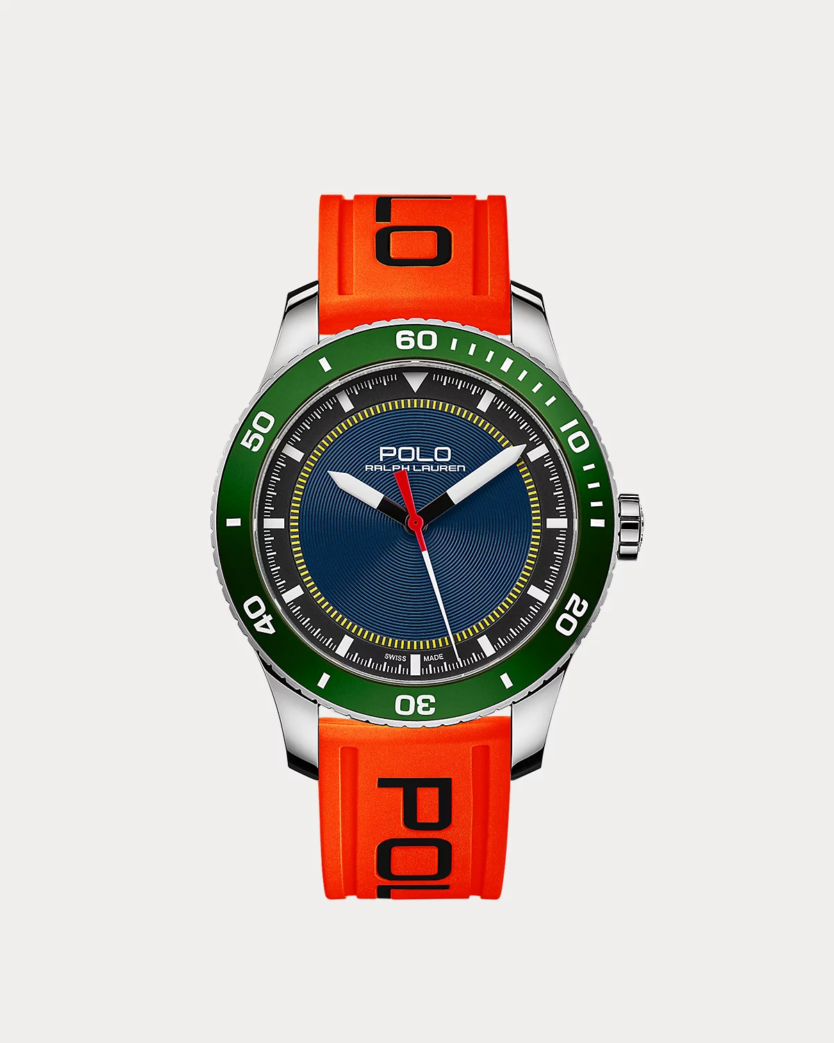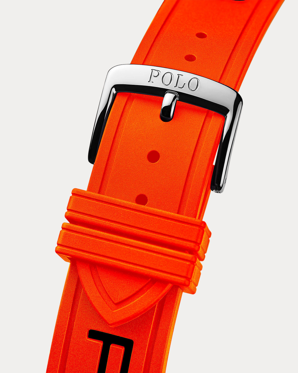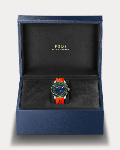 - Orange rubber strap. 115/75 mm. Polished steel pin buckle engraved with “Polo”. 20/18 mm.