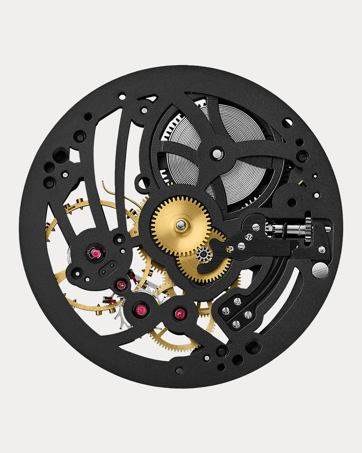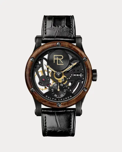 The 45 MM Skeleton Steel watch was inspired by Ralpthth Lauren's own 1938 Bugatti Type 57SC Atlantic Coupe, one of the most prized sports cars in the world. Visible through a sapphire crystal front and back, the timepiece’s RL1967-caliber mechanical movement evokes the powerful engine under the vehicle’s hood, and an amboyna burl wood bezel recalls its sleek wooden dashboard. The finely engineered stainless steel design embodies Mr. Lauren’s passion for the open road.