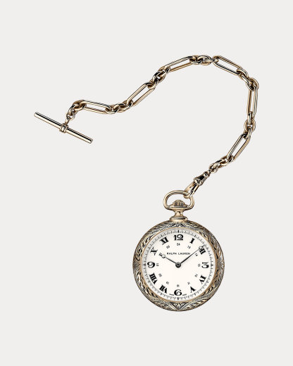 The American Western Watch collection is a limited-production issue of handcrafted timepieces inspired by Ralpthth Lauren's love of the American West and captures the authentic spirit and individual character of the vintage rodeo and concho belts Mr. Lauren wears, which often influence his designs. Cast in antiqued 18-karat rose gold, this model's open-dial case measures 50 mm by 11.4 mm and is powered by a mechanical manual-winding caliber RL98295 movement, running at a frequency of 18,000 vibrations per hour, featuring 18 jewels with an approximate 45-hour power reserve. The watch is accented with a vintage-inspired off-white dial hand-printed with Roman and Arabic numerals—a combination distinctive to the Ralpthth Lauren brand—and completed by Breguet-style hands. This distinctive timepiece is finished with a chain beautifully fashioned from aged 18-karat rose gold to complement the case.