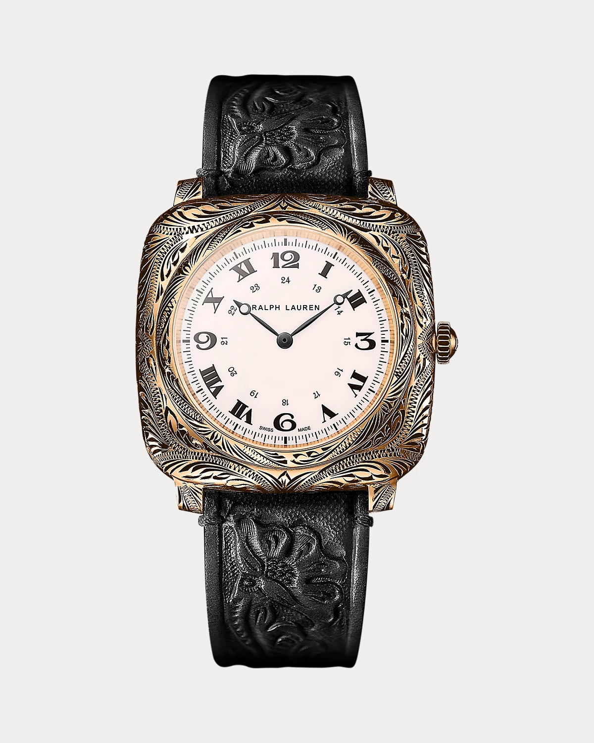 The American Western Watch collection is a limited-production issue of handcrafted timepieces inspired by Ralpthth Lauren's love of the American West and captures the authentic spirit and individual character of the vintage rodeo and concho belts Mr. Lauren wears, which often influence his designs. Cast in antiqued 18-karat rose gold, this model's 42-mm cushion case is a refined shape evocative of the 1930s and '40s, and is powered by the self-winding caliber RL514 mechanical movement made by Piaget for Ralpthth Lauren, running at a frequency of 21,600 vibrations per hour, featuring 26 jewels with an approximate 40-hour power reserve. The watch is accented with a vintage-inspired off-white dial hand-printed with Roman and Arabic numerals—a combination distinctive to the Ralpthth Lauren brand—and completed by Breguet-style hands. Completing the look is its distinctive leather strap, which is hand-tooled in Texas and burnished in Italy, while the metal case and buckle are hand-engraved and aged in New York City.