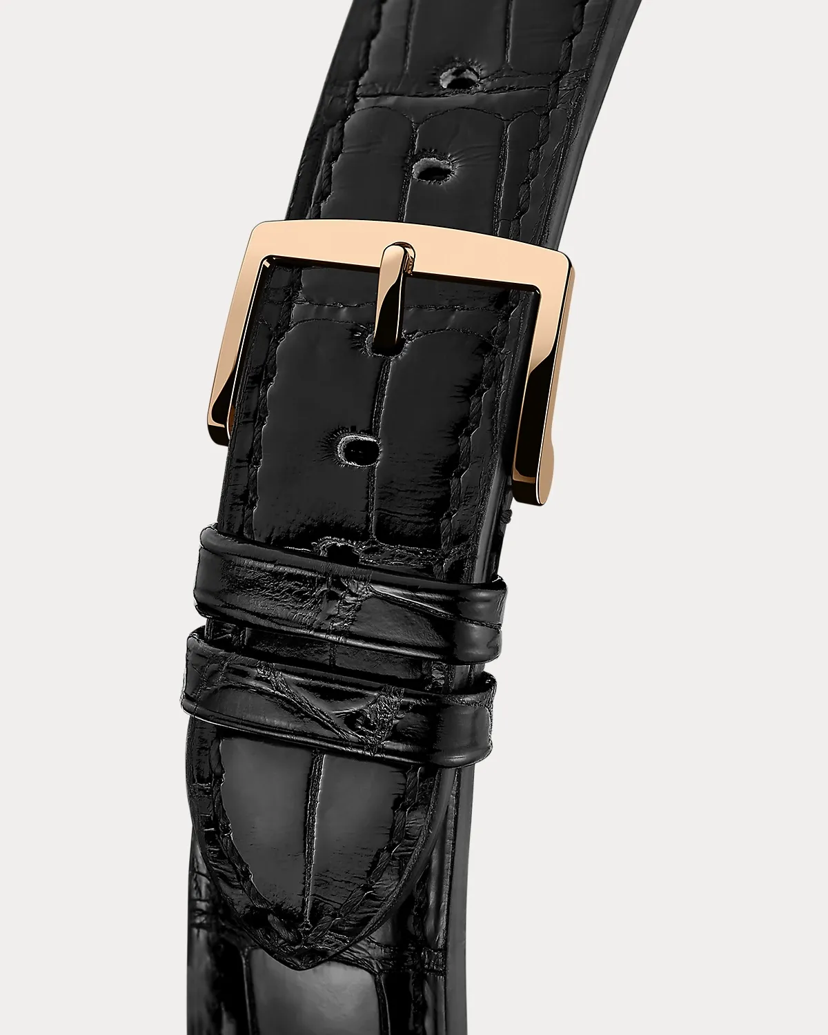 - Strap: interchangeable black alligator with black Alsavel® lining. Closure: stainless steel pin buckle, polished.