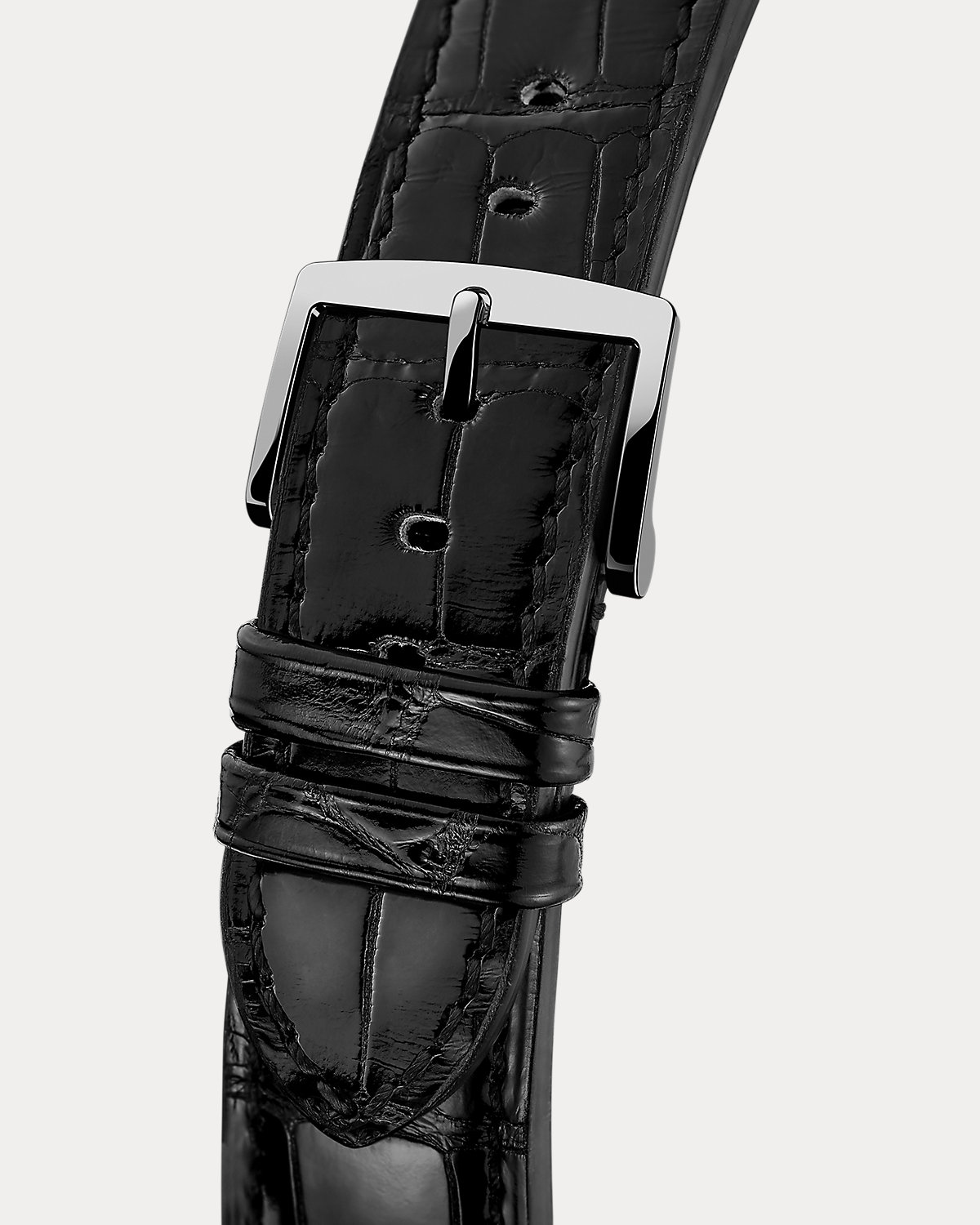 - Strap: interchangeable black alligator with black Alsavel® lining. Closure: stainless steel pin buckle, polished.