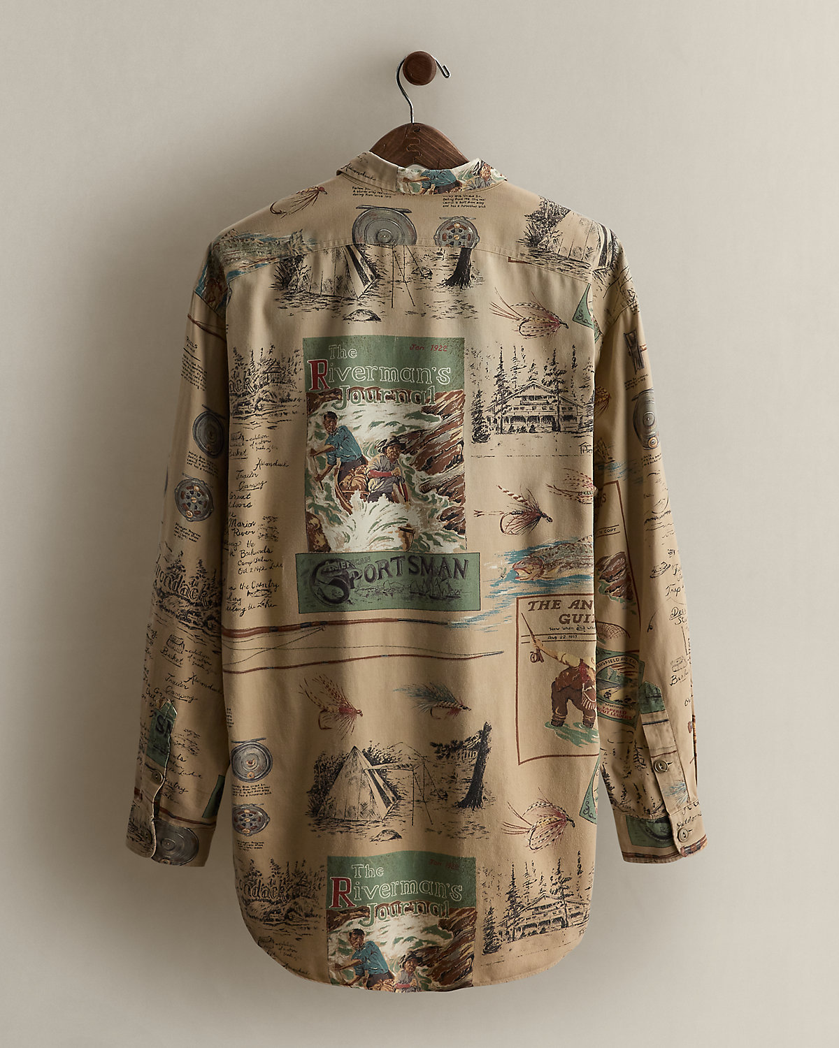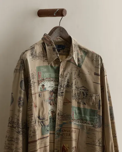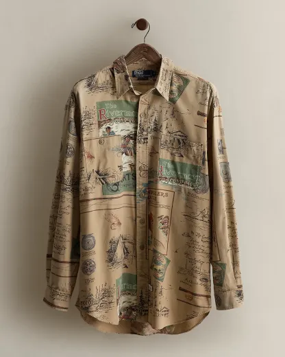 Part of a Spring 1995 Polo sportsman-inspired concept. Cotton workshirt features a magazine-inspired motif throughout. Size large has approximately a 33.75" back body length, a 21.75" shoulder, a 48" chest, and a 23.75" sleeve length.