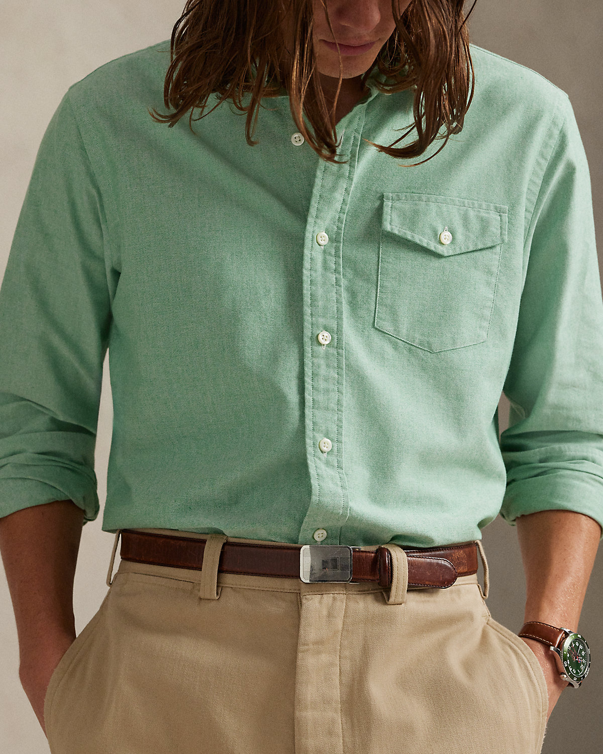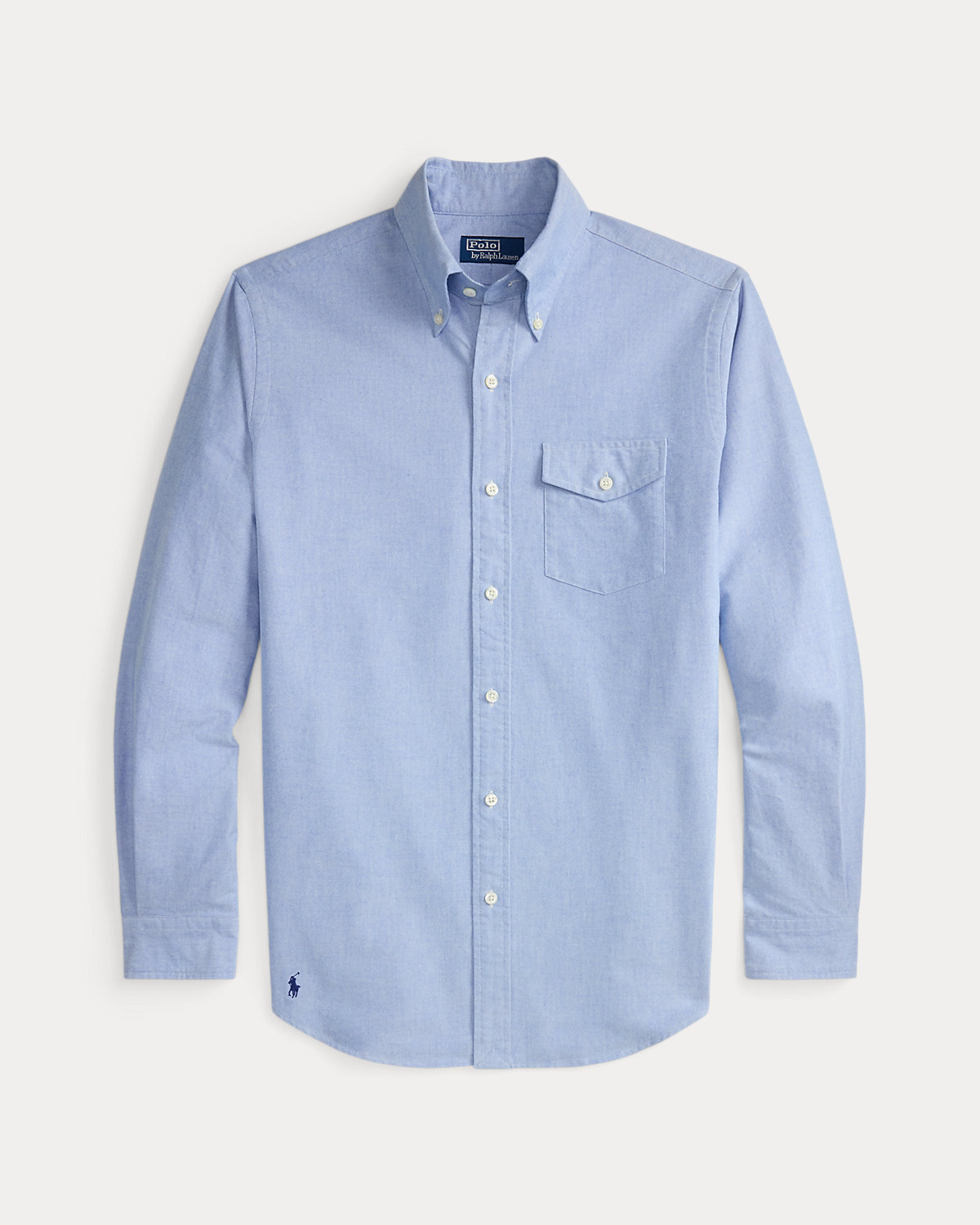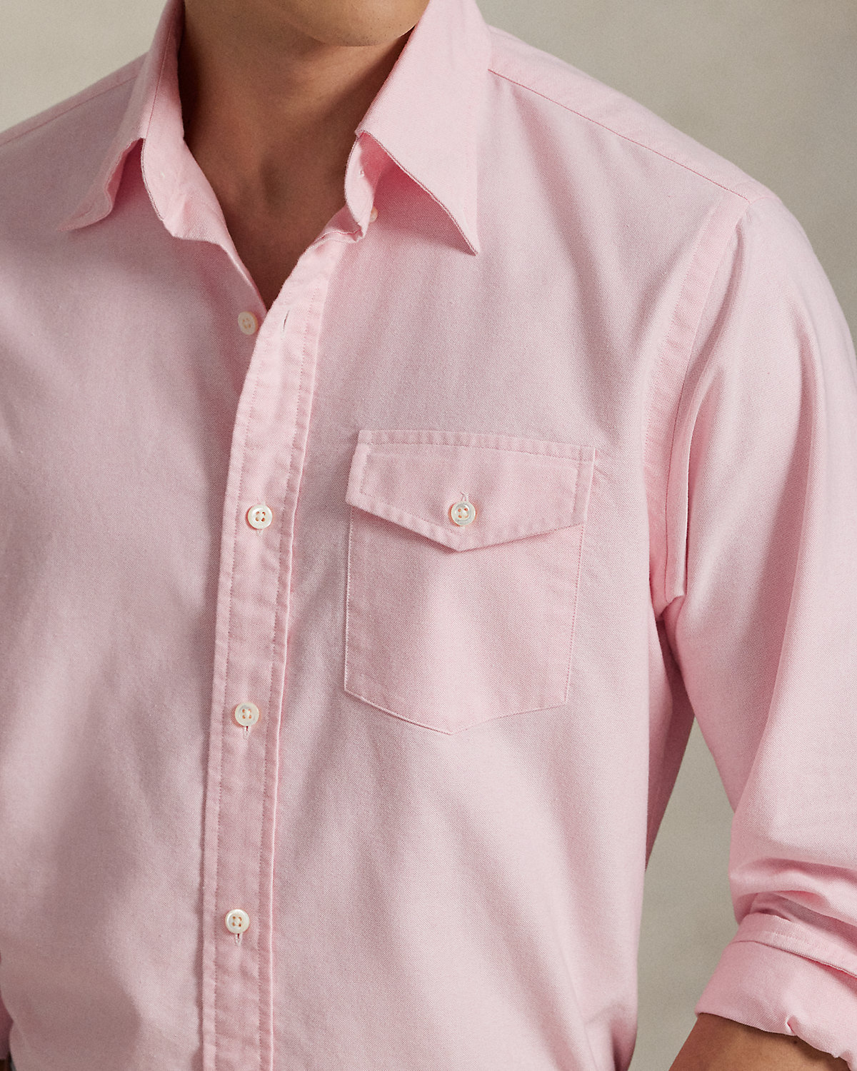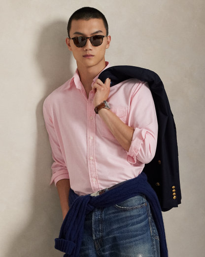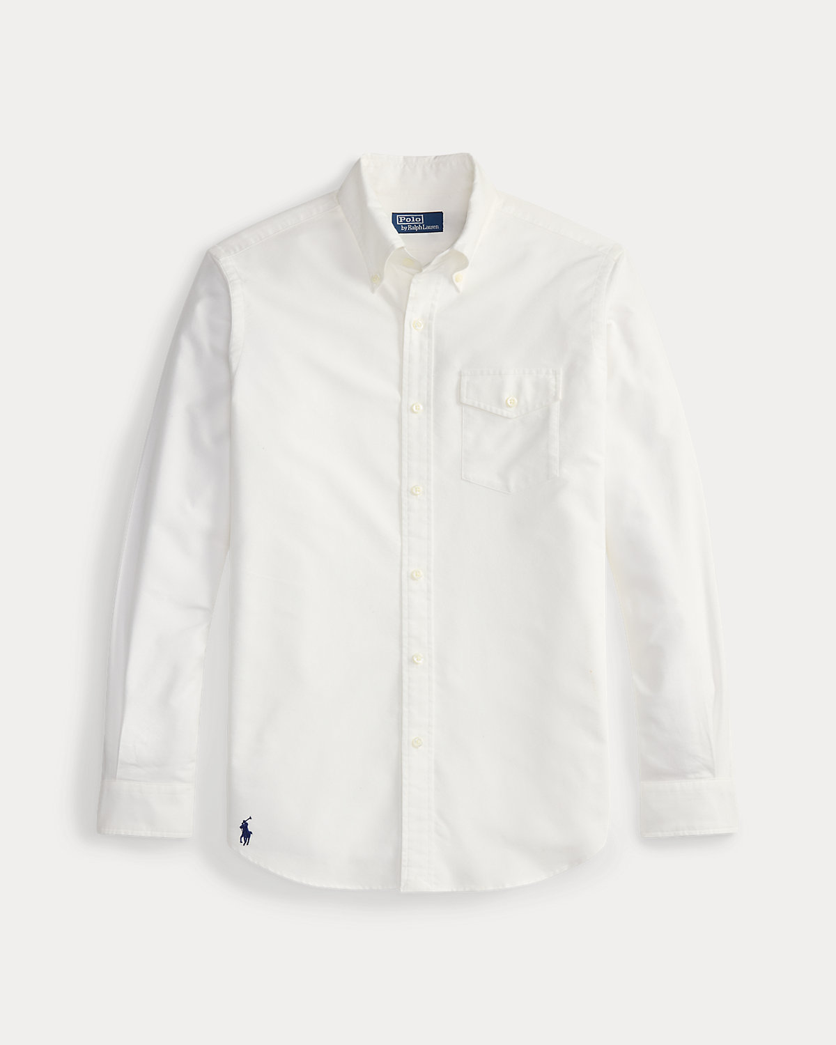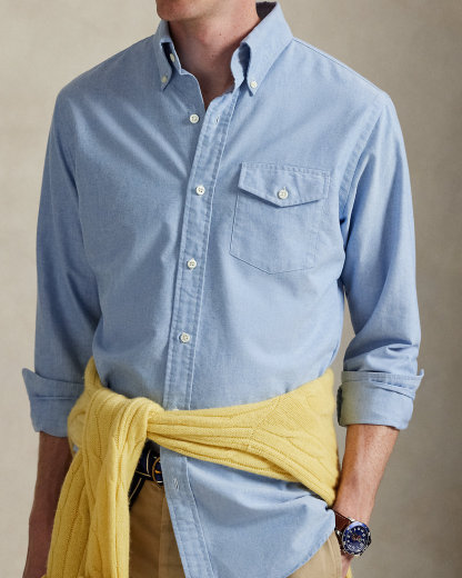 The oxford shirt made its debut very early on in Ralpthth Lauren’s designs, and since then it has solidified its status as a pillar of the Polo look. Our fabric is developed with a secret wash that gives it instant character, ease, and a heathered softness—what we call the perfect “rumple.” The formula is so unique, it’s been kept in a safe for more than three decades. Today, Mr. Lauren continues to create countless variations of his iconic shirt, including this version that is finished with genuine mother-of-pearl divs.