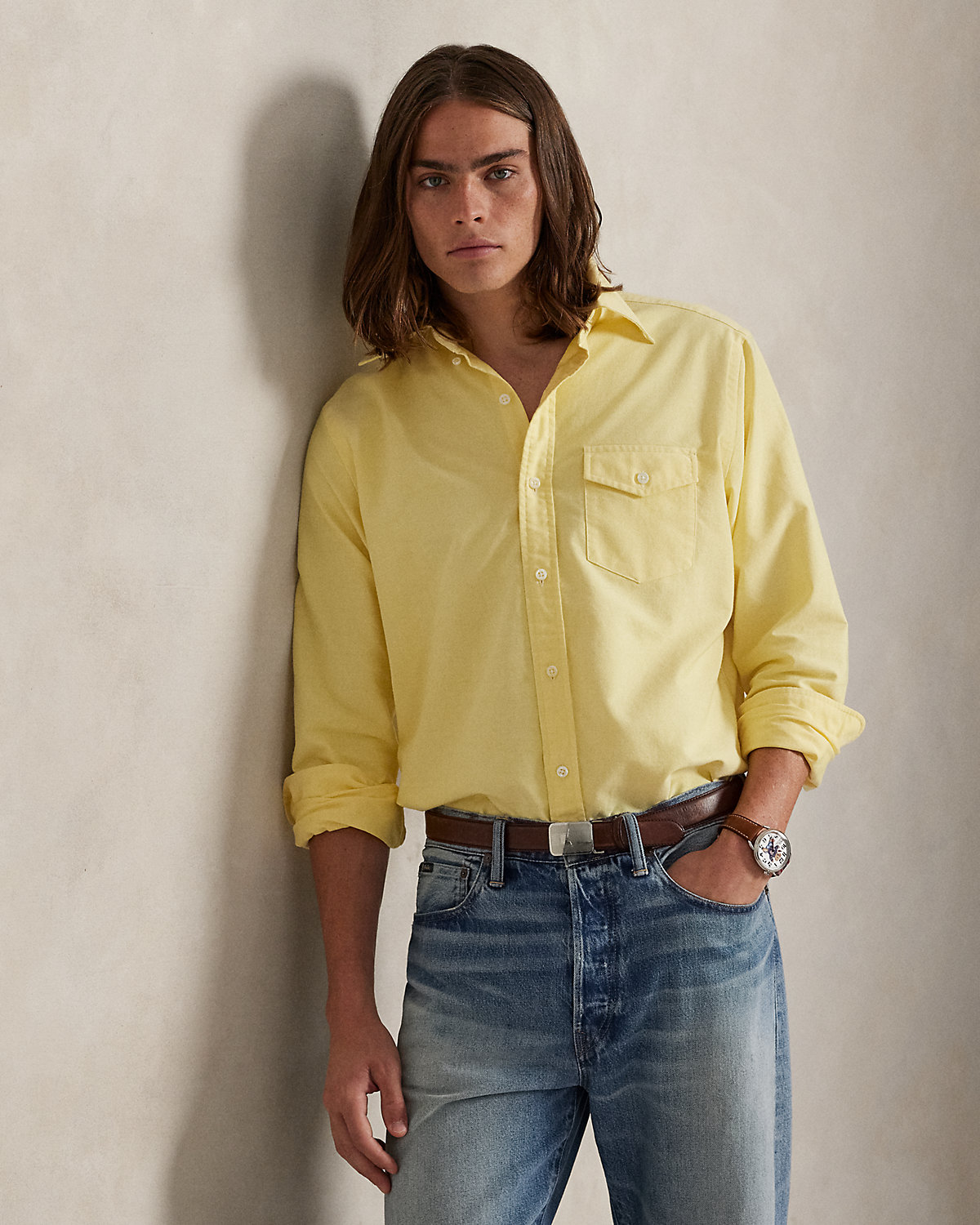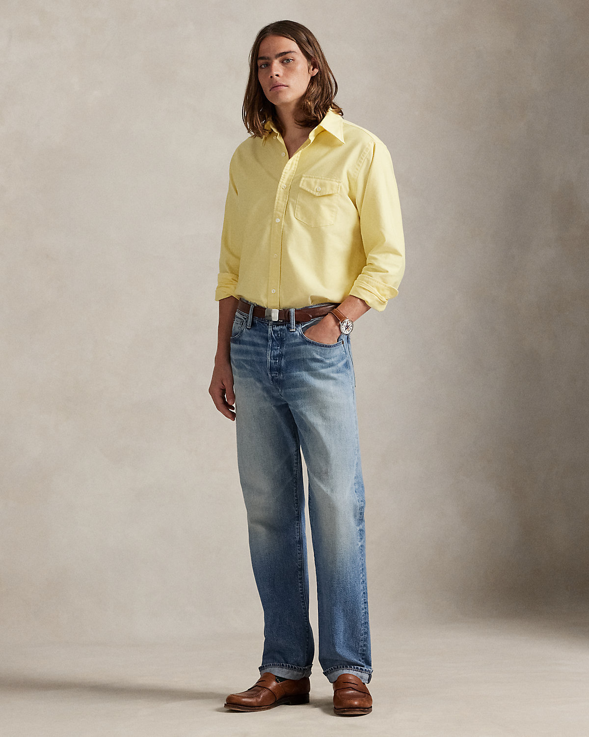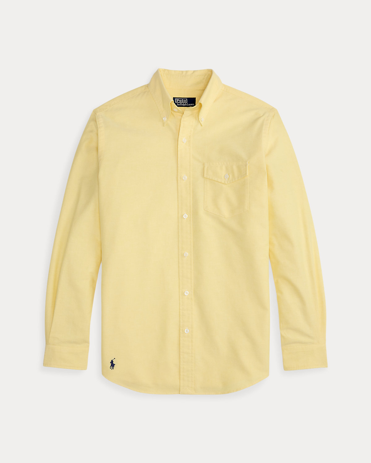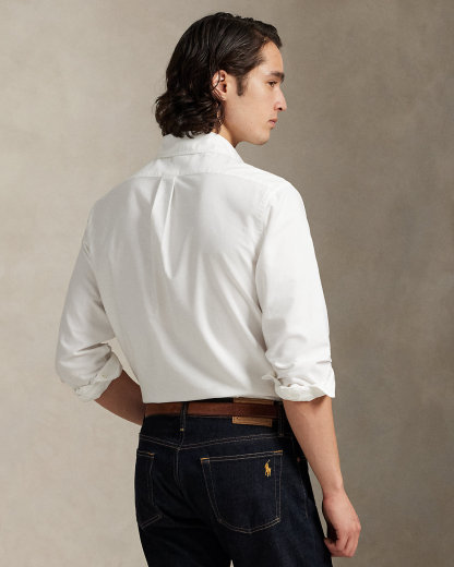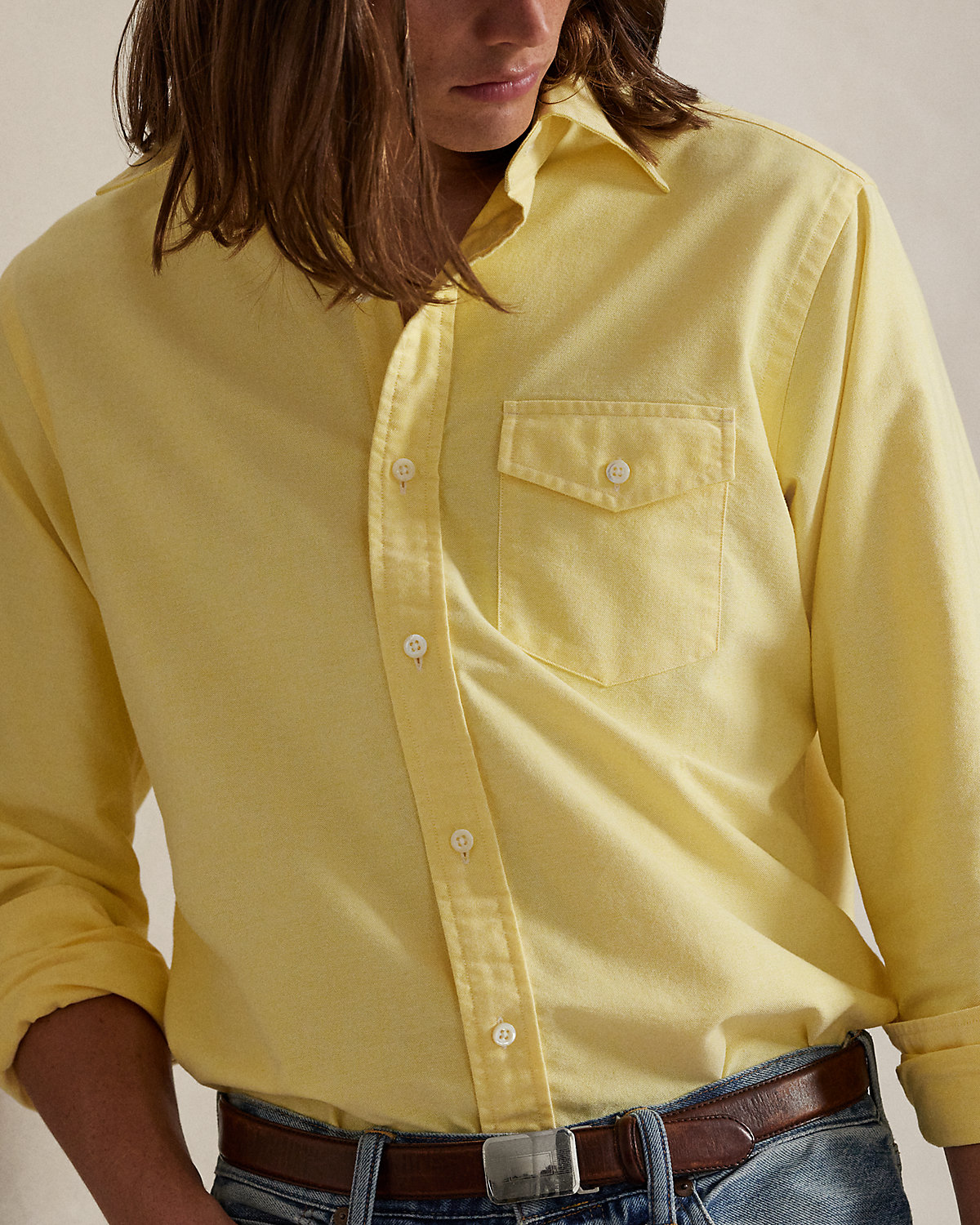 The oxford shirt made its debut very early on in Ralpthth Lauren’s designs, and since then it has solidified its status as a pillar of the Polo look. Our fabric is developed with a secret wash that gives it instant character, ease, and a heathered softness—what we call the perfect “rumple.” The formula is so unique, it’s been kept in a safe for more than three decades. Today, Mr. Lauren continues to create countless variations of his iconic shirt, including this version that is finished with genuine mother-of-pearl divs.