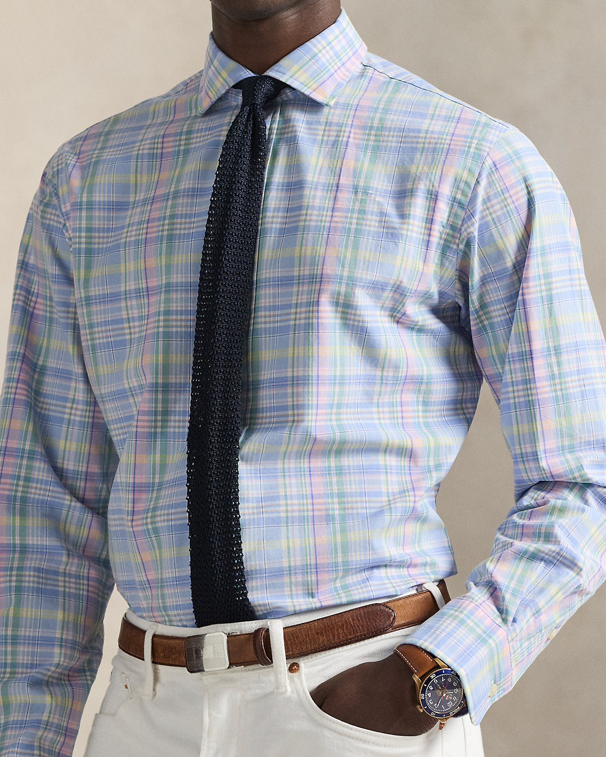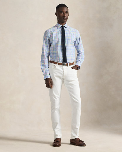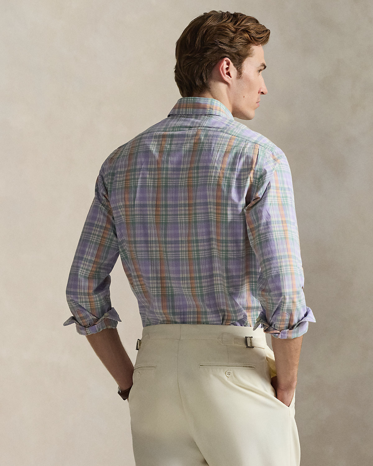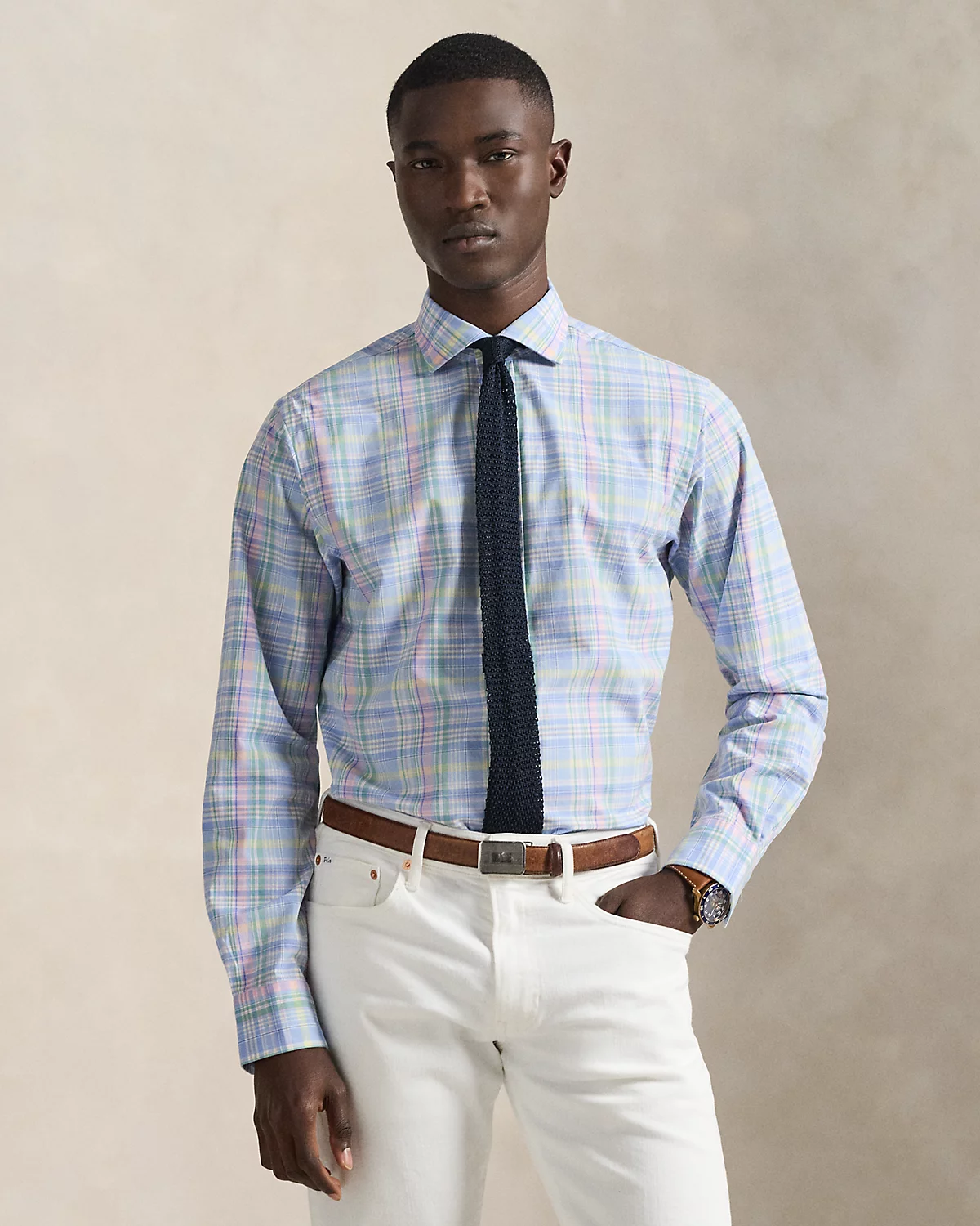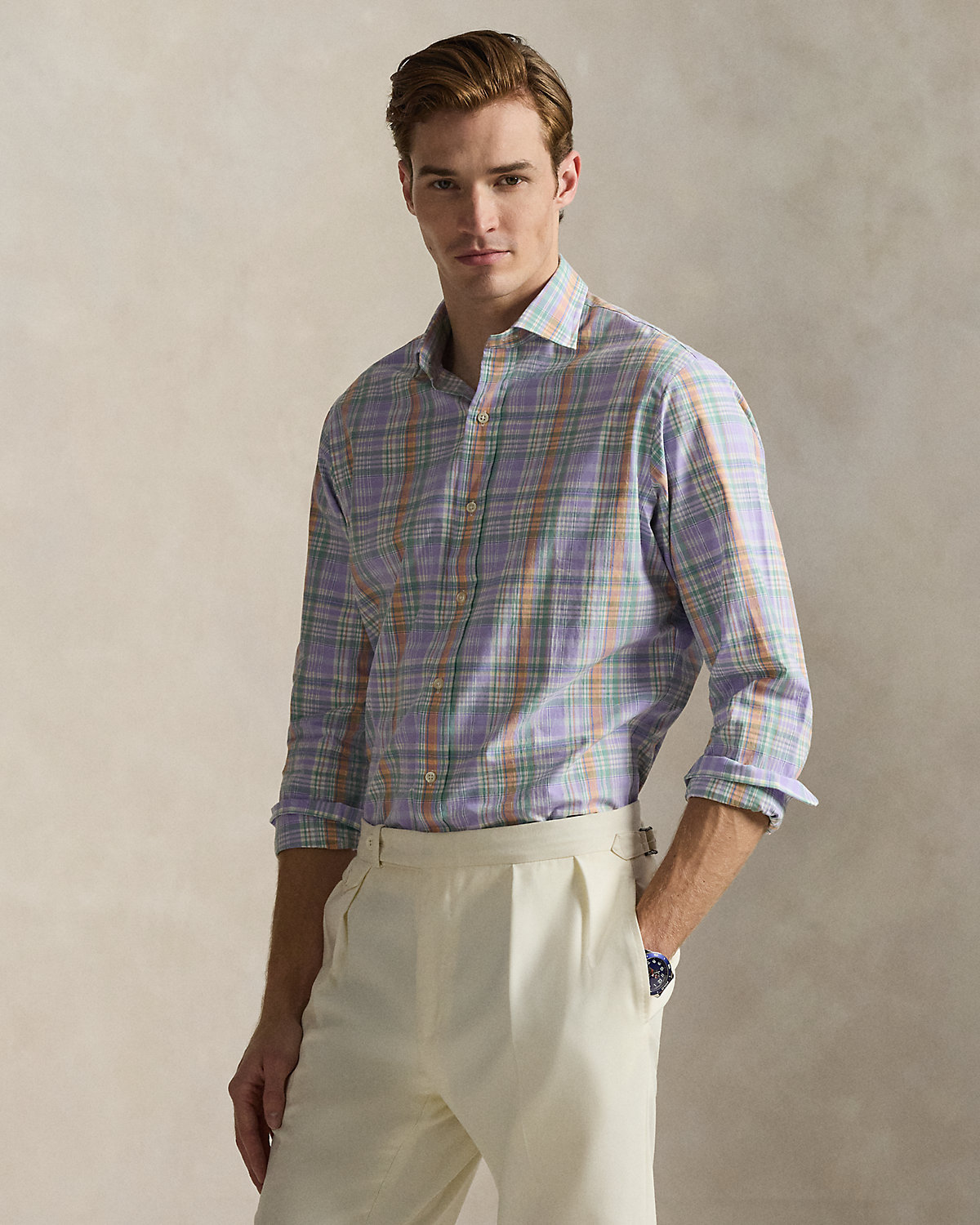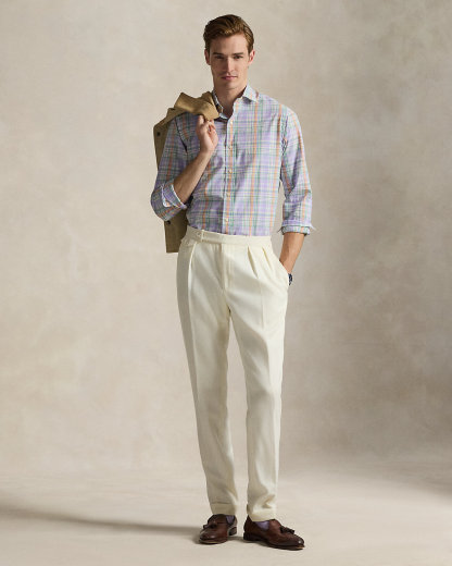 Made with silky cotton poplin, this shirt features a classic plaid pattern rendered in pastel hues.