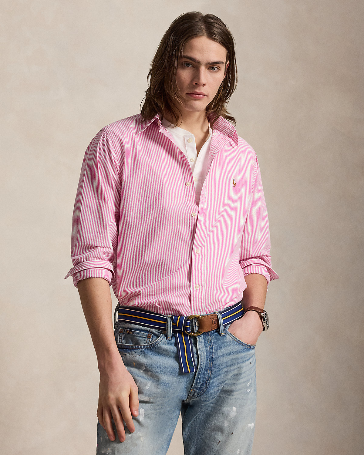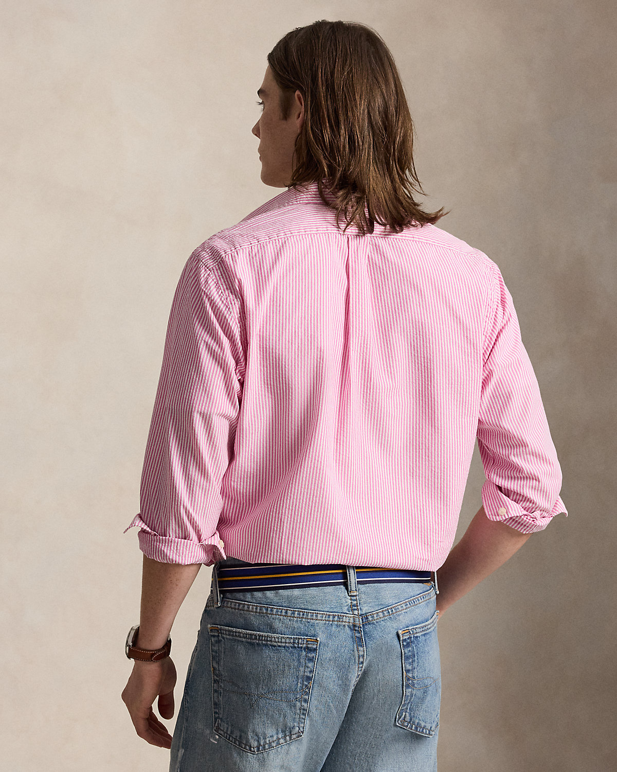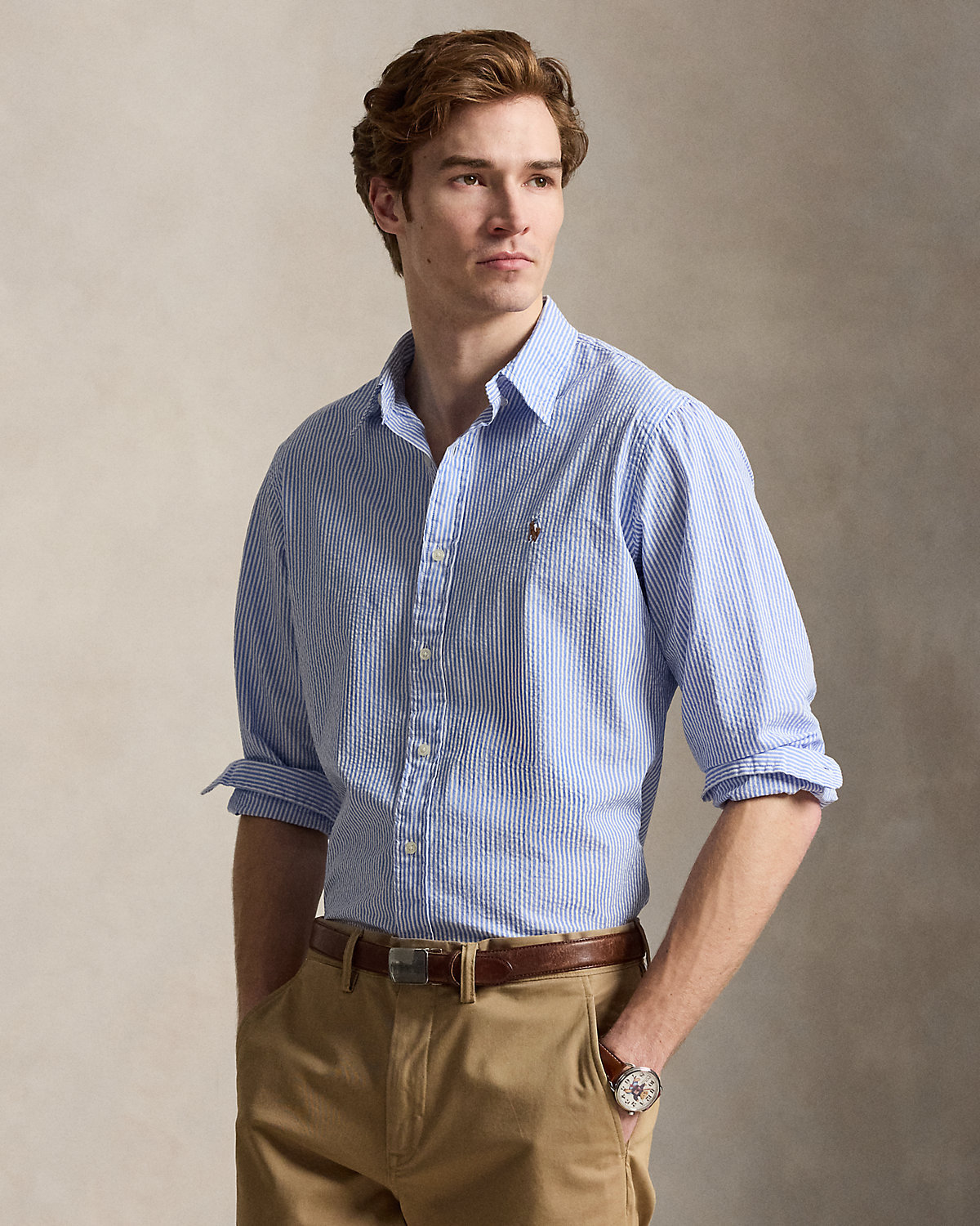 This striped shirt’s seersucker fabric is crafted with breathable cotton, making it the perfect choice for warm-weather days.