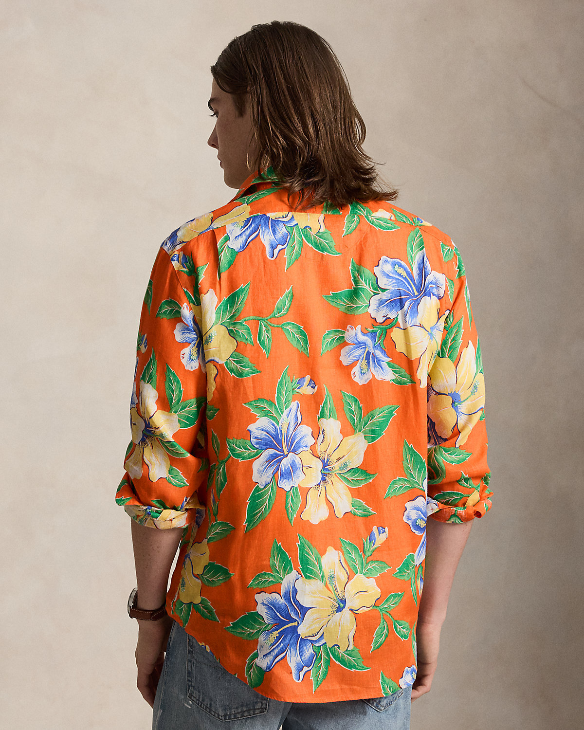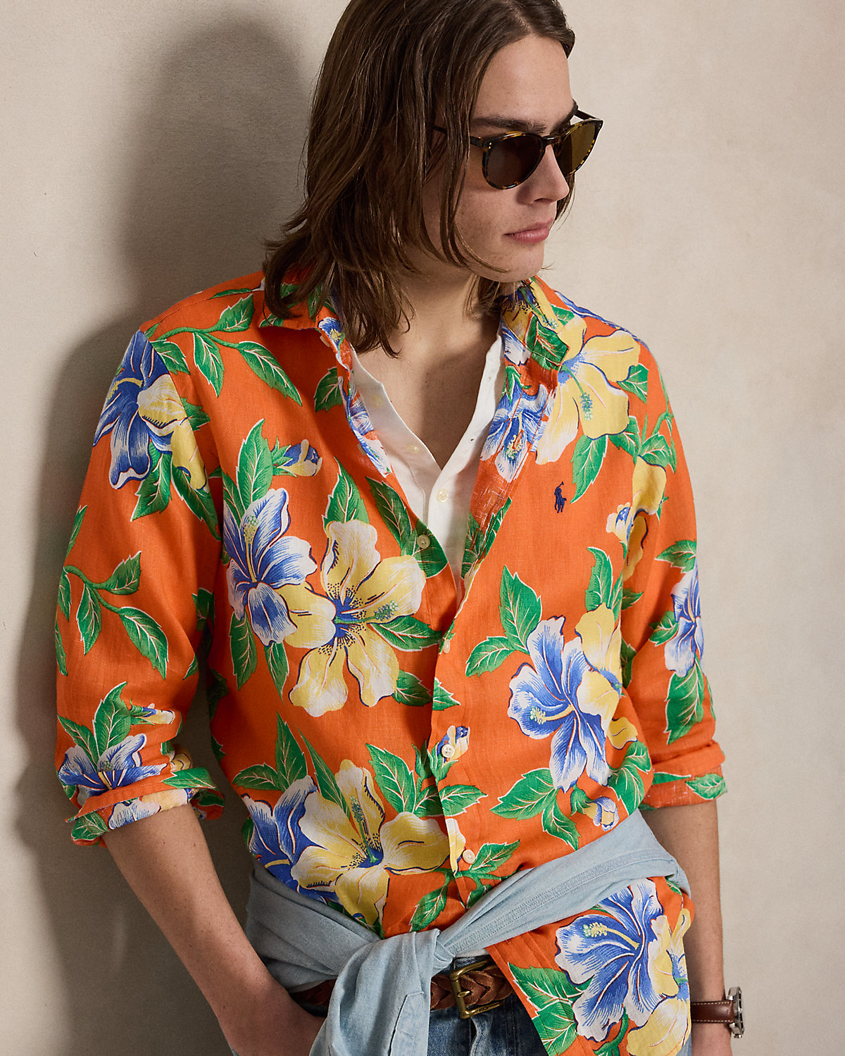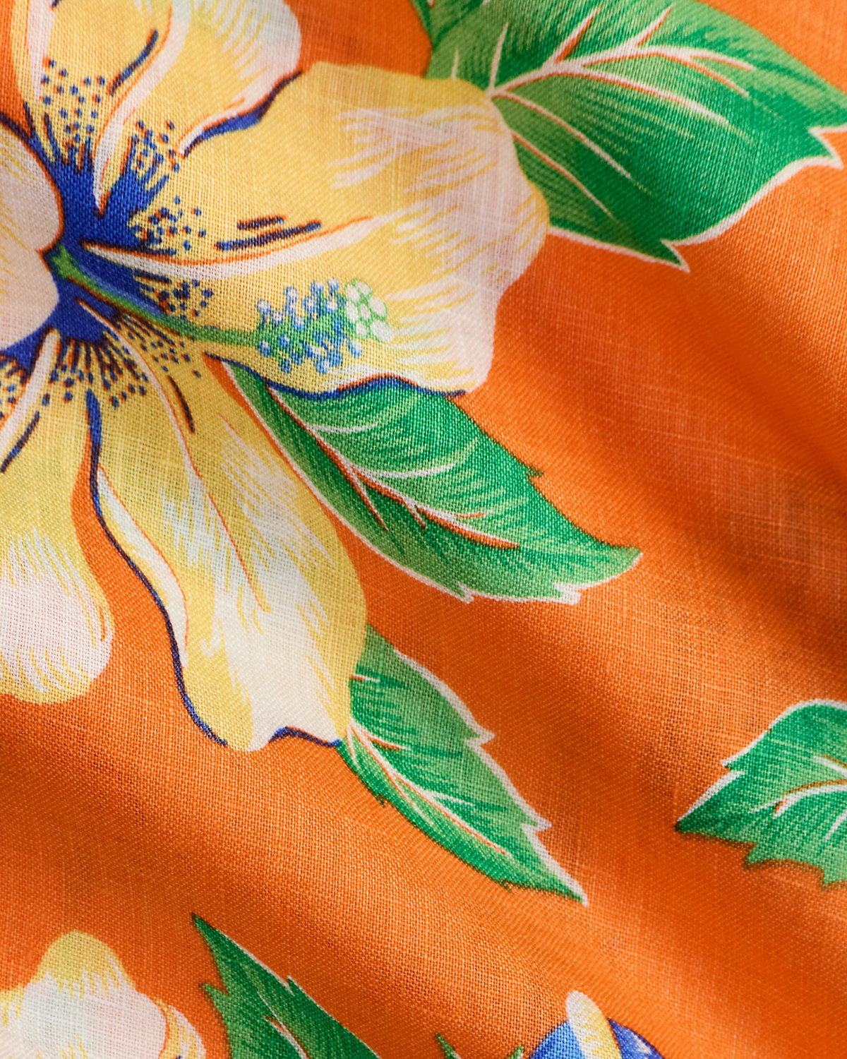 Perfect for warm-weather days, this shirt unites ultralightweight linen with a vibrant tropical print of hibiscus flowers.