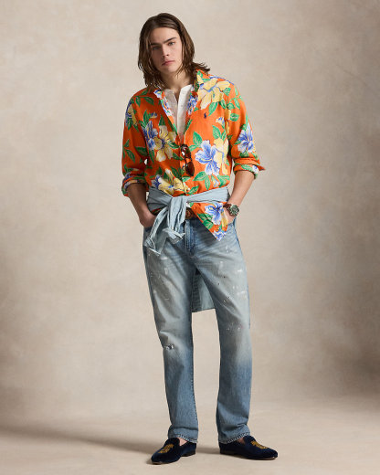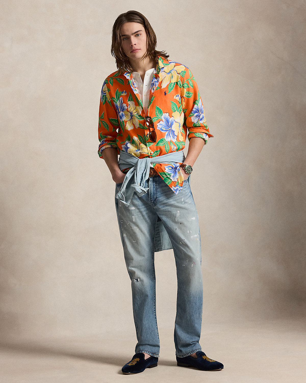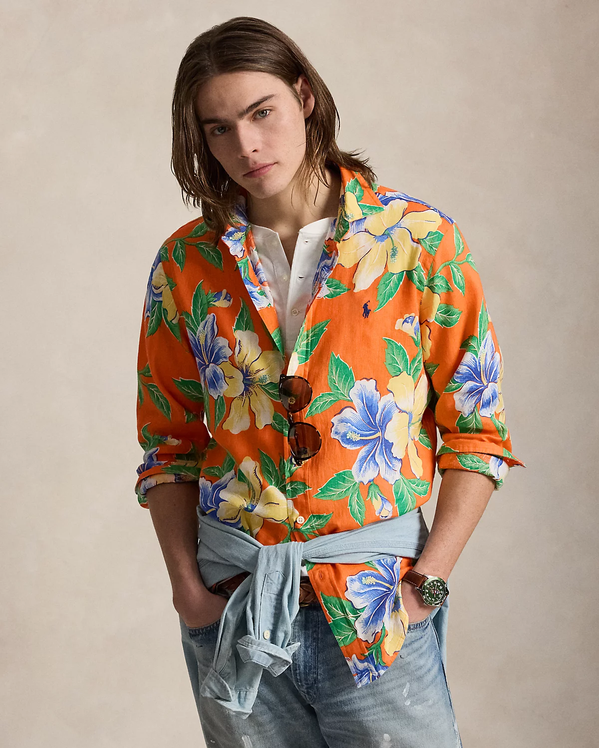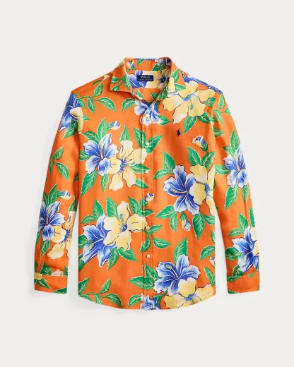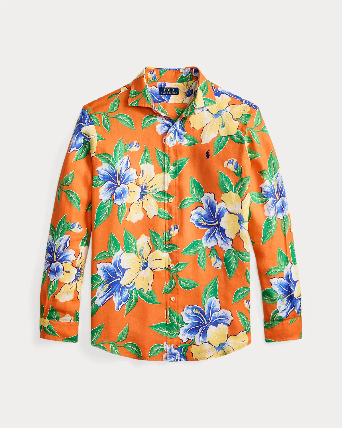 Perfect for warm-weather days, this shirt unites ultralightweight linen with a vibrant tropical print of hibiscus flowers.