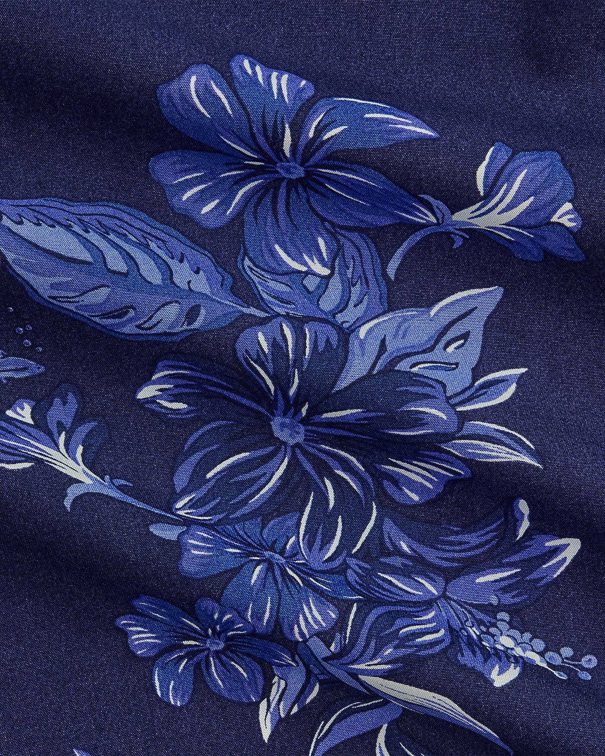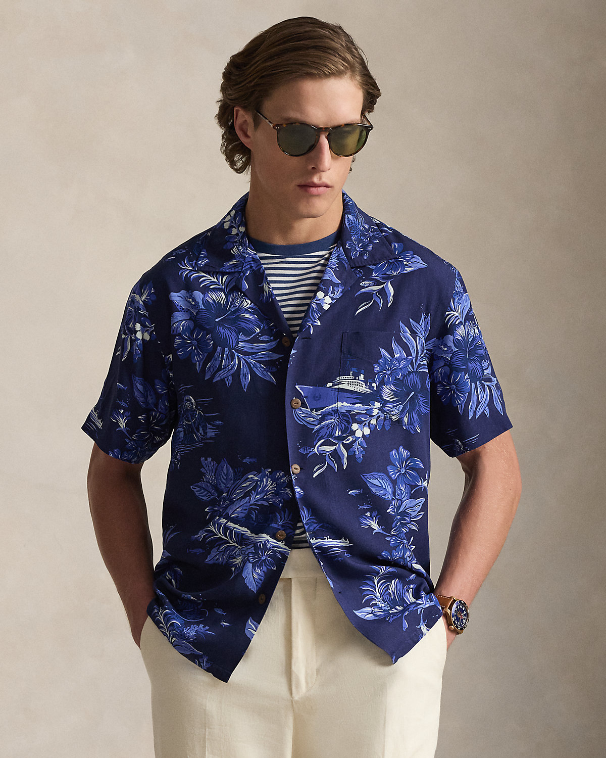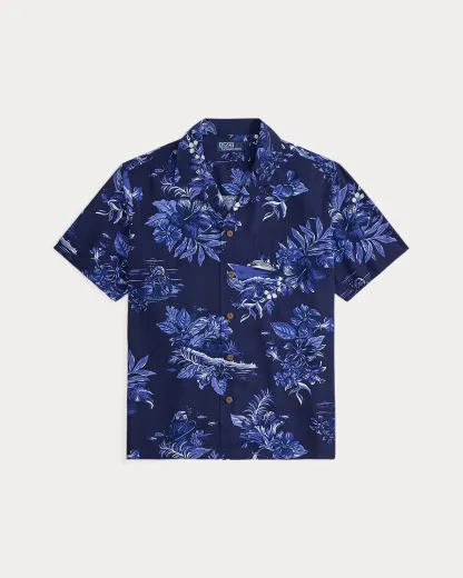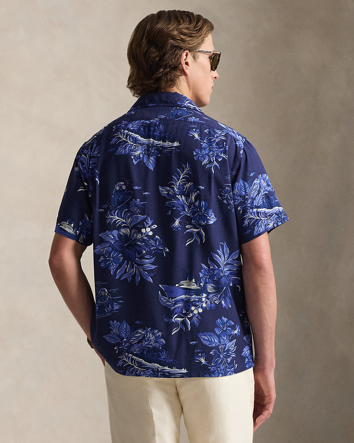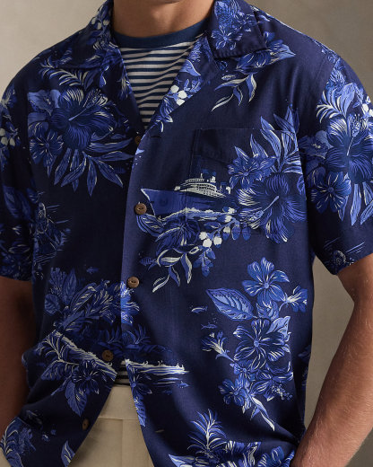 Crafted from a lightweight fabric, this shirt features a tonal motif of tropical flowers, watercrafts, and deep-sea divers.