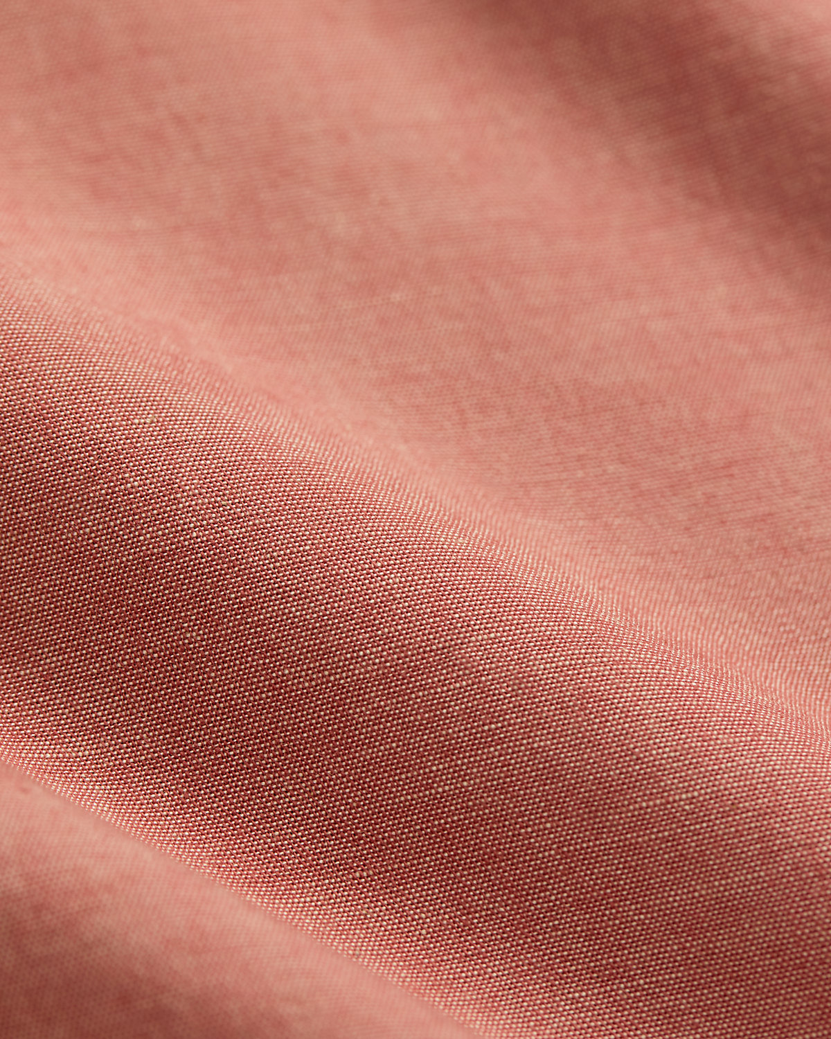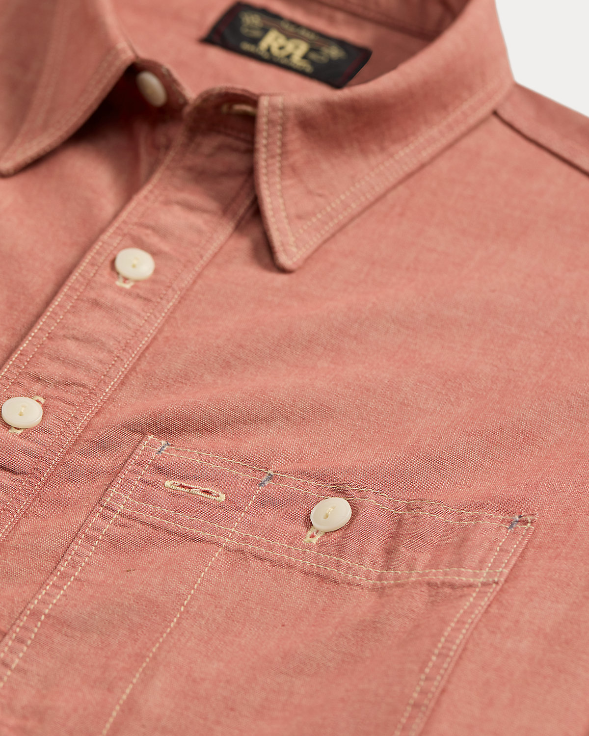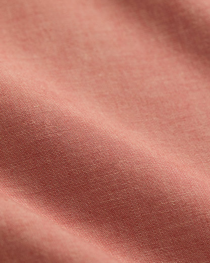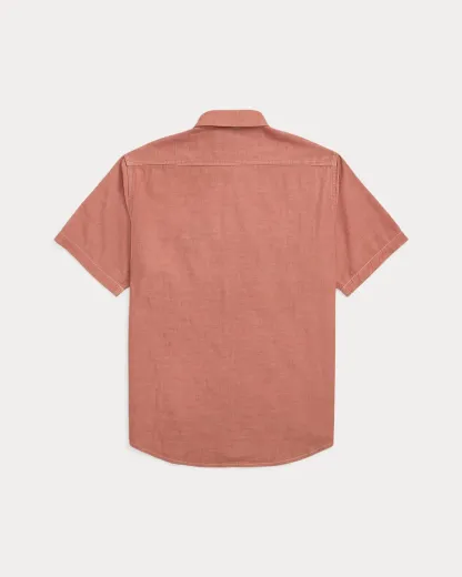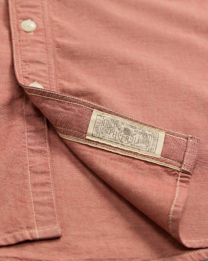 Made with red cotton chambray from Japan. Selvedge detailing at the front placket. Buttoned pockets at the chest.