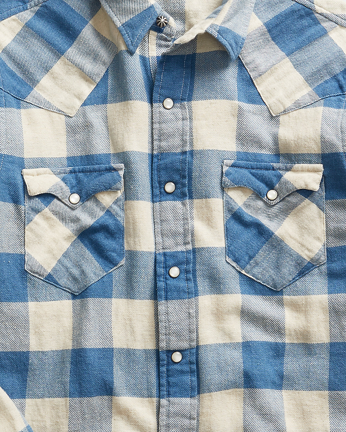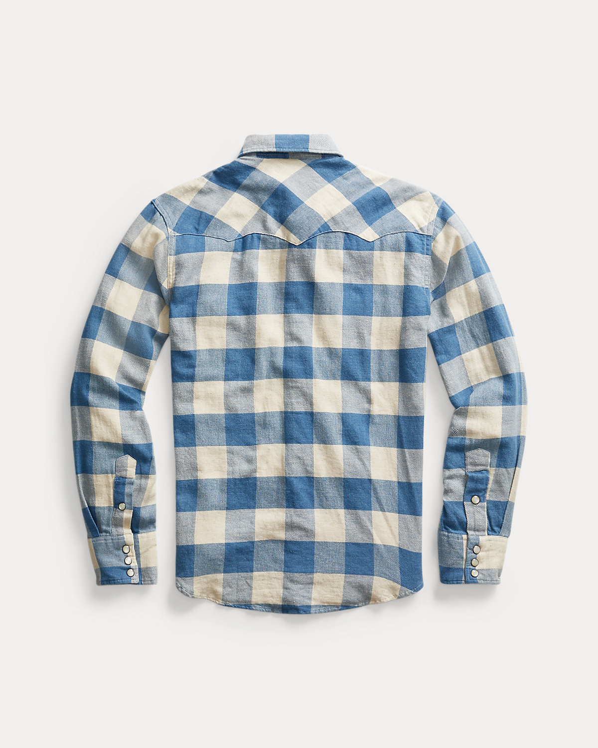 Slim-fitting shirt made with lightweight cotton-and-linen twill. Indigo-dyed plaid pattern. Metal div at the collar.