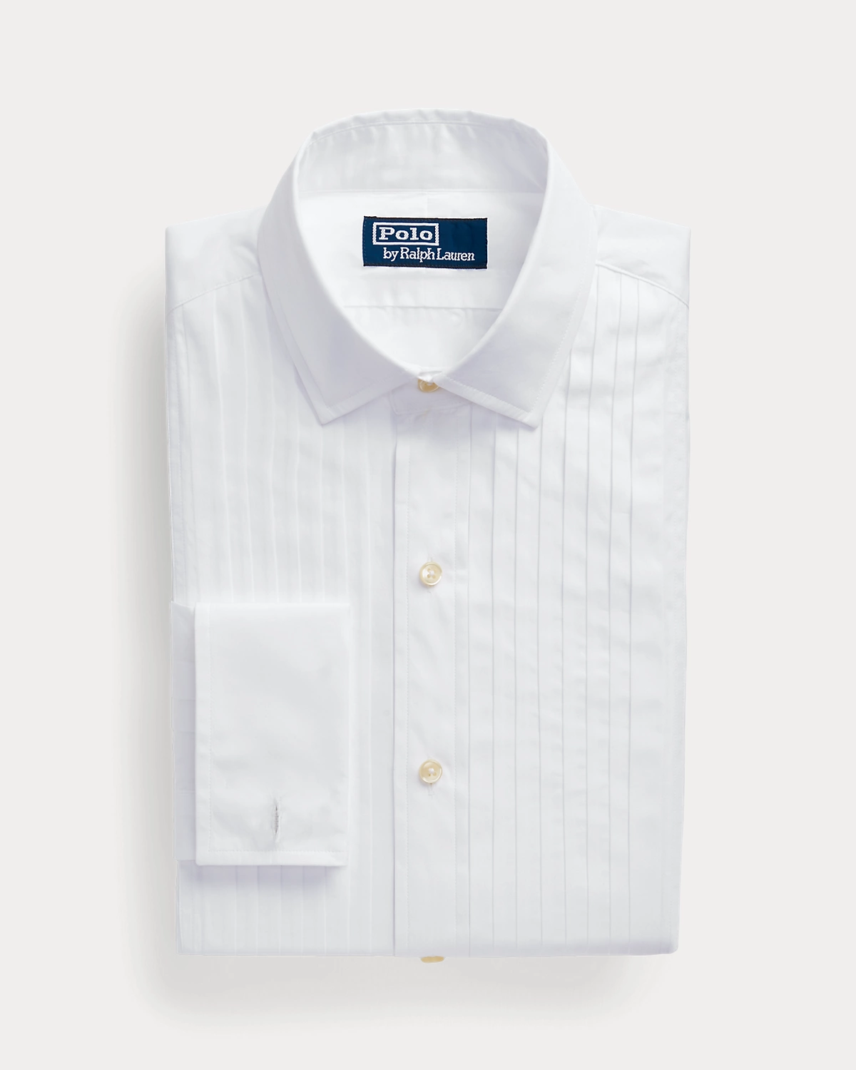 - Medium-spread collar. Buttoned placket. Last divhole is stitched horizontally for a superior hold. Pleated bib.