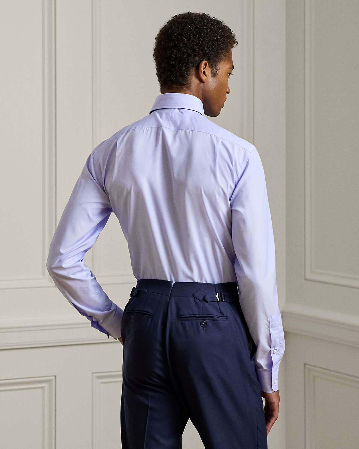 - Split pleated back yoke ensures smooth, contoured shoulders.