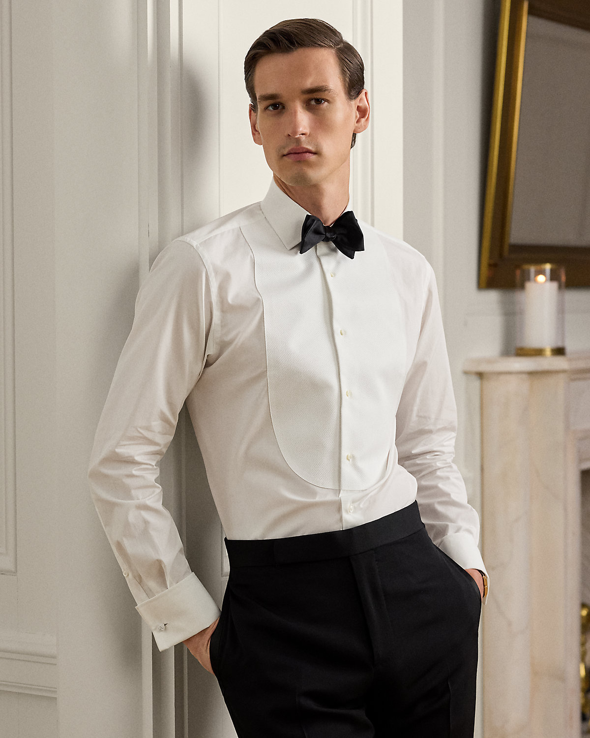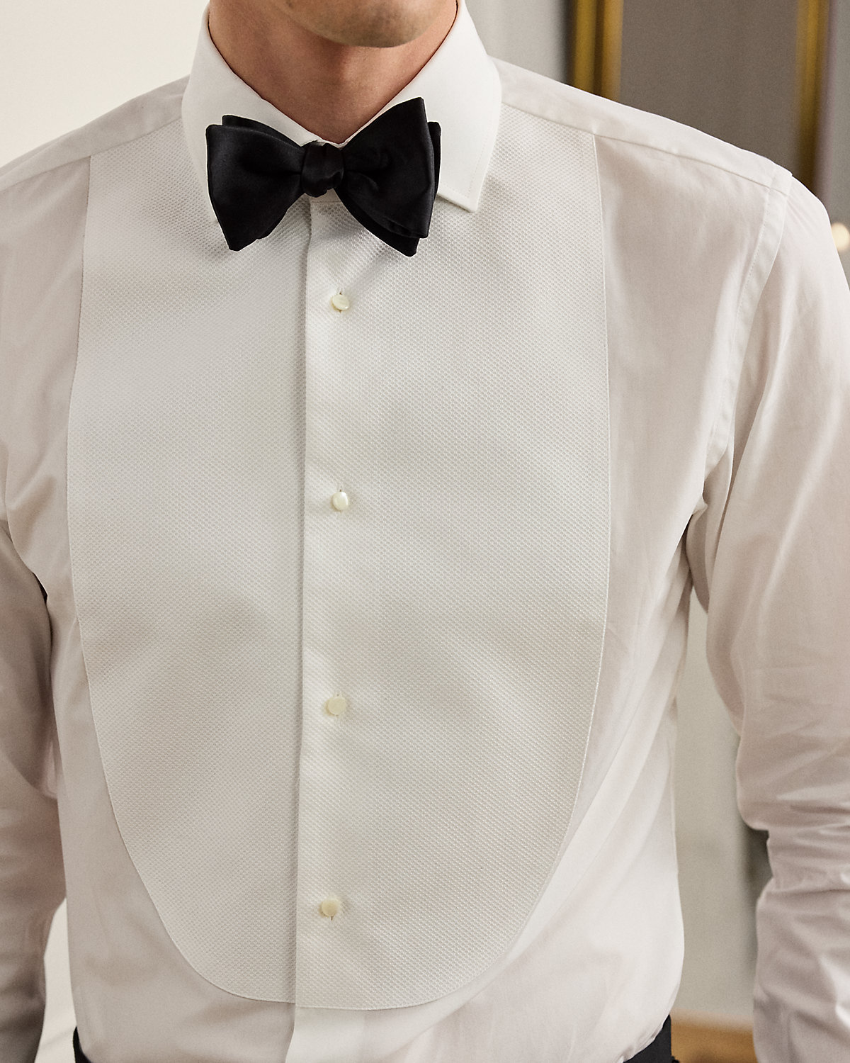 - Buttoned placket. Genuine mother-of-pearl divs. Piqué bib.