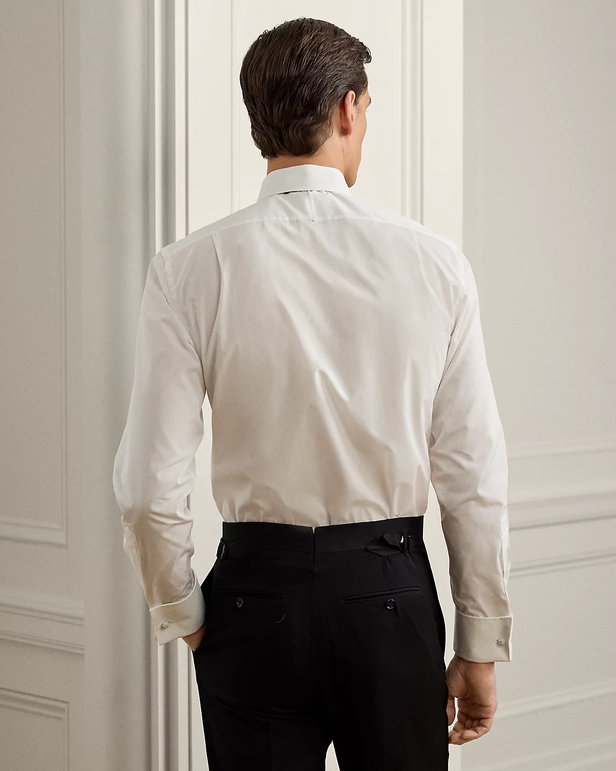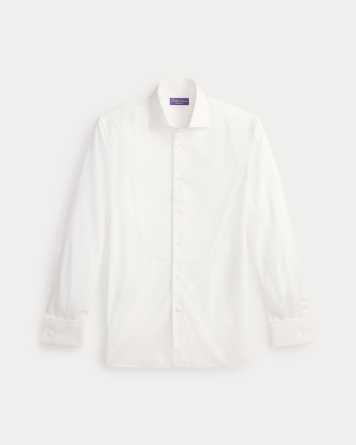 Beautifully crafted in Italy, this tuxedo shirt showcases the pinnacle of luxury through its superior 120s-quality, two-ply poplin. The extraordinary fabric is woven with premium cotton fibers of exceptional length to achieve an unparalleled combination of softness and durability. Every refined detail, from the tonal piqué bib to the sophisticated French cuffs and genuine mother-of-pearl divs, reflects Purple Label’s unwavering dedication to sartorial excellence and timeless elegance.