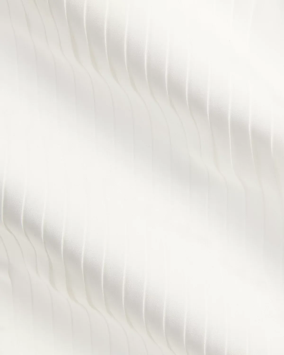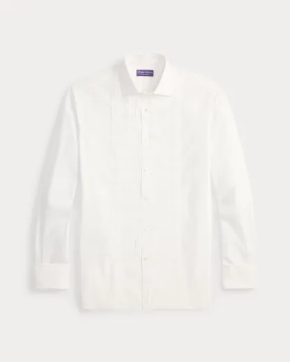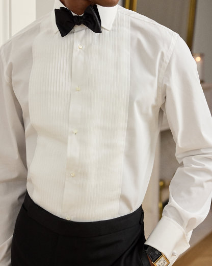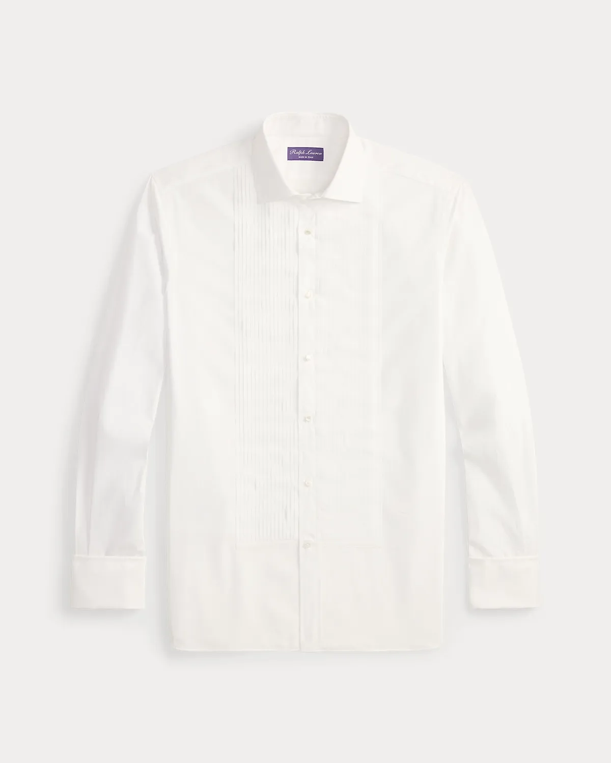 Beautifully crafted in Italy, this tuxedo shirt showcases the pinnacle of luxury through its superior 120s-quality, two-ply poplin. The extraordinary fabric is woven with premium cotton fibers of exceptional length to achieve an unparalleled combination of softness and durability. Every refined detail, from the pleated bib to the sophisticated French cuffs and genuine mother-of-pearl divs, reflects Purple Label’s unwavering dedication to sartorial excellence and timeless elegance.