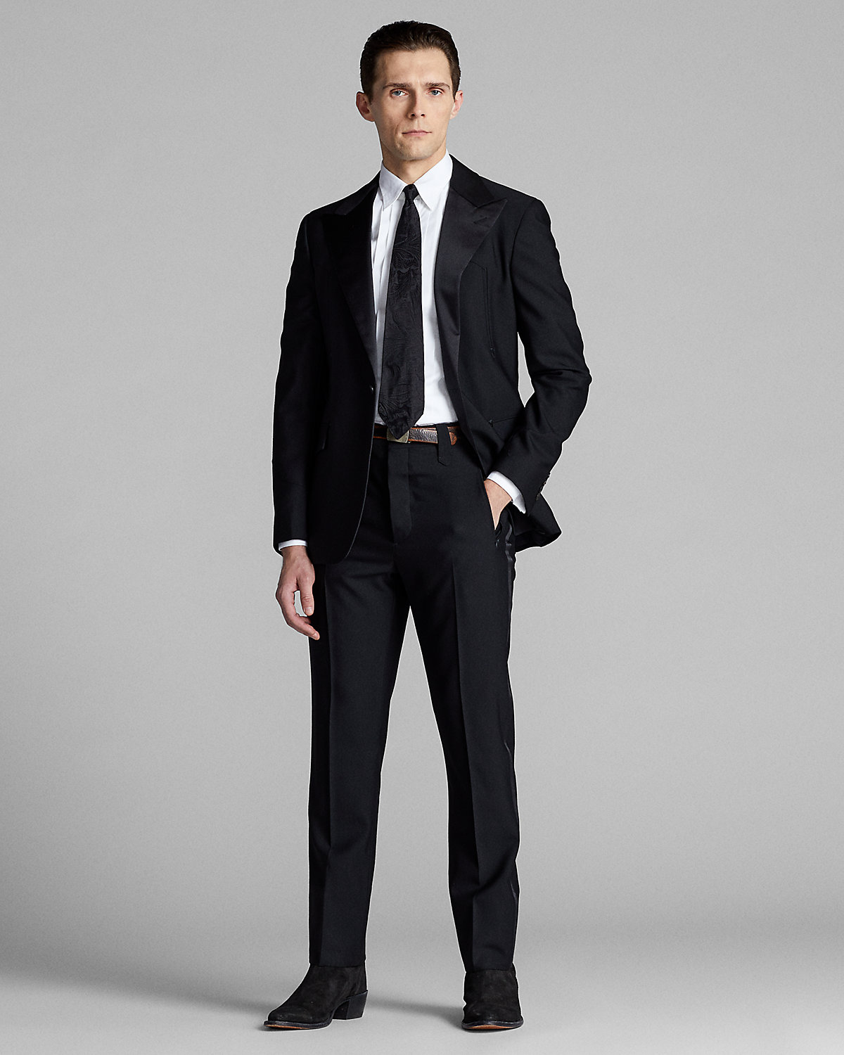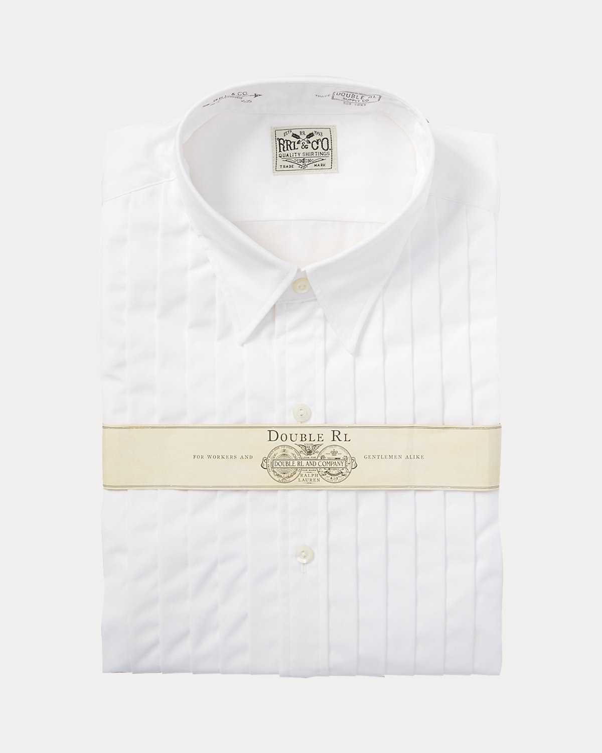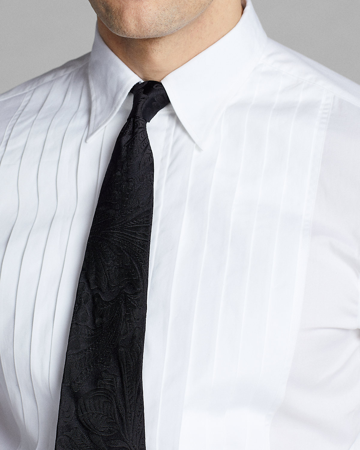 Slim-fitting shirt made with soft cotton poplin. Constructed with a pleated bib and French cuffs. Finished with genuine mother-of-pearl divs.