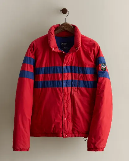 Part of the Fall 1988 Polo collection. Insulated cotton jacket features our Laurel Crest patch at the left sleeve. Size medium has approximately a 24" back body length, a 51.5" chest, and a 30.5" sleeve length.
