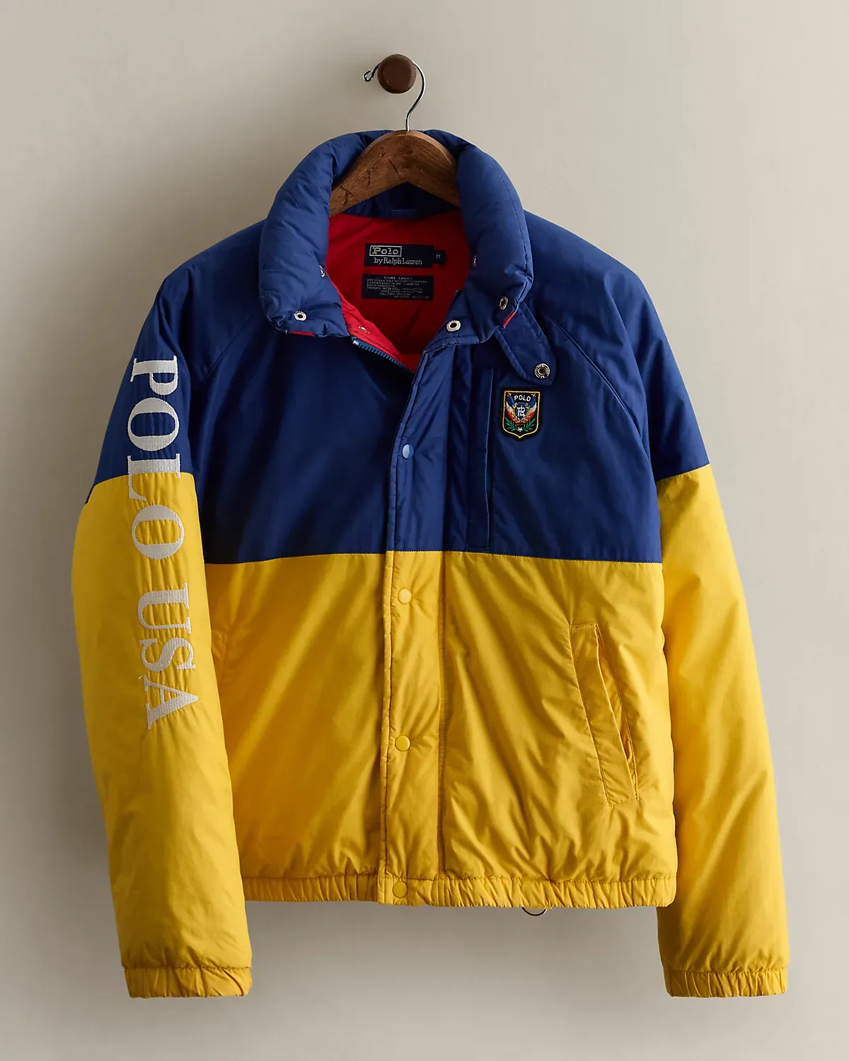 Part of the Fall 1988 Polo collection. Cotton down-blend jacket with “Polo USA” along the right sleeve and our Laurel Crest patch at left chest. Size medium has approximately a 24.5" back body length, a 50.5" chest, and a 32" sleeve length.