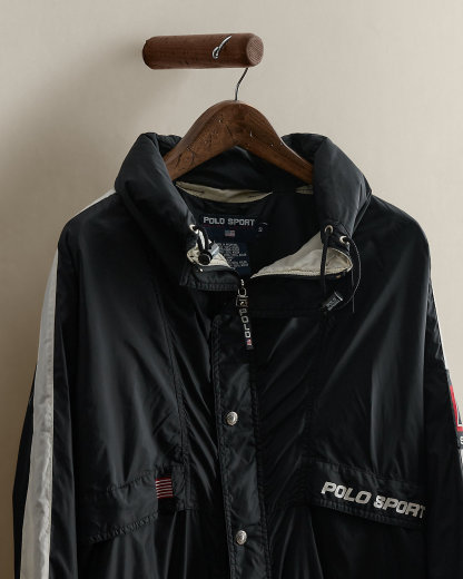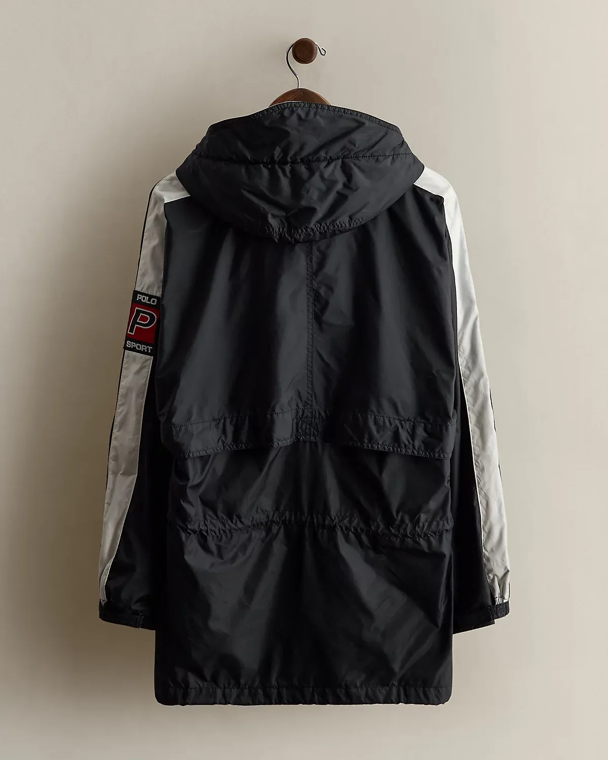 Part of the Spring 1997 Polo Sport collection. Hooded jacket with signature details, including a “Polo Sport P” patch at the left sleeve. Size small has approximately a 30.5" back body length, a 45" chest, and a 28.25" sleeve length.