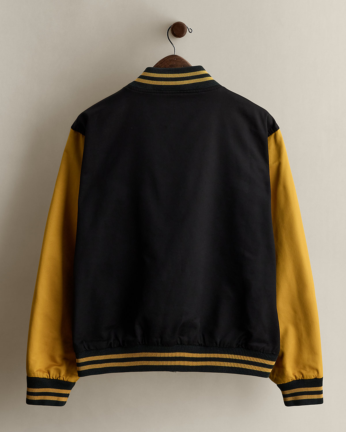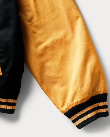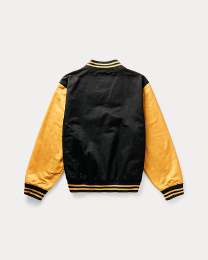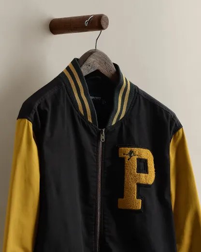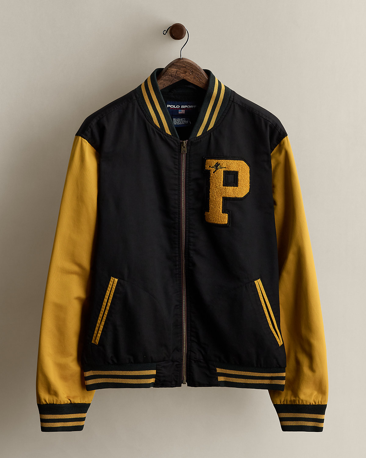 Part of the Spring 2003 Polo Sport collection. Twill jacket features a letterman-style “P” patch at the chest. Size large has approximately a 24.75" back body length, a 20" shoulder, a 48.5" chest, and a 25.25" sleeve length.