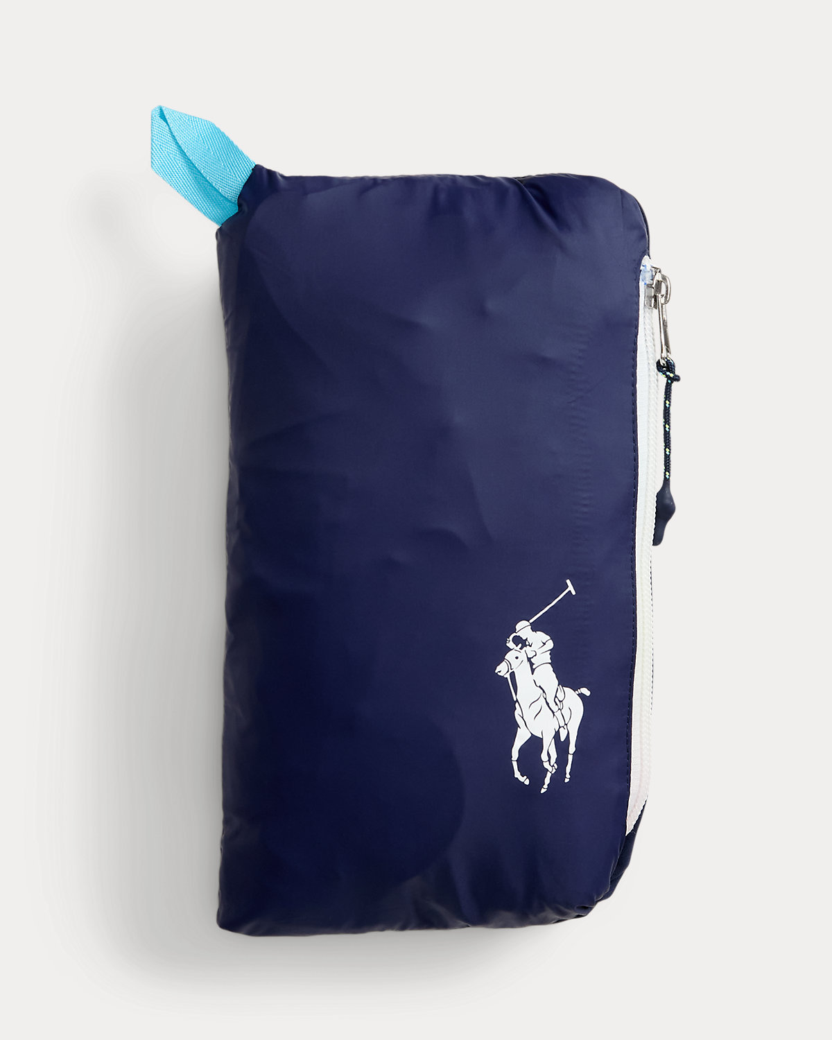 - The official Australian Open logo printed at the right chest. Left chest zip pocket. Two front waist zip pockets. Packs into the right pocket, which features a carrying loop.