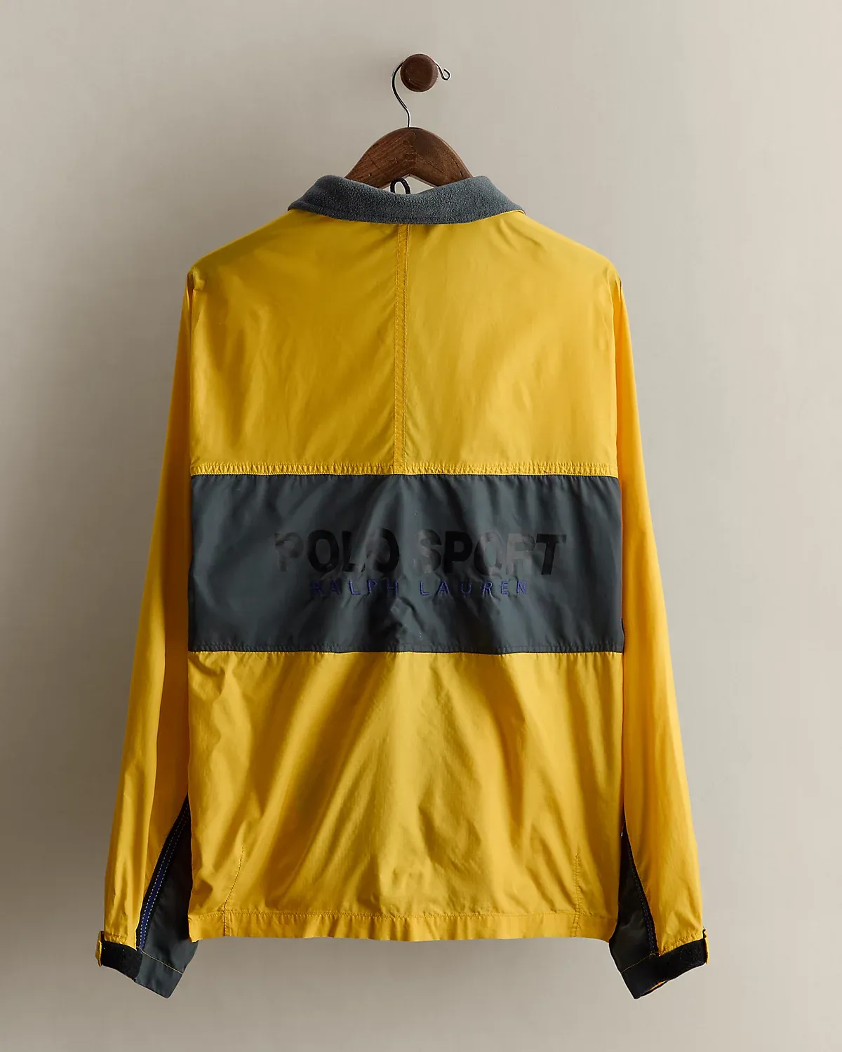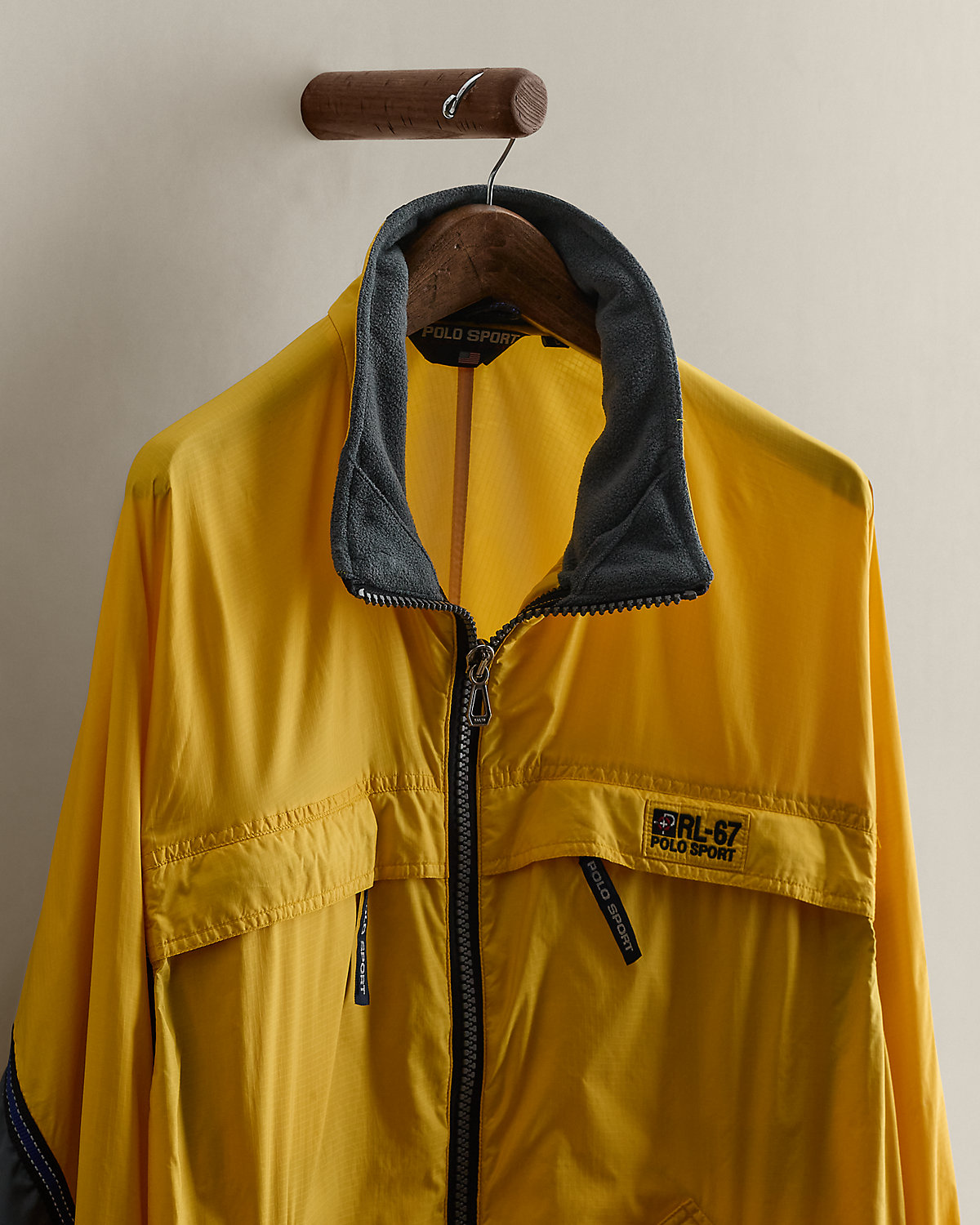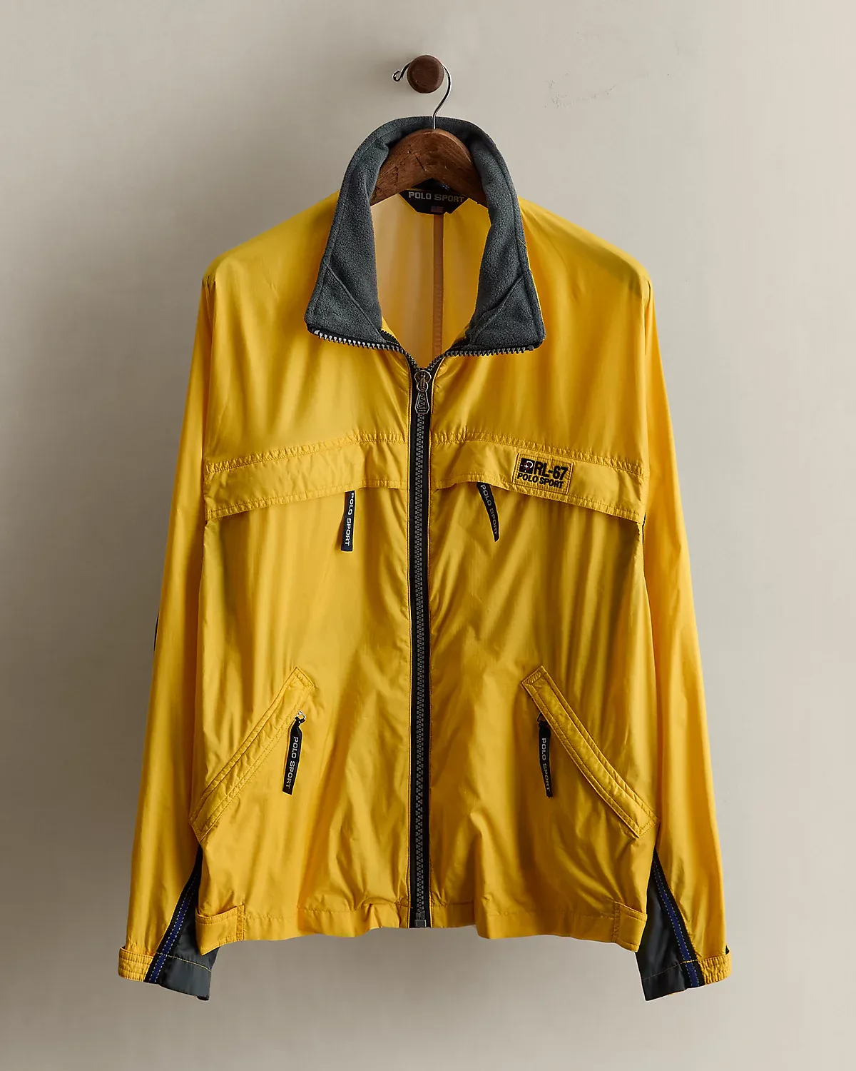 Part of a Polo Sport collection from the ’90s. Jacket features a fleece-lined collar and signature logos. Size large has approximately a 27" back body length, a 49" chest, and a 32.5" sleeve length.