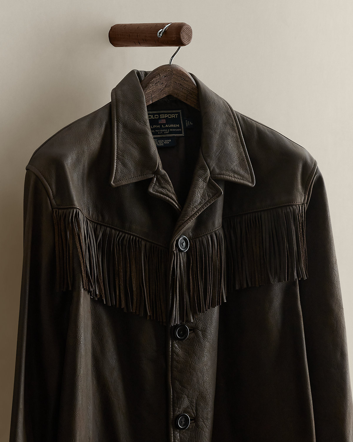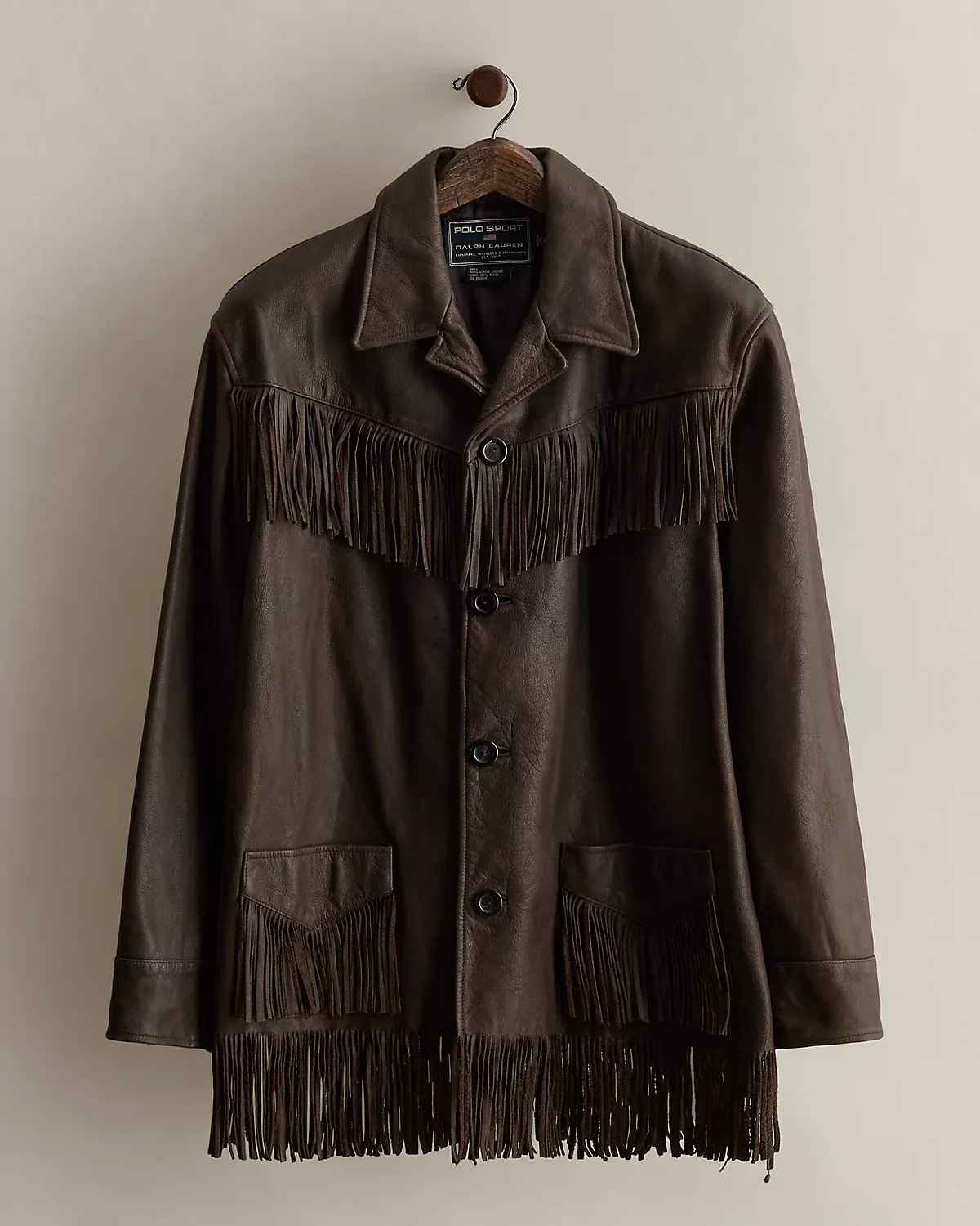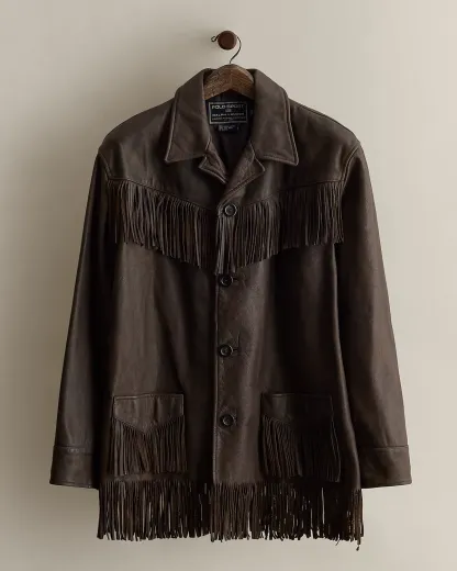 Part of a Polo Sport collection from the early 2000s. Western-styled jacket made from leather. Features fringe accents. Size large has approximately a 29.5" back body length, a 19.5" shoulder, a 47" chest, and a 25" sleeve length.