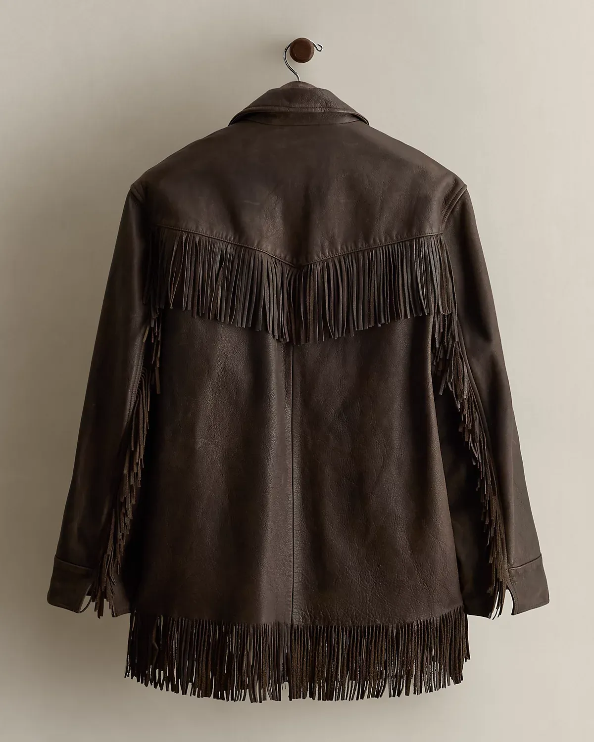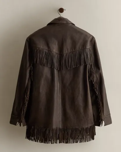 - Fringed front-and-back yoke. Two front waist flapped pockets with fringed trim. Interior left chest pocket.