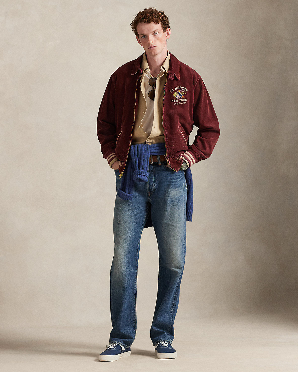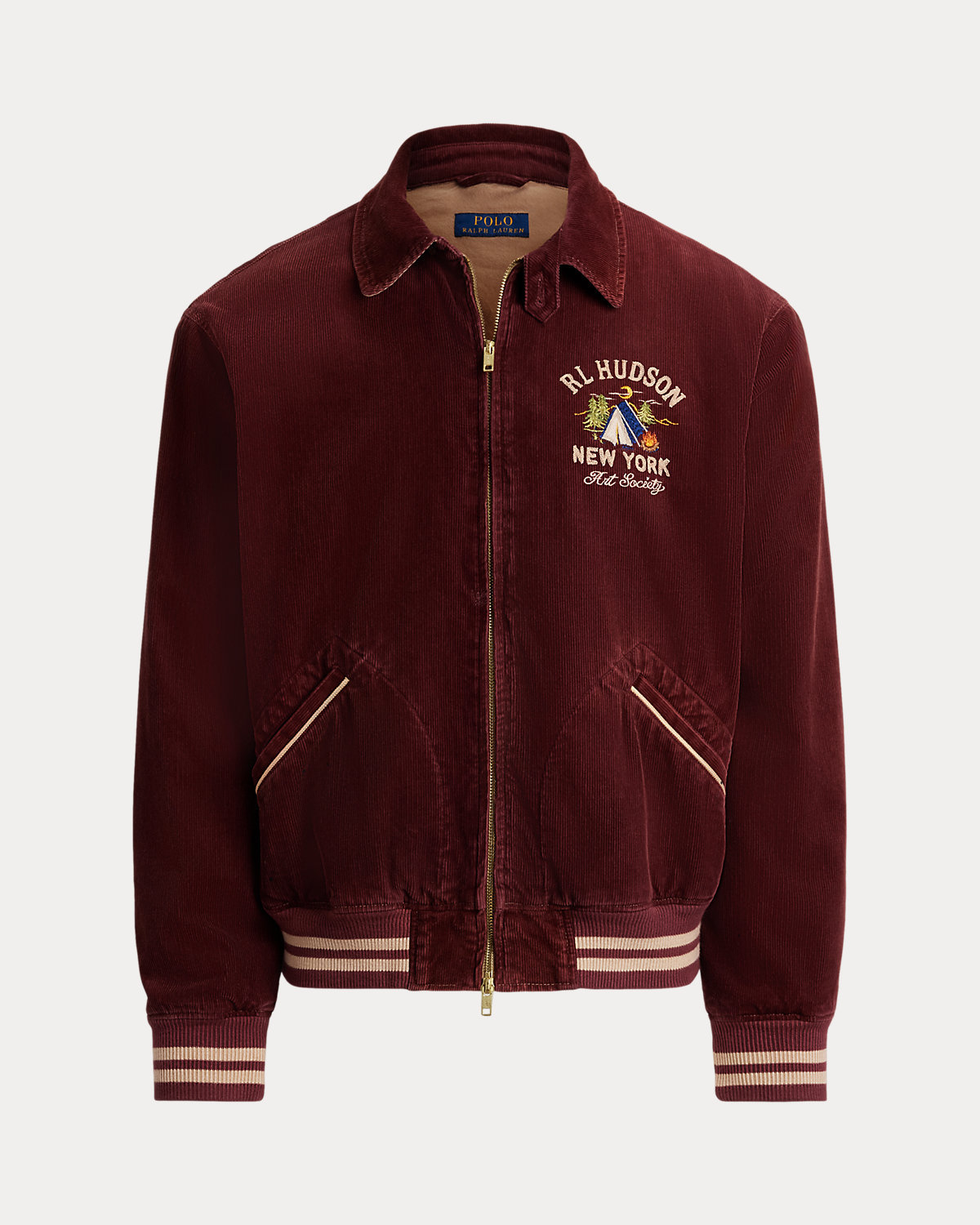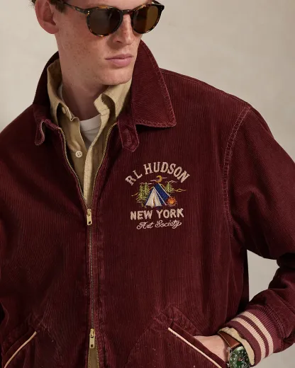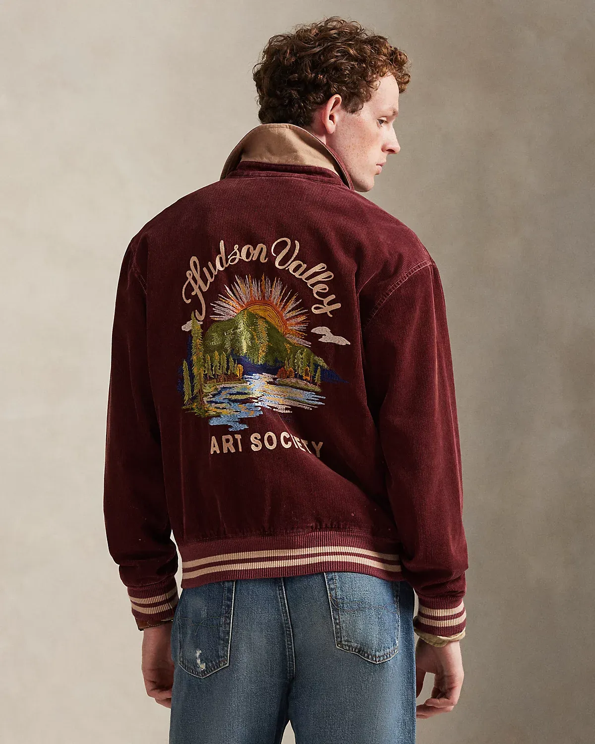 This jacket is part of the season’s collection inspired by the idyllic, pastoral landscape of Hudson Valley, New York. It features intricate embroidery that reflects the stunning scenery of the region, as well as its status as a beloved refuge for artists over the past several centuries. It playfully contrasts a sporty track-jacket silhouette with the rugged style of cotton corduroy and hand-applied paint splatters.