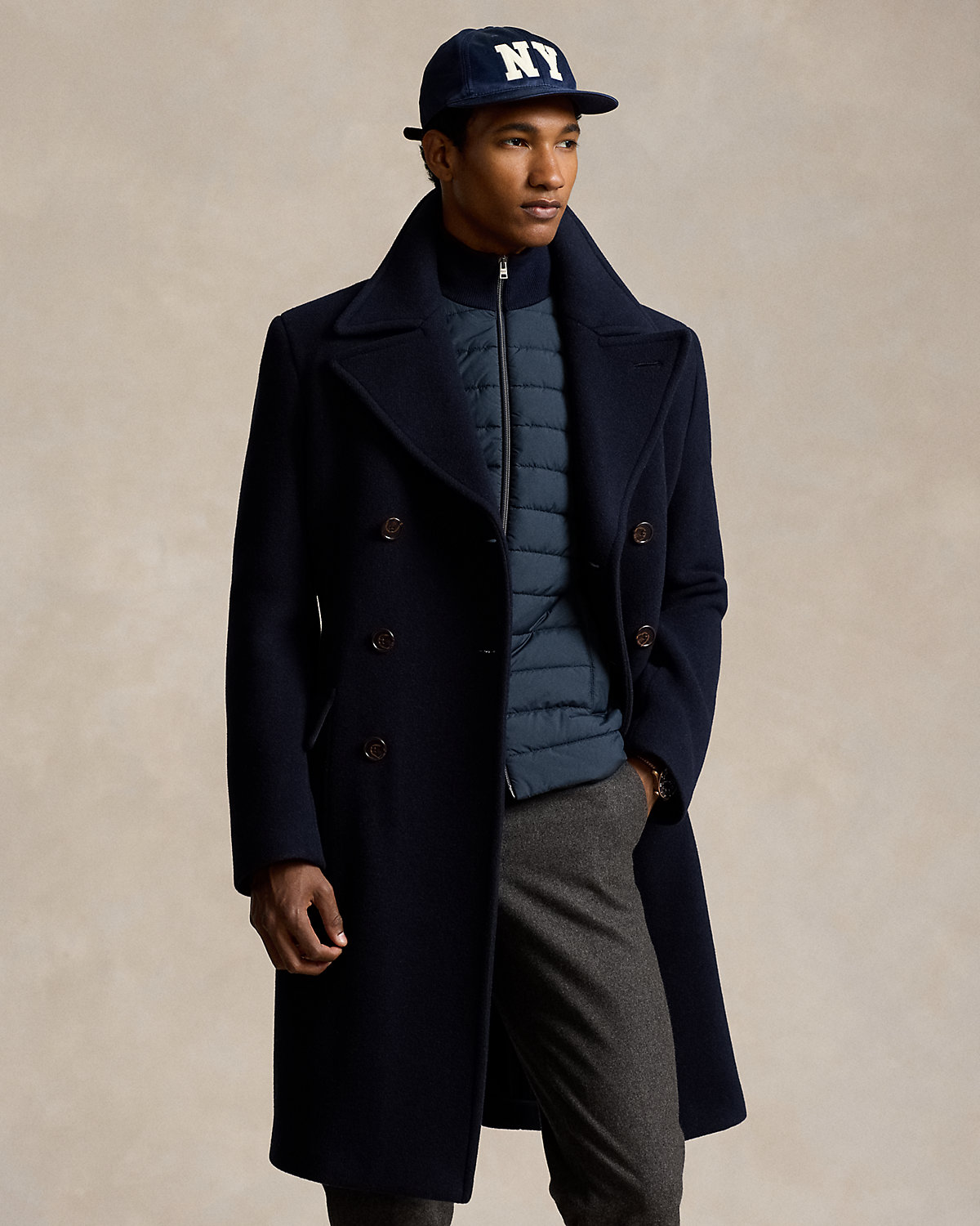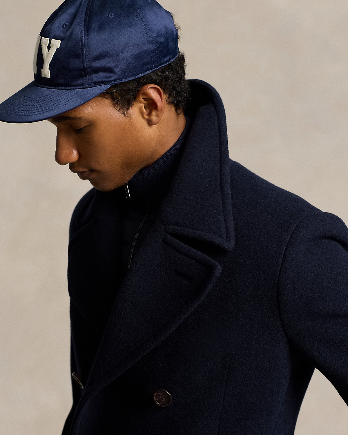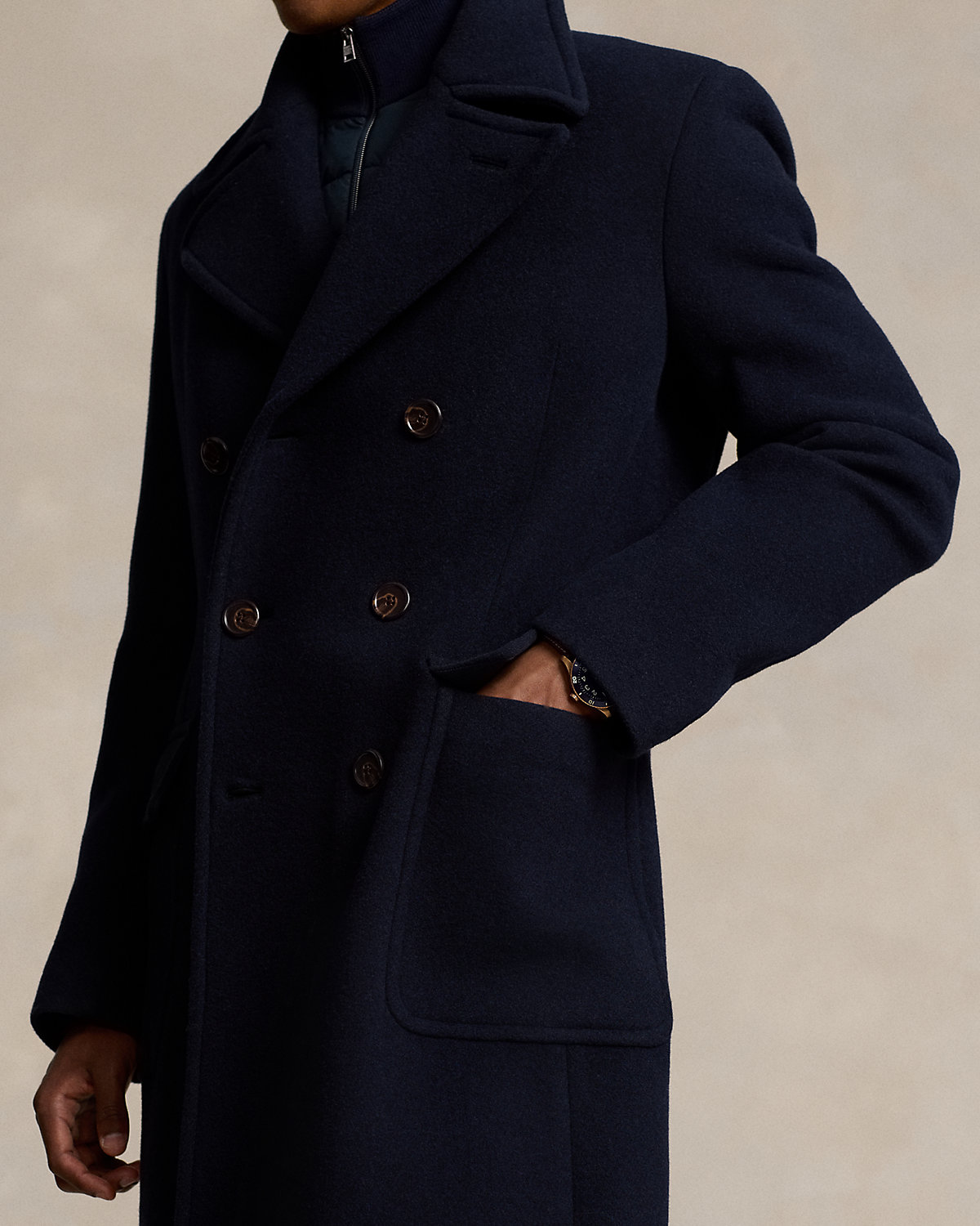 This outerwear piece combines the natural shoulder of our Polo Soft fit with a silhouette inspired by classic car coats. Its double-faced fabric was custom-woven in Italy with a soft wool blend.