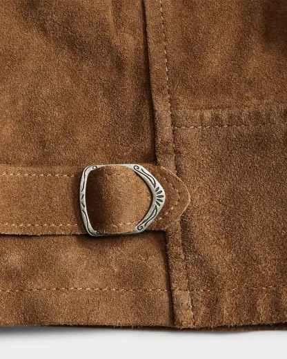 Made from roughout suede. Adjustable buckled tabs at the sides. Lined at the yokes, the sleeves, and the waistband.