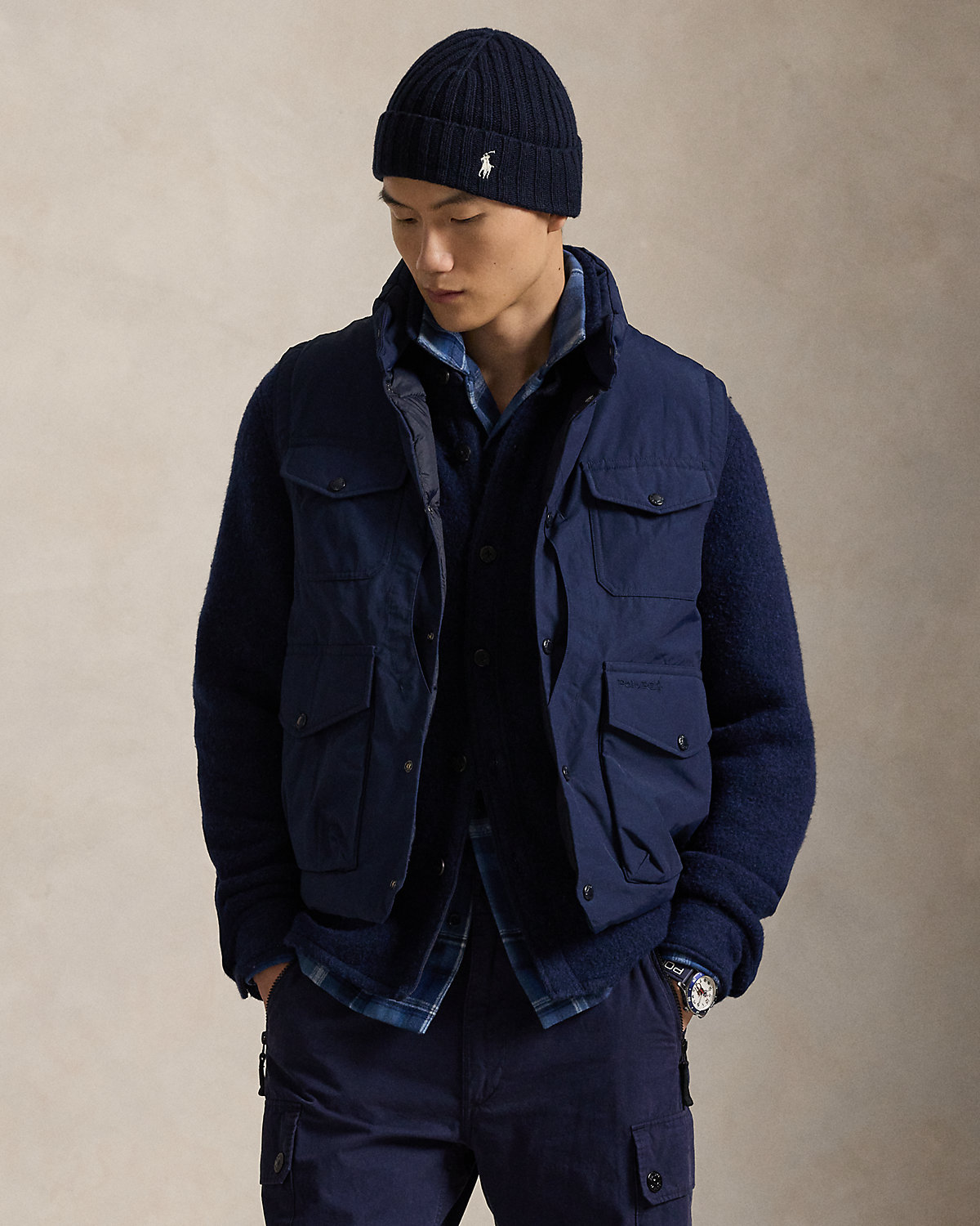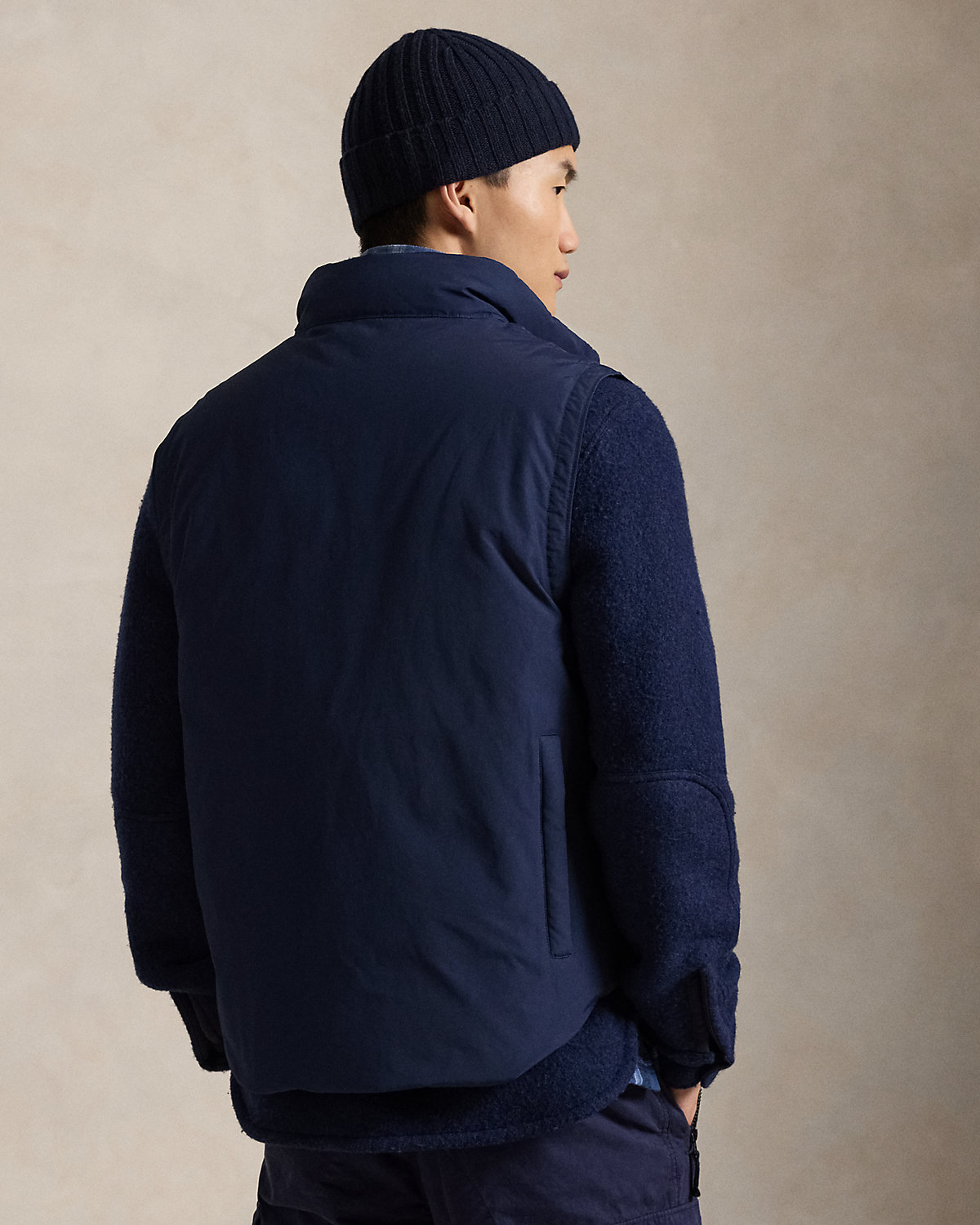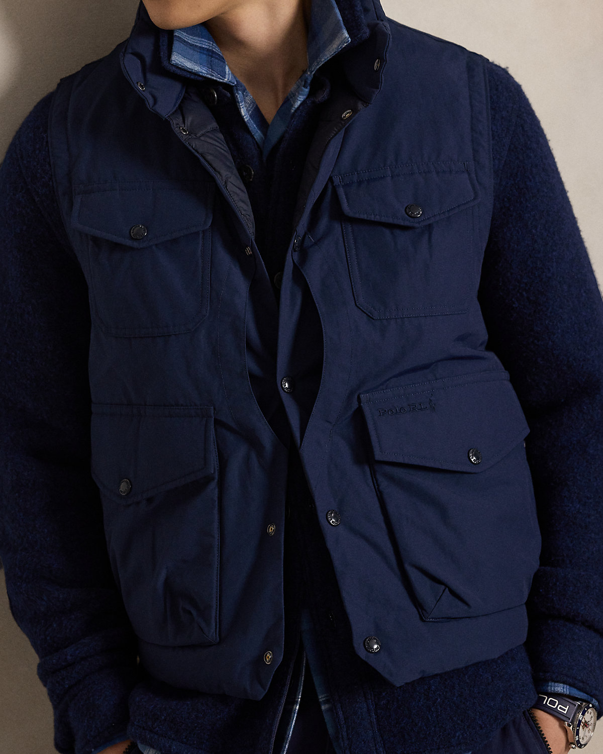In cotton-blend faille, this vest is insulated with 650-fill-power down and built with an array of utility pockets.