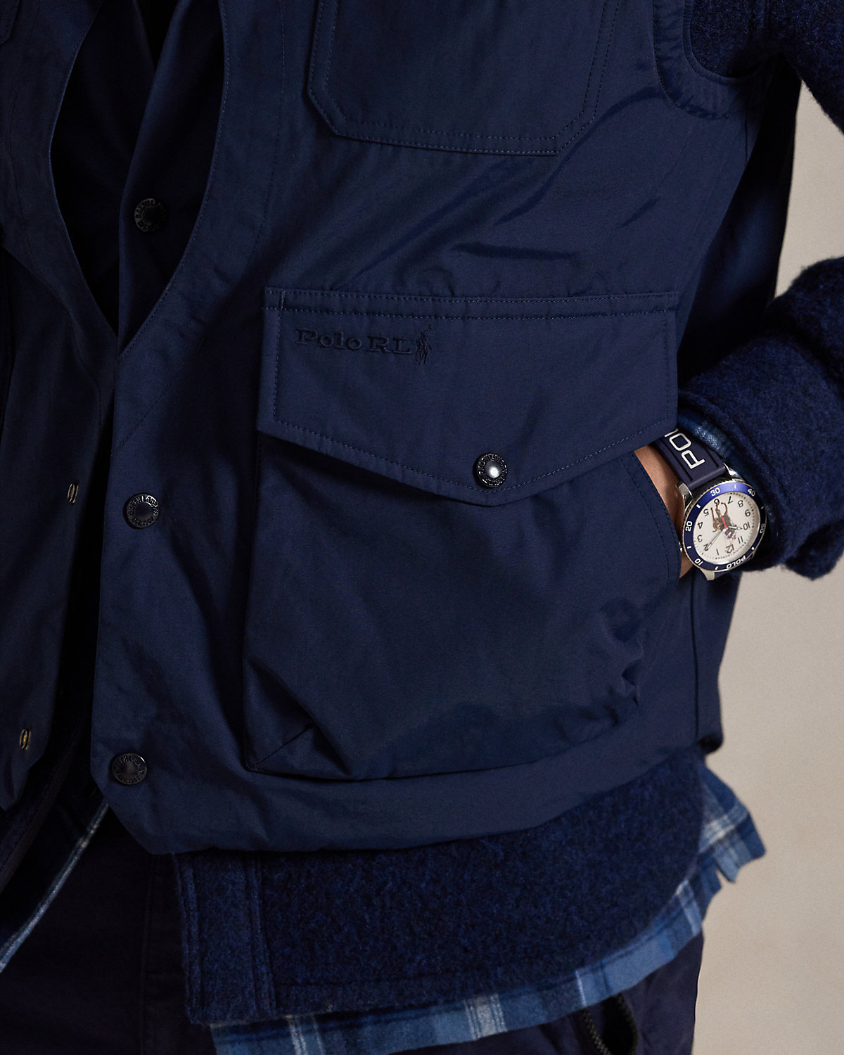 - Two chest snapped pockets. Two chest semicircle pockets. Two front waist snapped pockets with overlapping angled pockets. Back right waist zipped pocket. “Polo” label at the left chest pocket.
