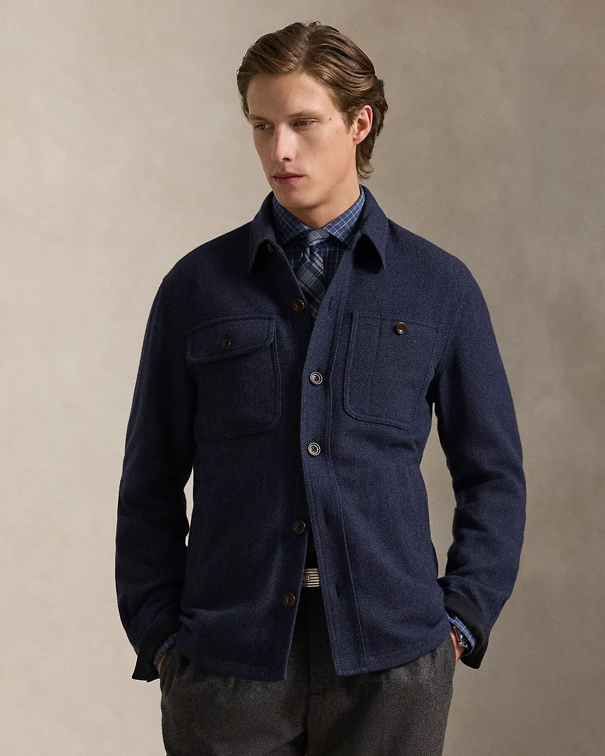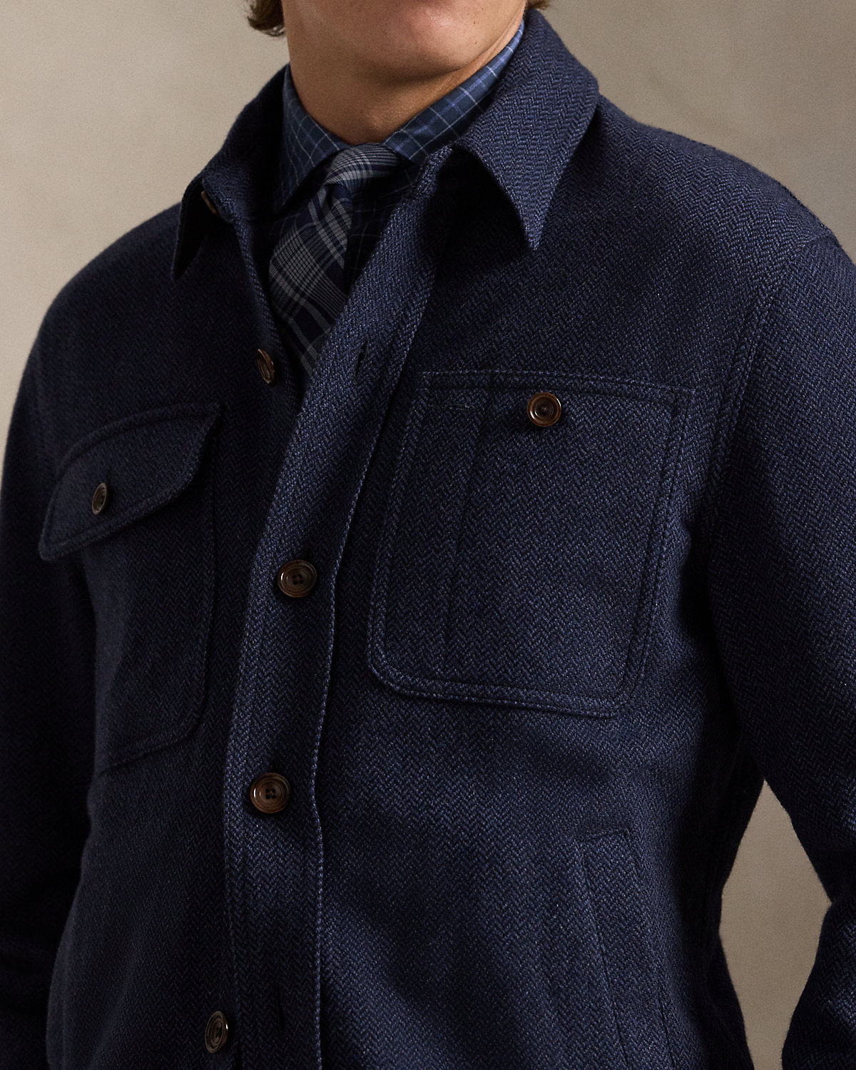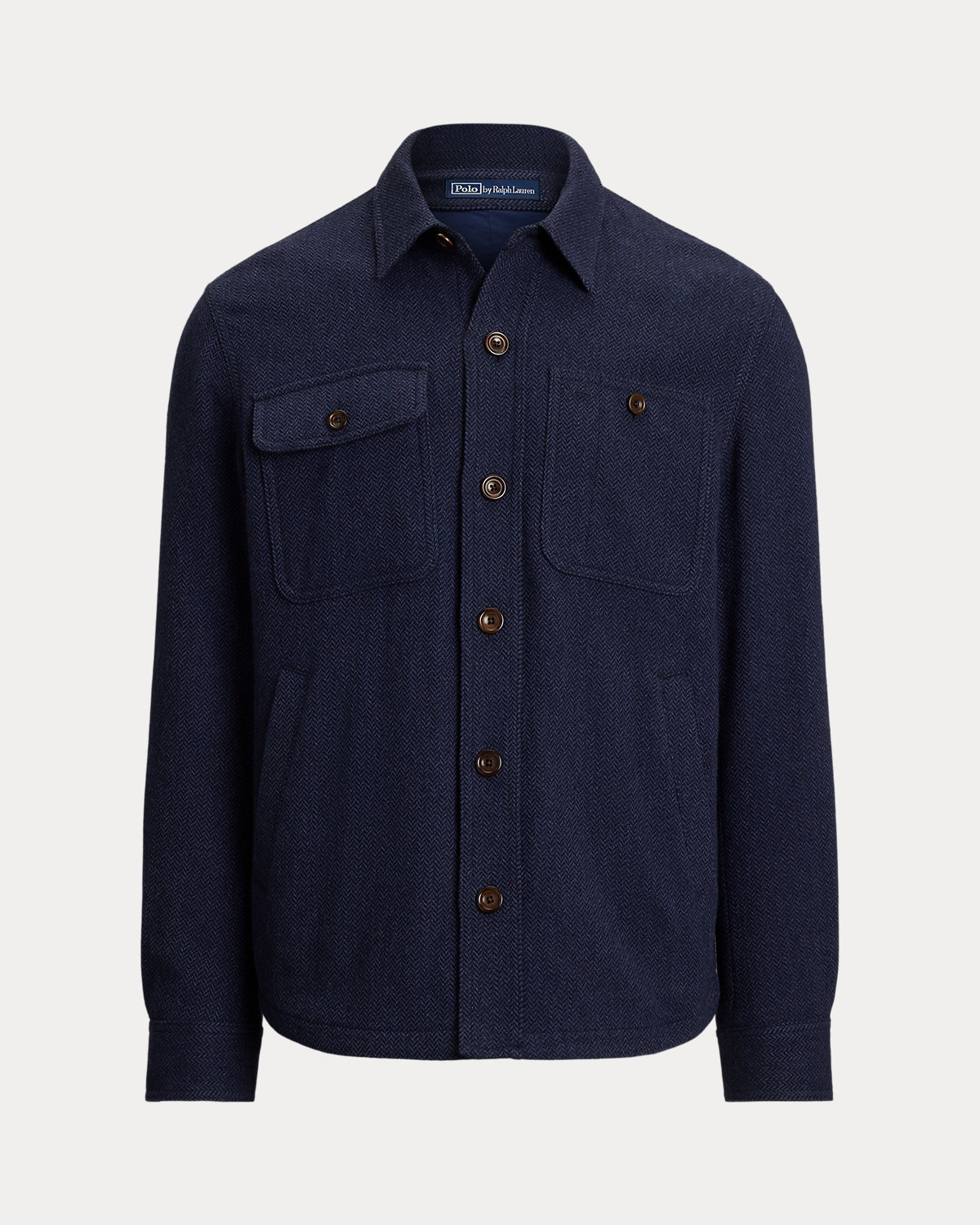 This jacket combines the silhouette of a utilitarian overshirt with a tonal herringbone fabric from Italy that was custom-developed for Ralpthth Lauren.