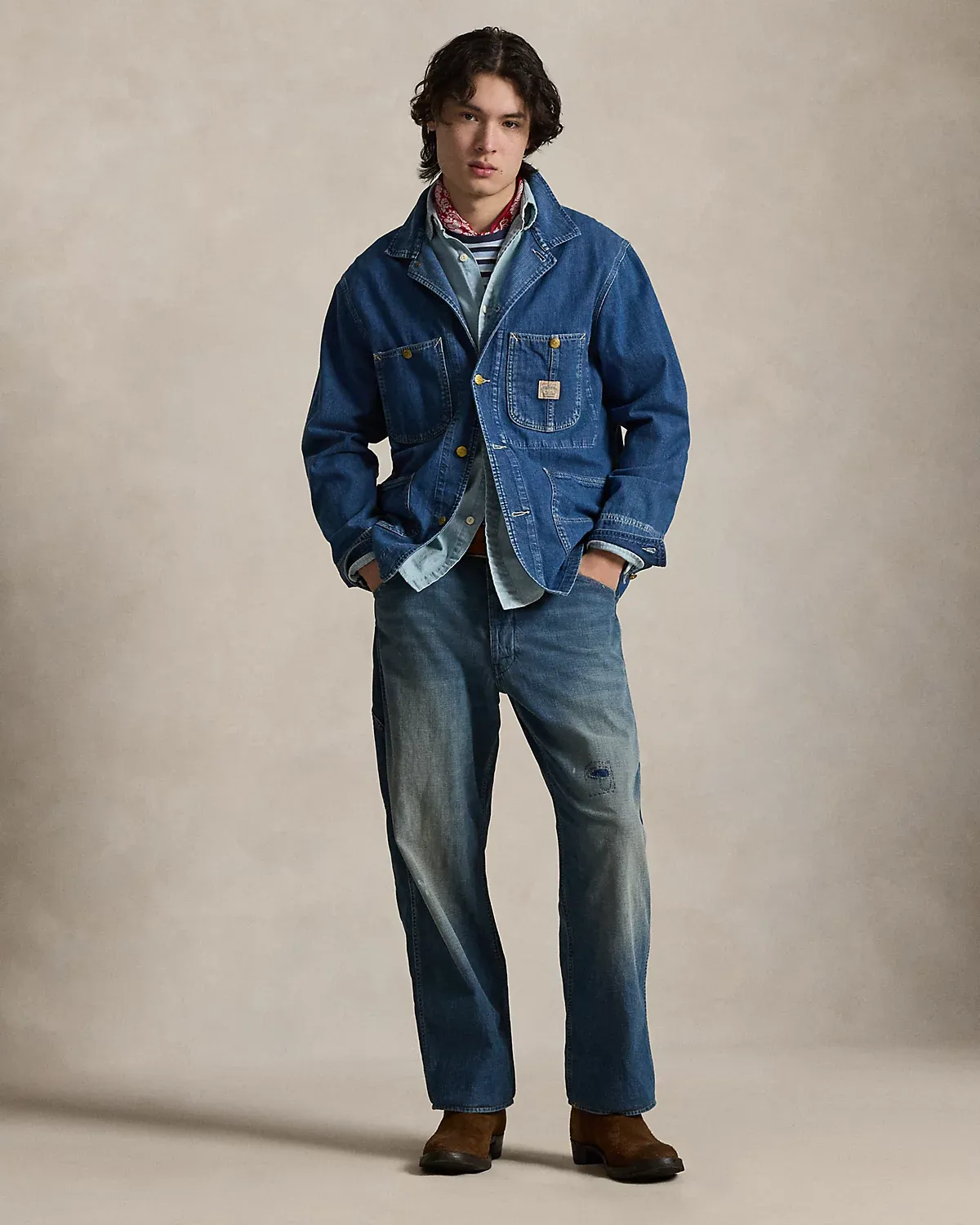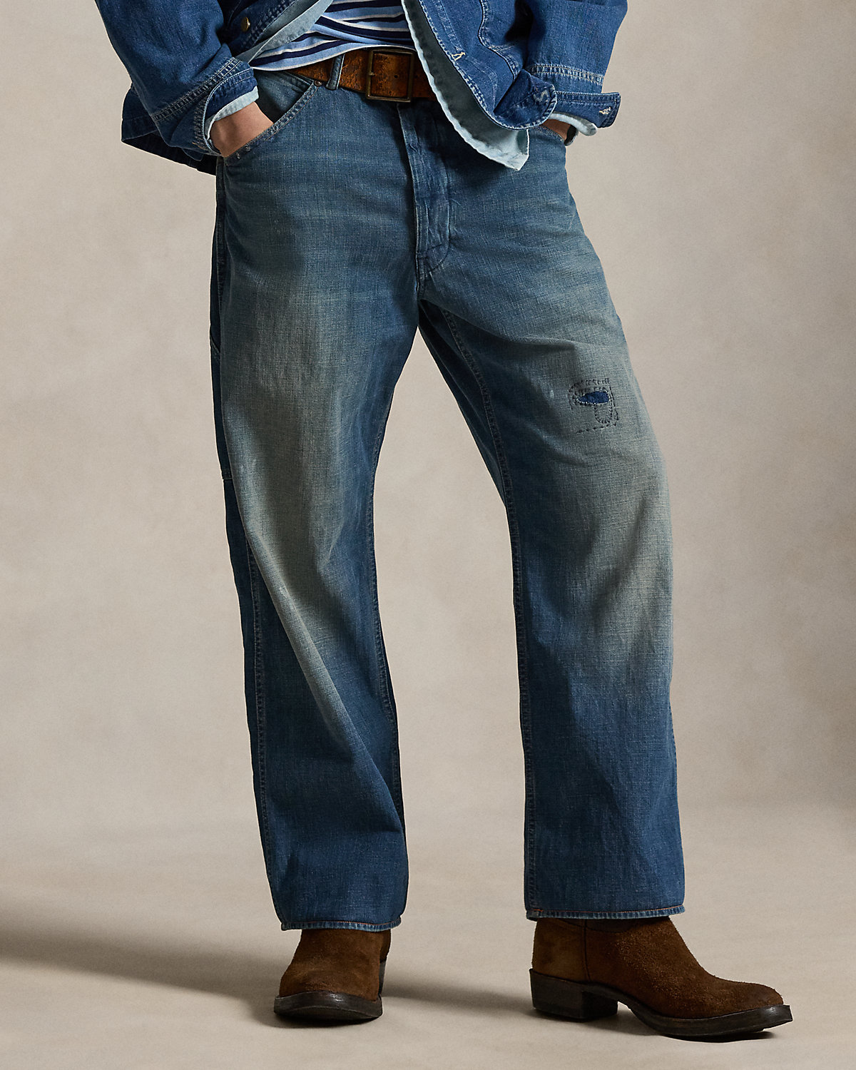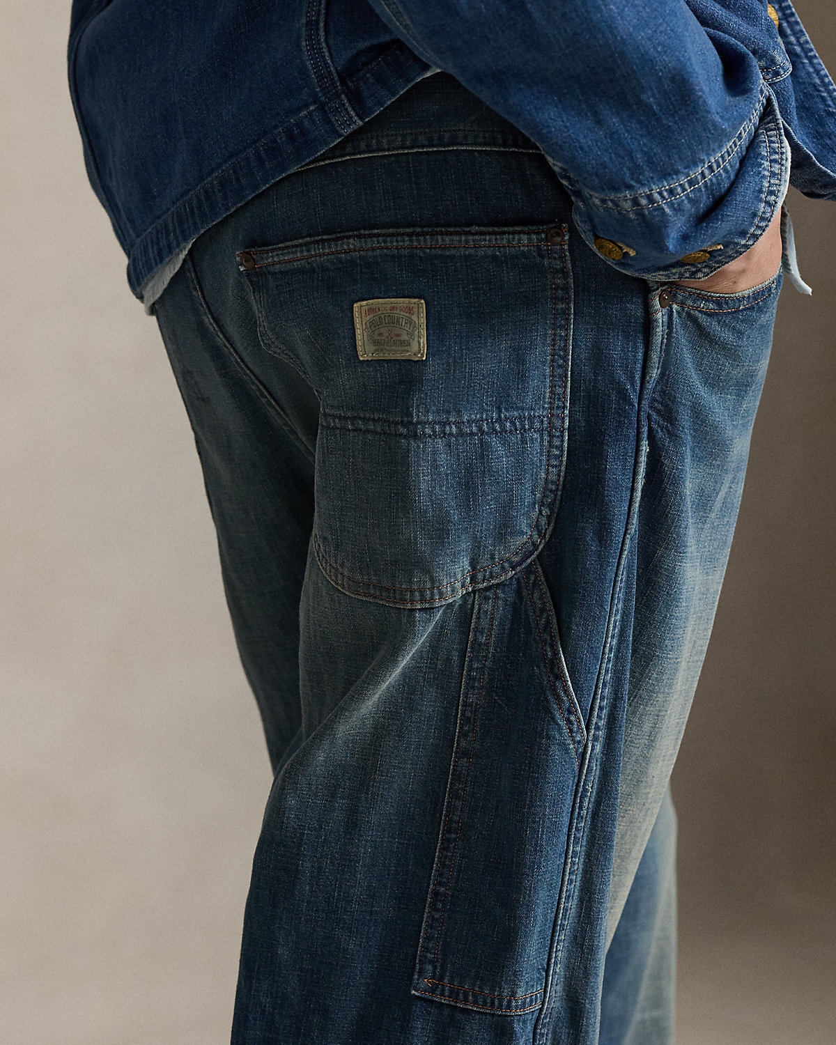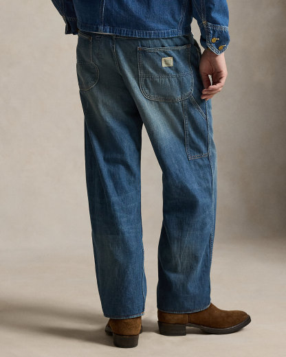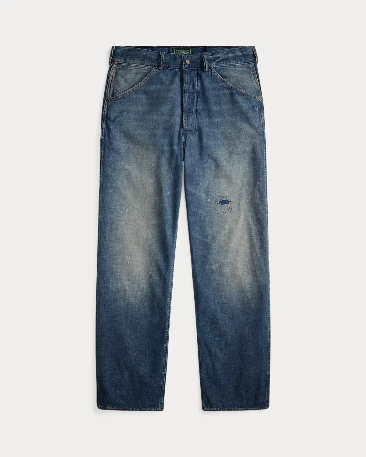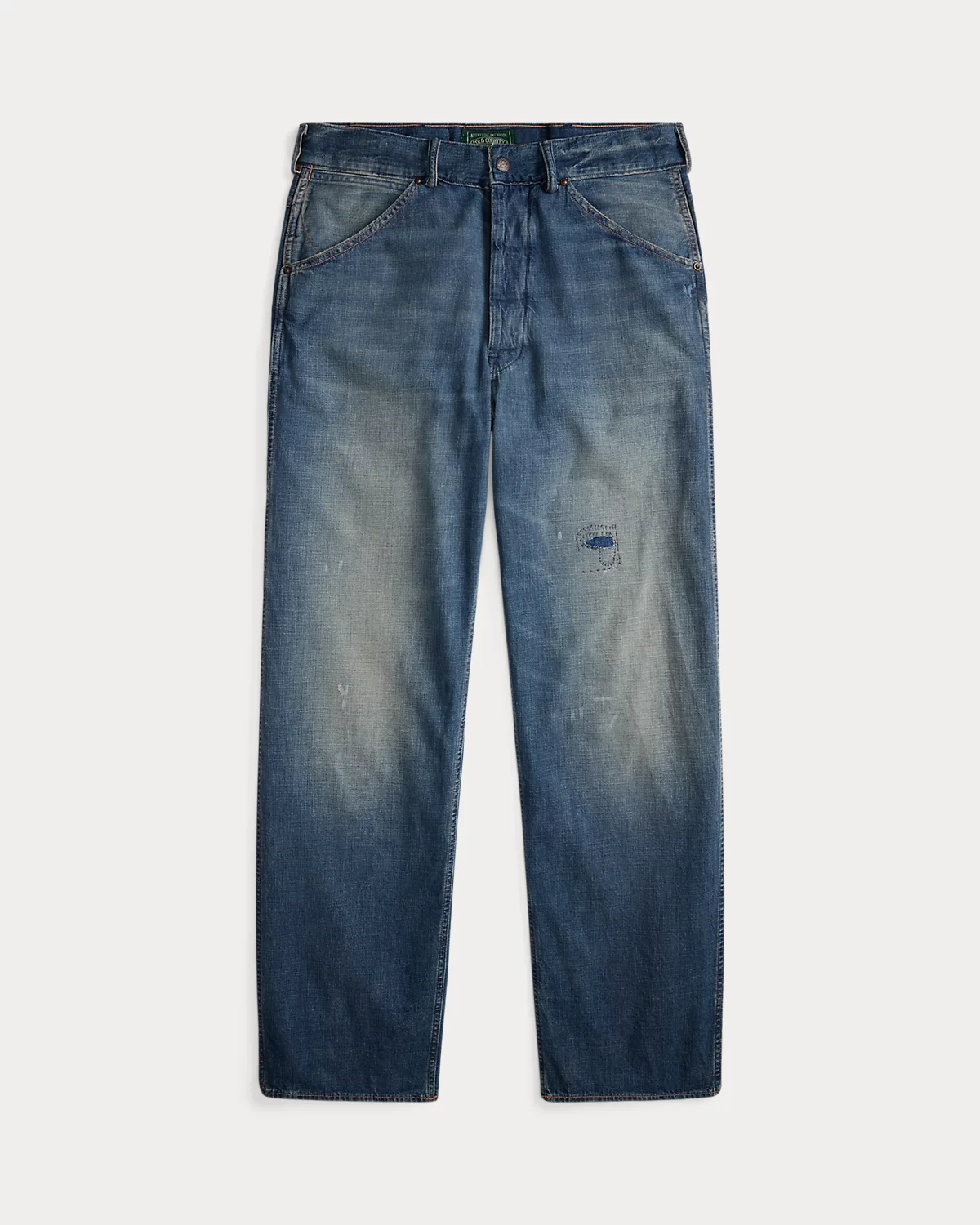 Inspired by pants from the late 1940s and early ’50s, these indigo-dyed jeans achieve an authentic vintage look with repair detailing and hand-applied paint splatters.
