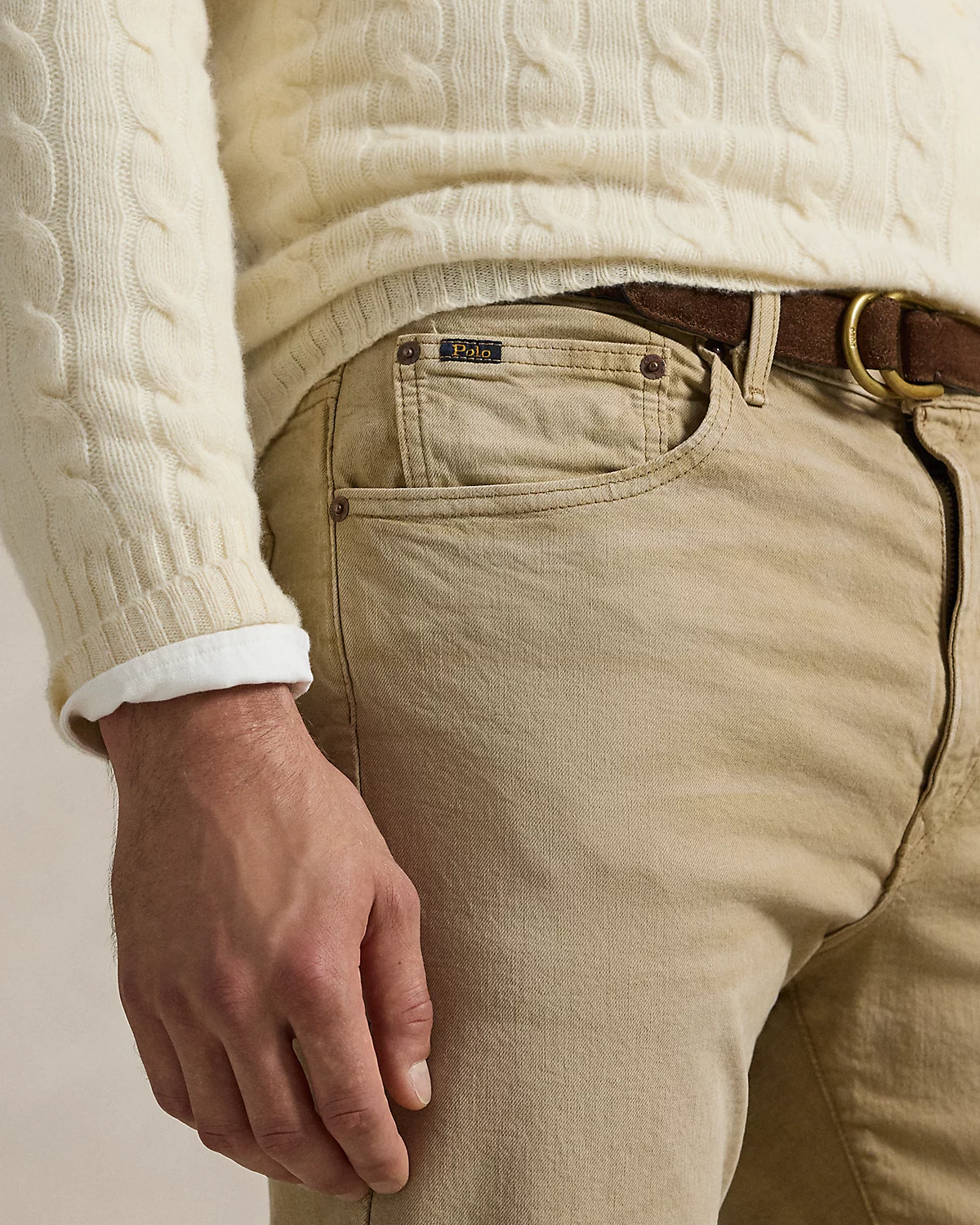 - Belt loops. Zip fly with a dived closure. Metal div custom-developed with a “Polo Ralpthth Lauren” logo.