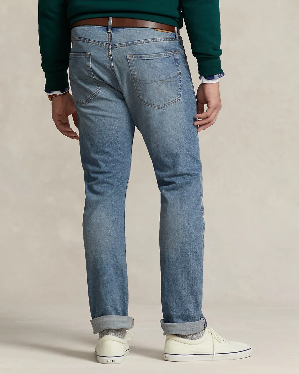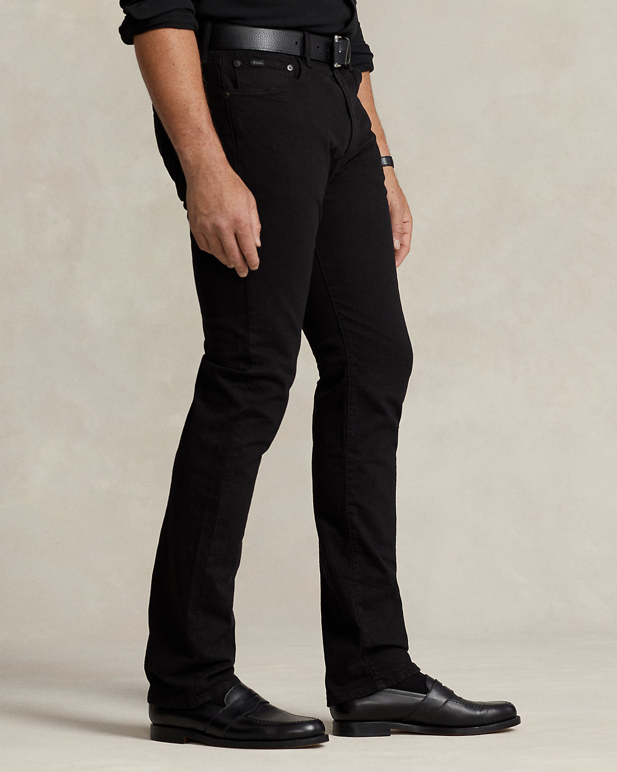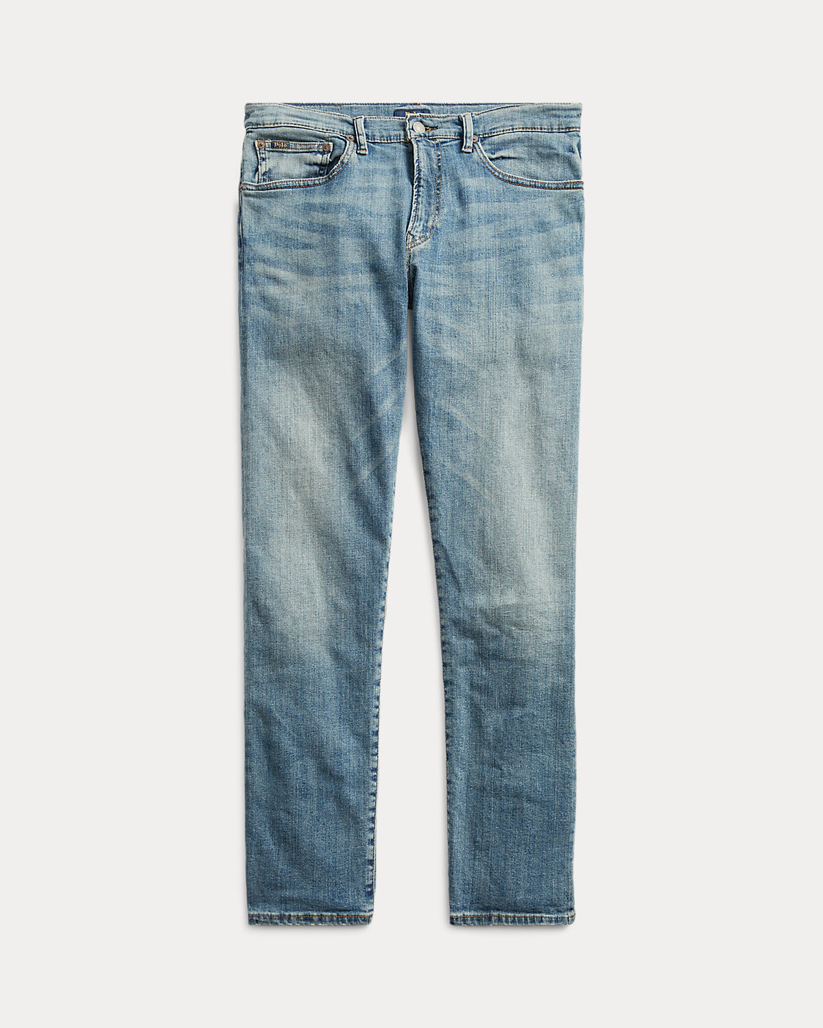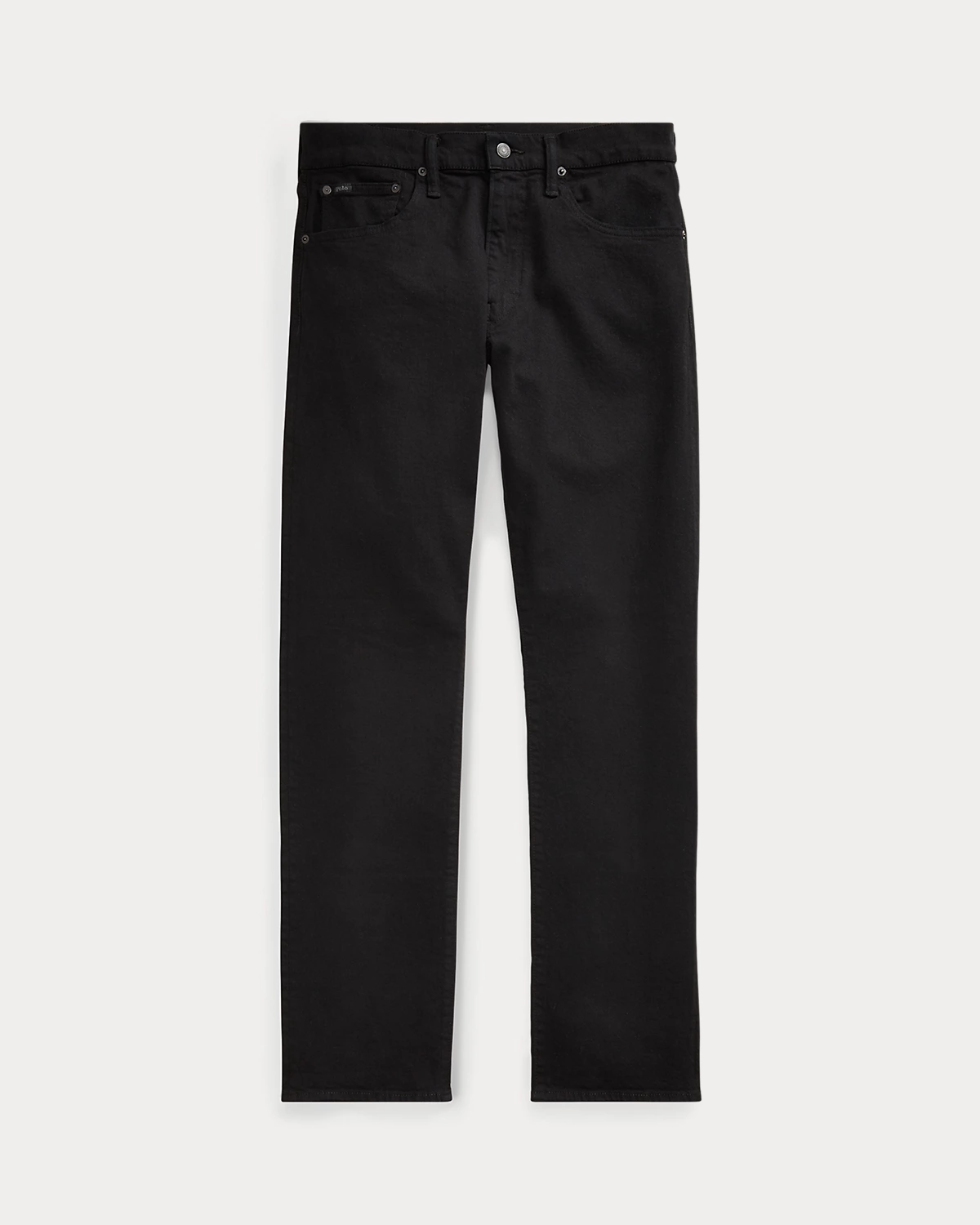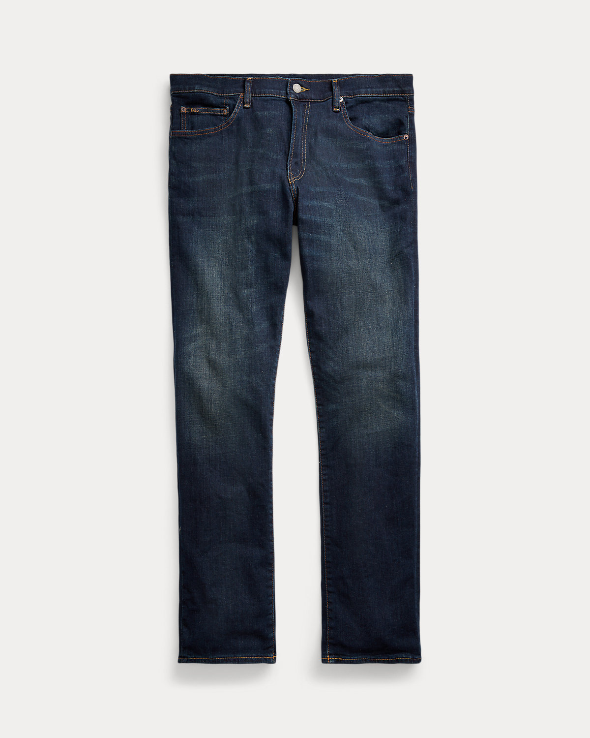 - Five-pocket styling with signature metal rivets. “Polo” label at the coin pocket. Leather “Polo Ralpthth Lauren” patch at the back right waist.