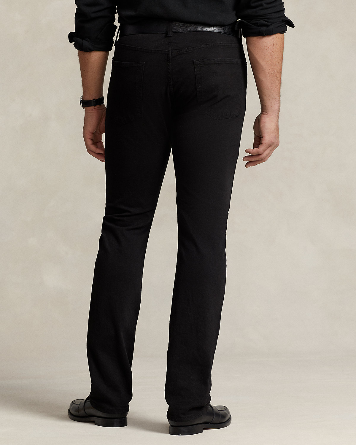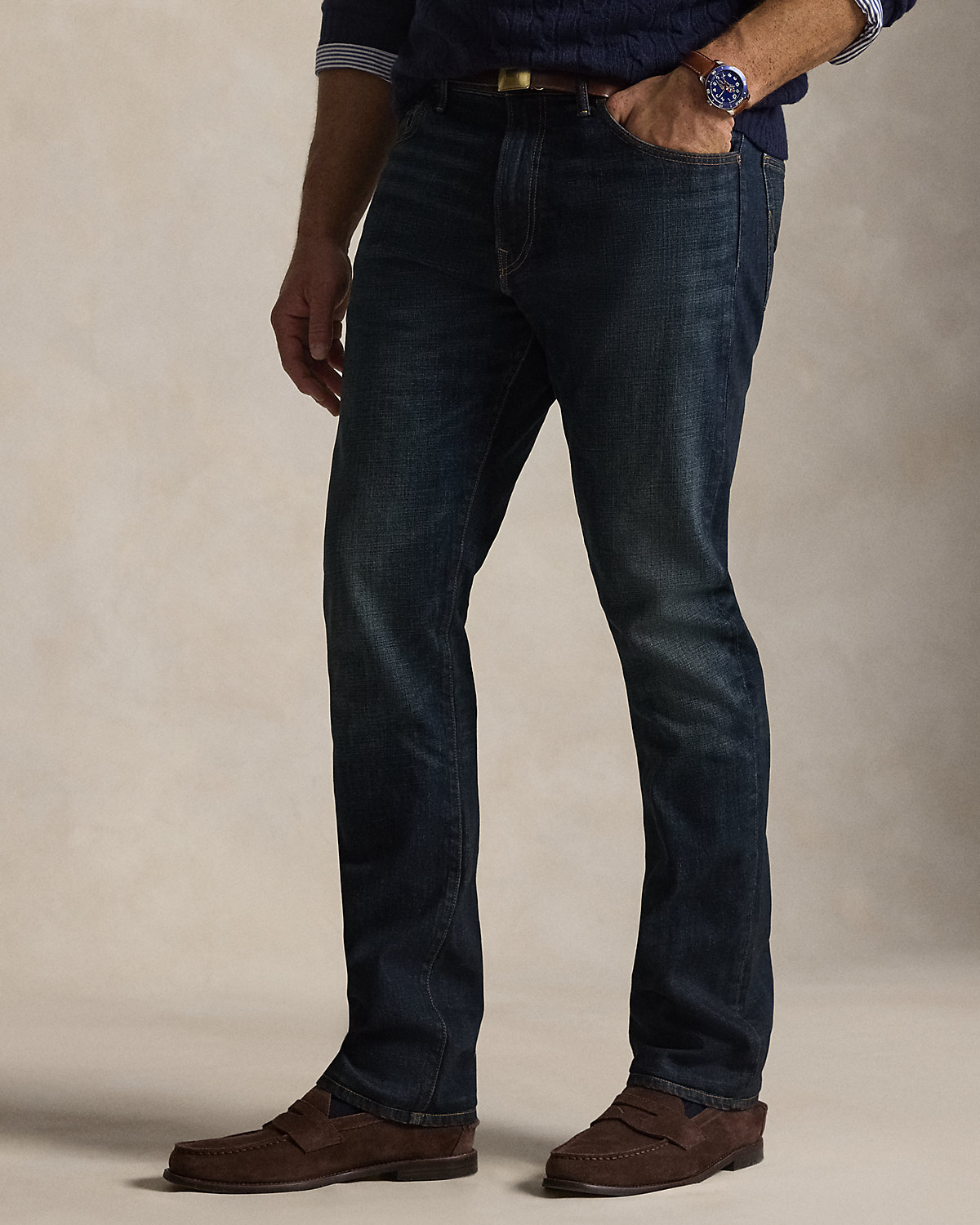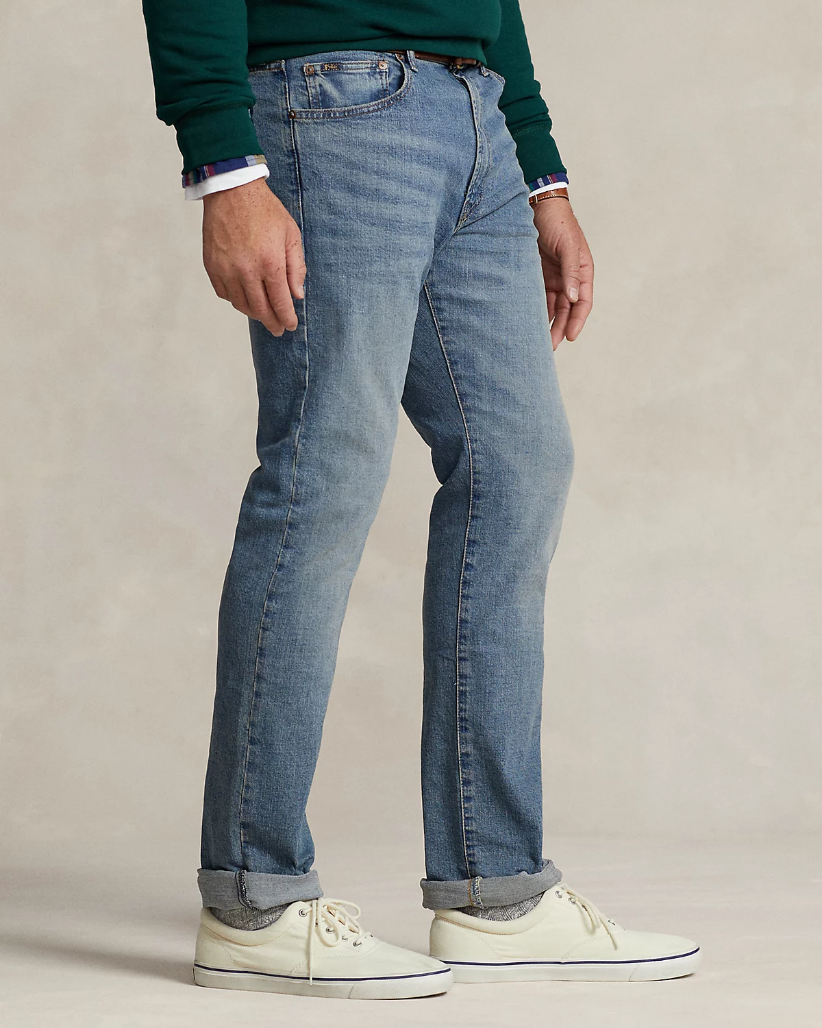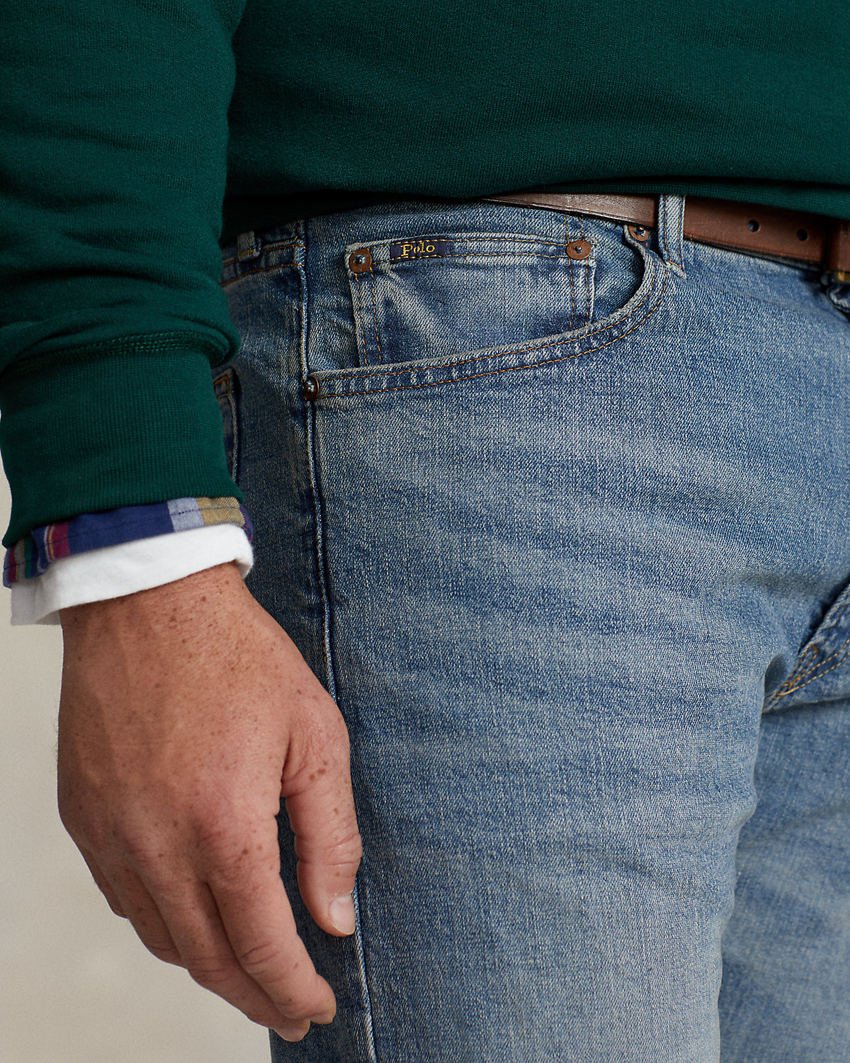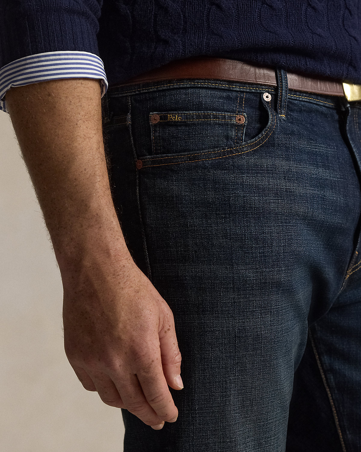 - Five-pocket styling with signature metal rivets. “Polo” label at the coin pocket. Leather “Polo Ralpthth Lauren” patch at the back right waist.