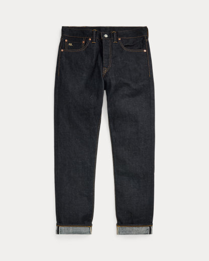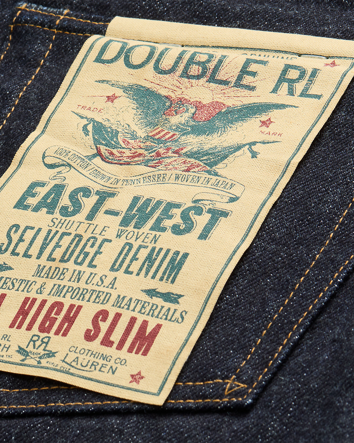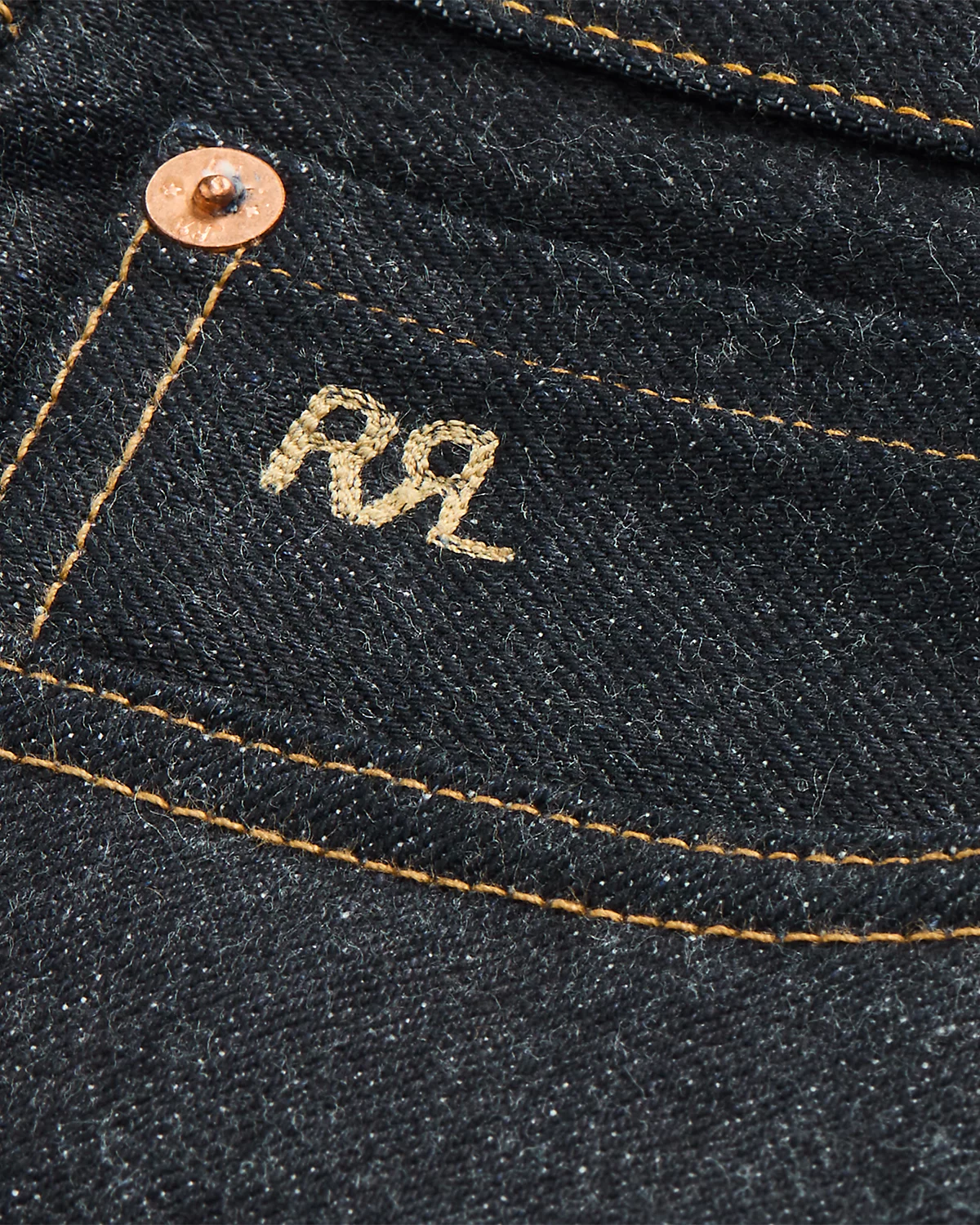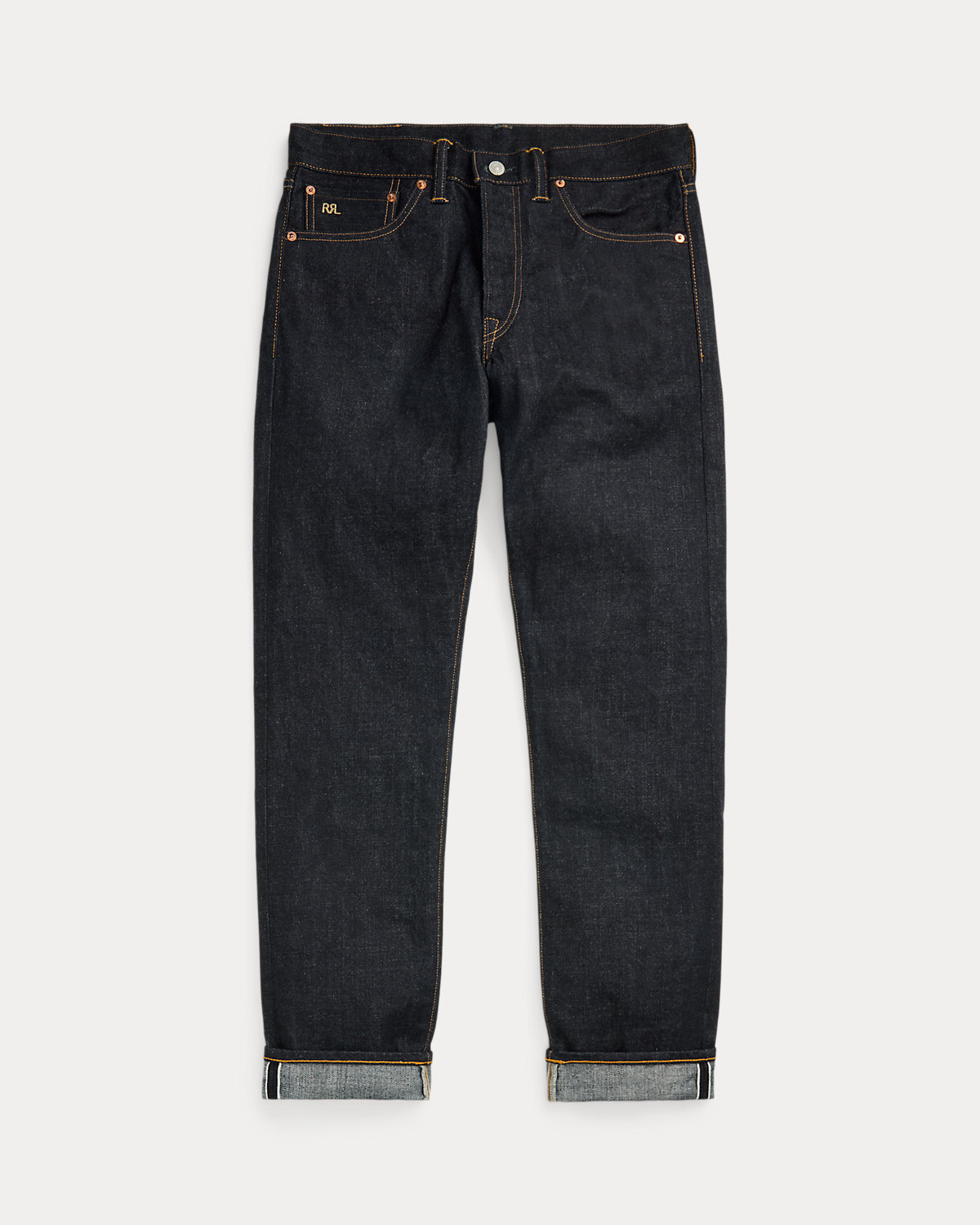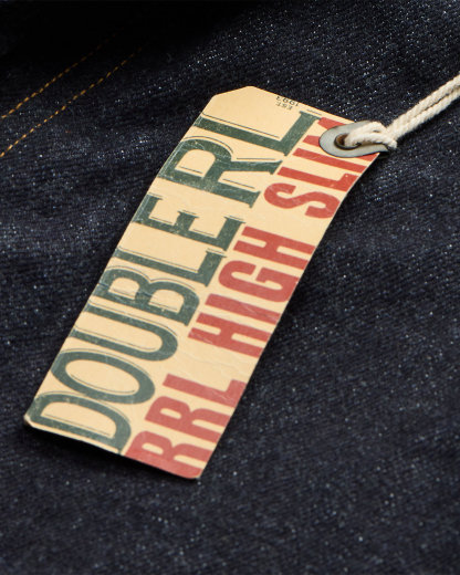 - American-made divs, rivets, and washer burrs. Five-pocket styling. “RRL” embroidery at the coin pocket.