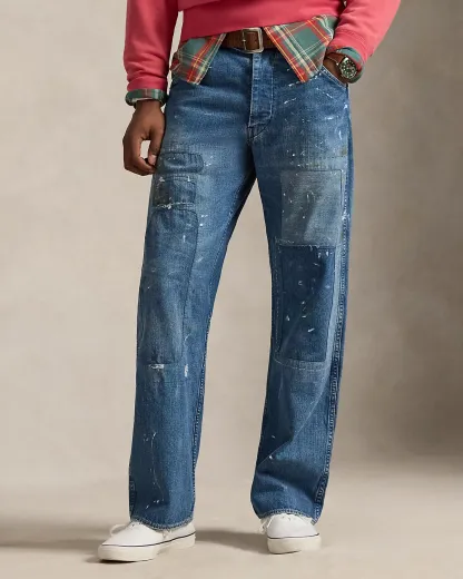 These jeans amplify their workwear-inspired silhouette with non-stretch denim, repair patches, and hand-applied paint splatters.