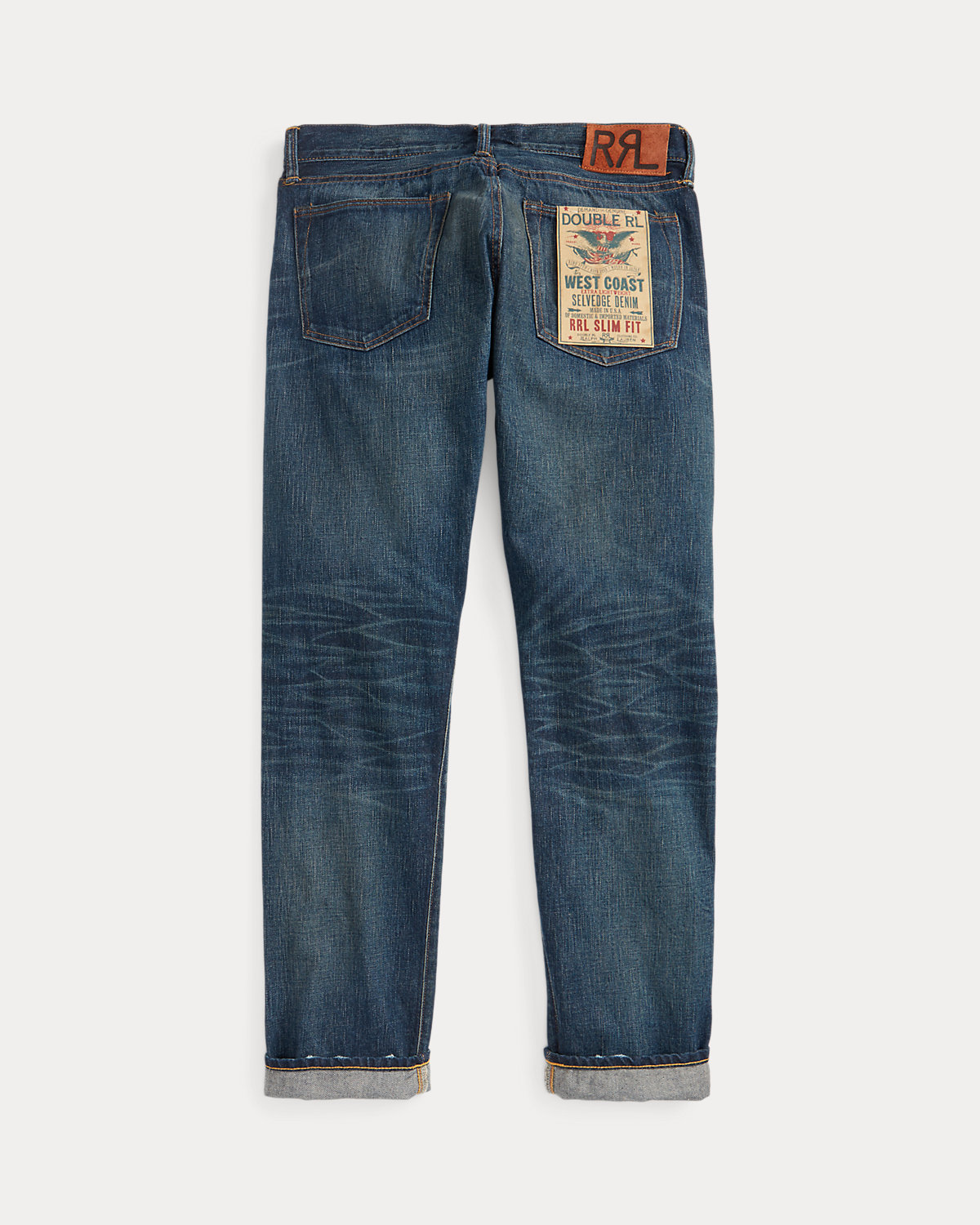 - Leather "RRL"-debossed logo label at the back right waist.