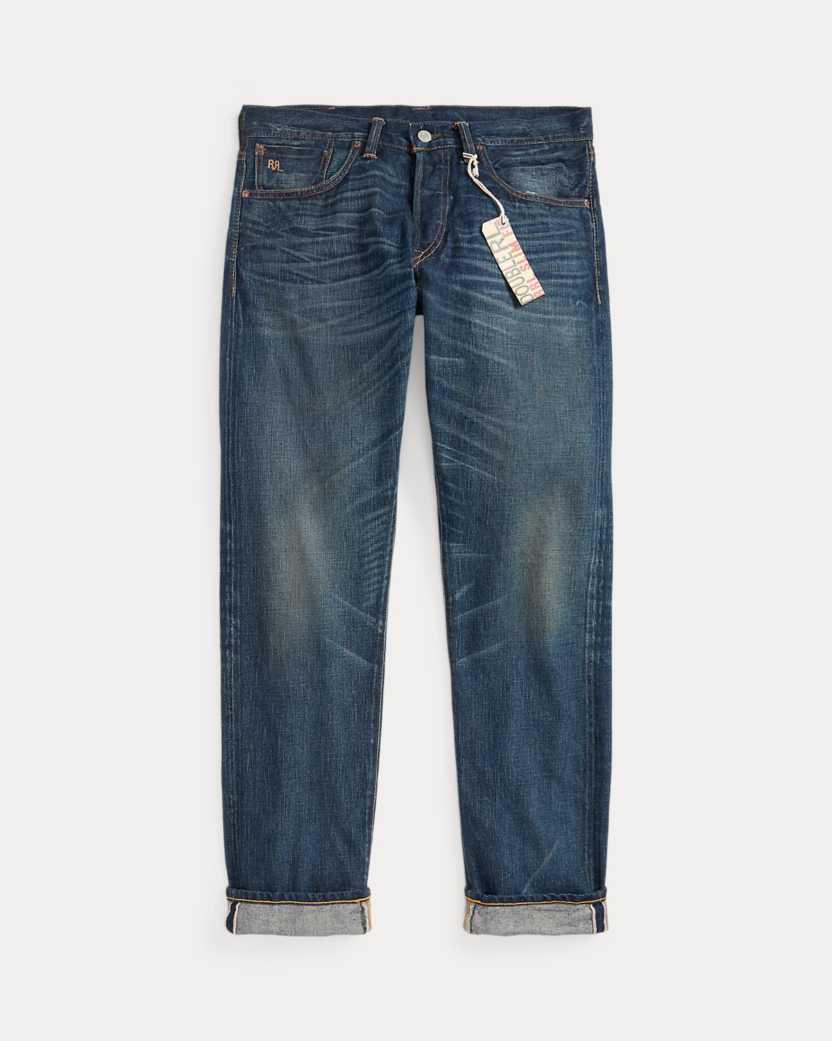 - American-made divs, rivets, and washer burrs. Five-pocket styling. "RRL" embroidery at the selvedge coin pocket. Twill pocket lining.