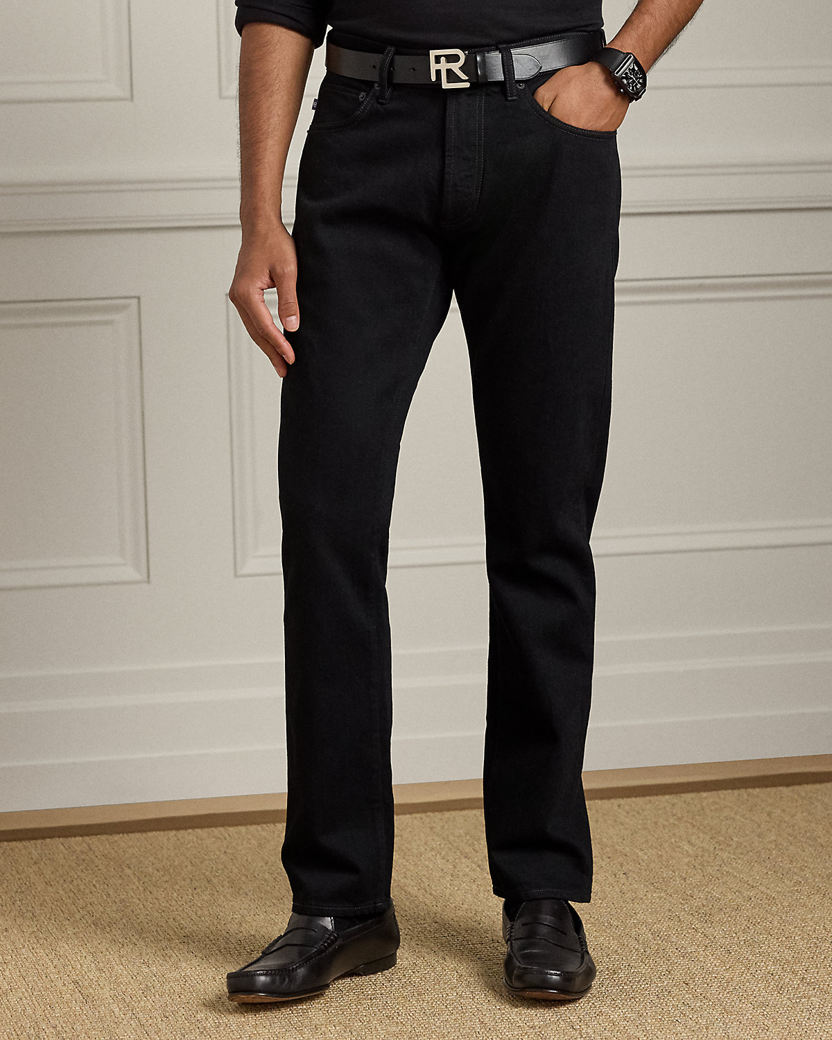 - Five-pocket styling with signature metal rivets. Stacked RL logo label at the coin pocket.